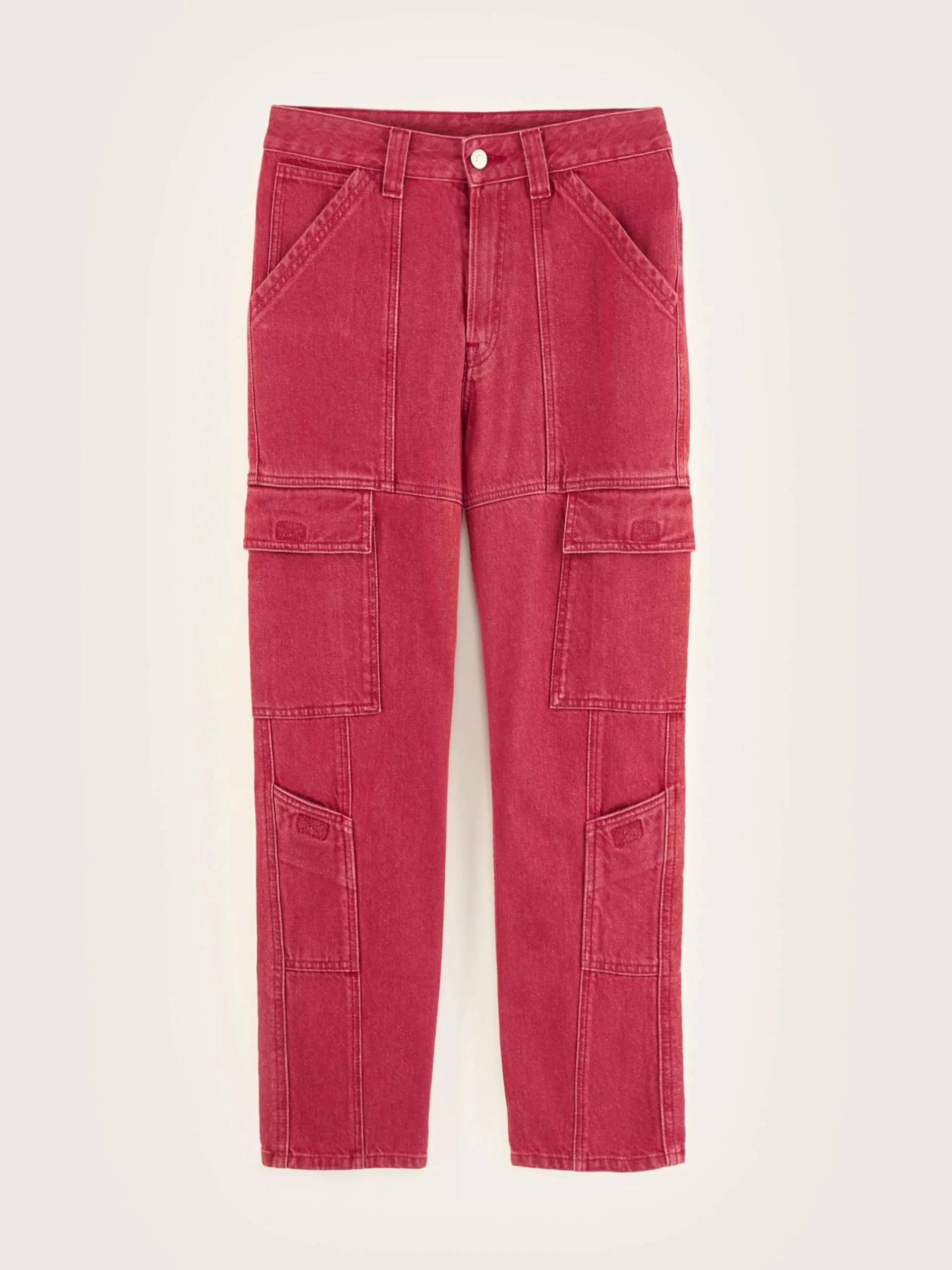 Aansluitende, wijnrode high-waist cargobroek met extra zakken.