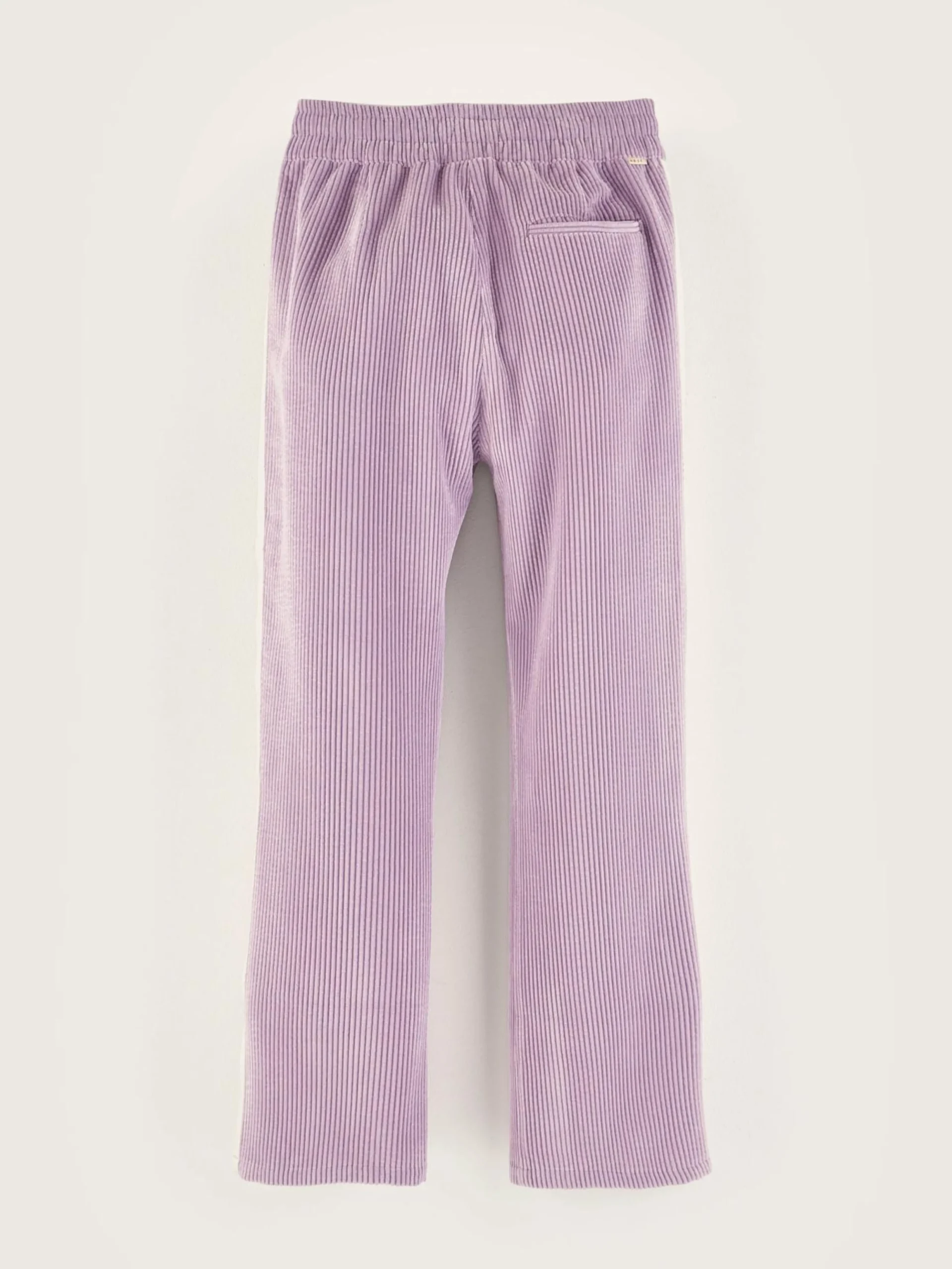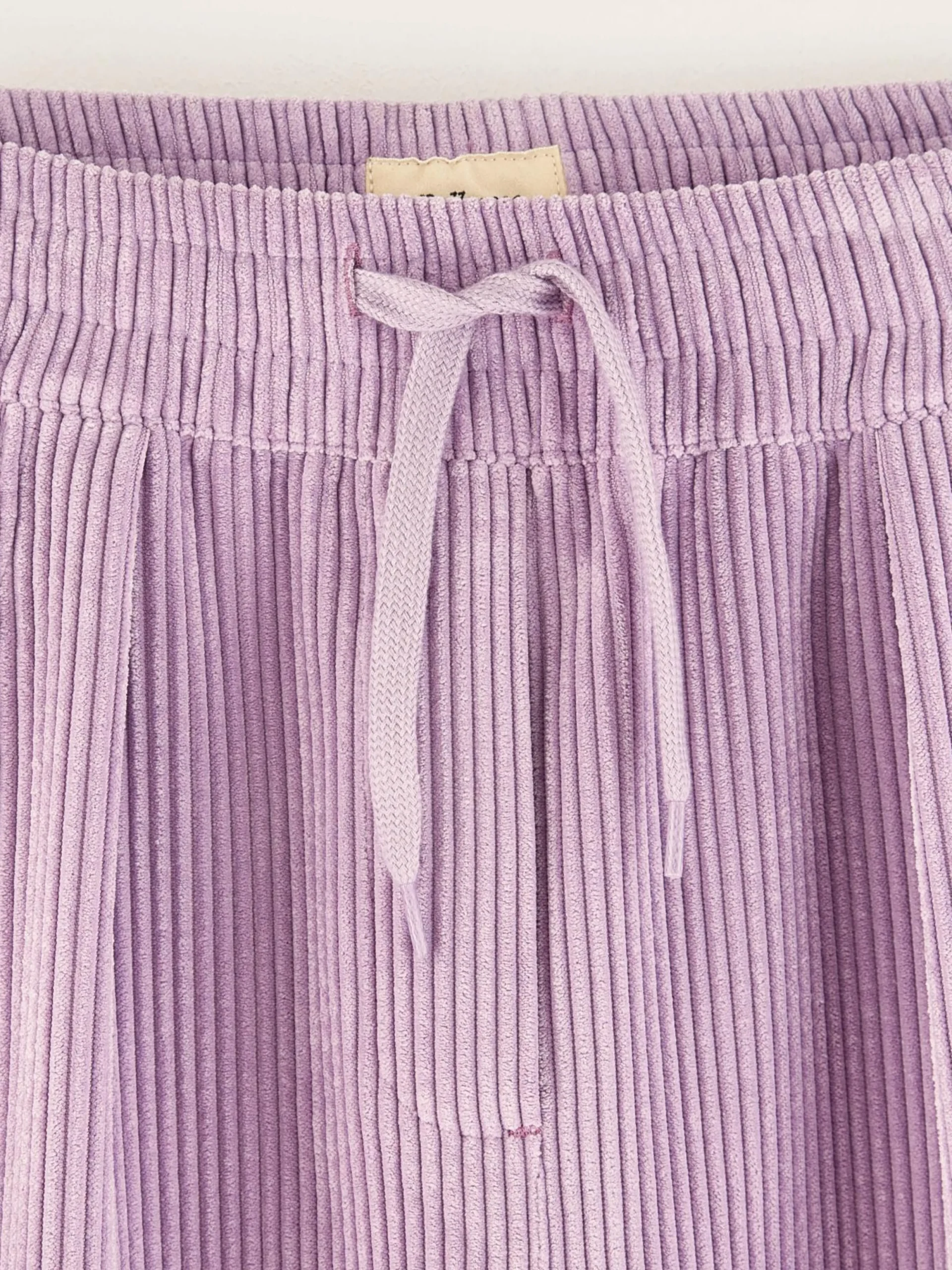 Lavendelkleurige, sportieve broek met hoge taille, van corduroy met brede rib.