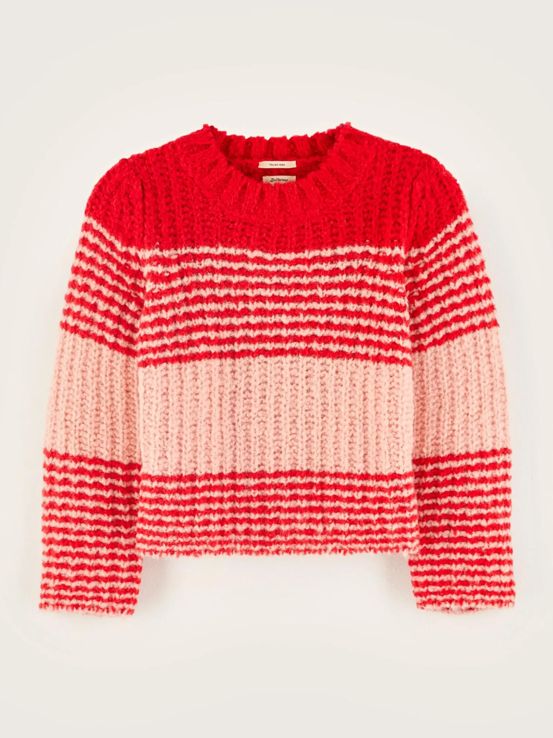 Losse averecht gebreide trui met rode strepen.