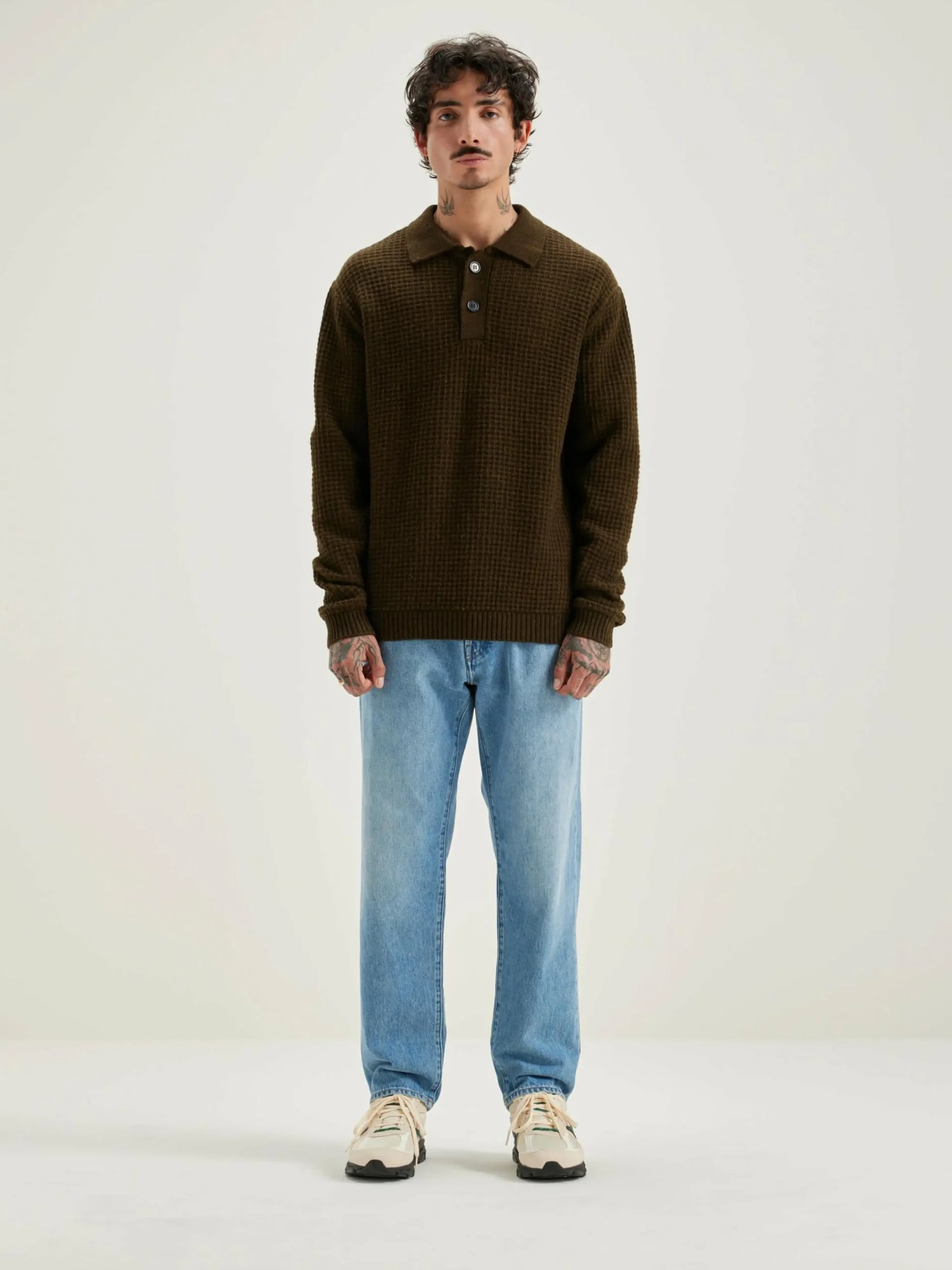 Comfortabele sweater in polostijl, van wafeltricot met olijfgroene wol.