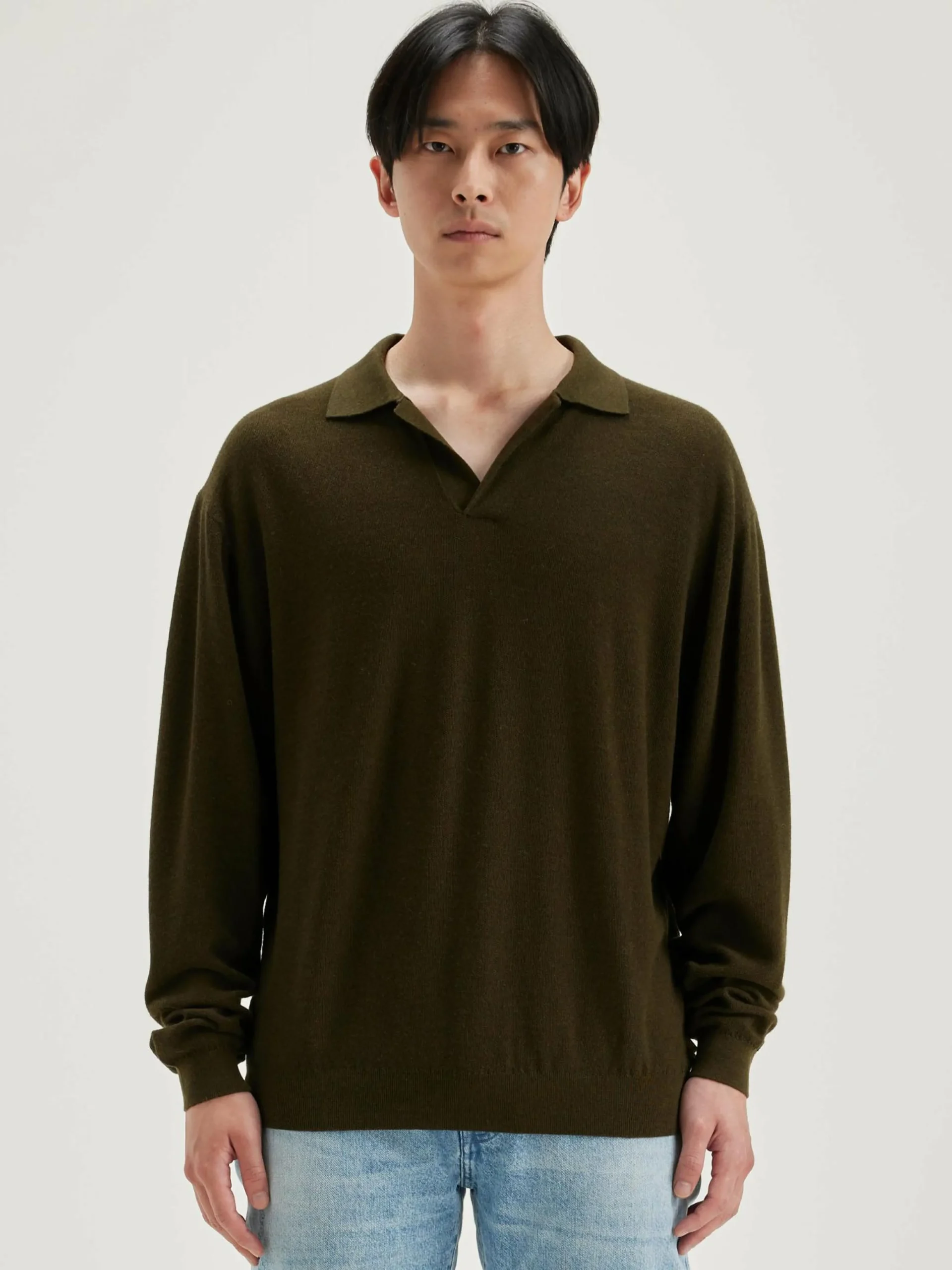 Comfortabele sweater in polostijl, van olijfgroene merinowol.