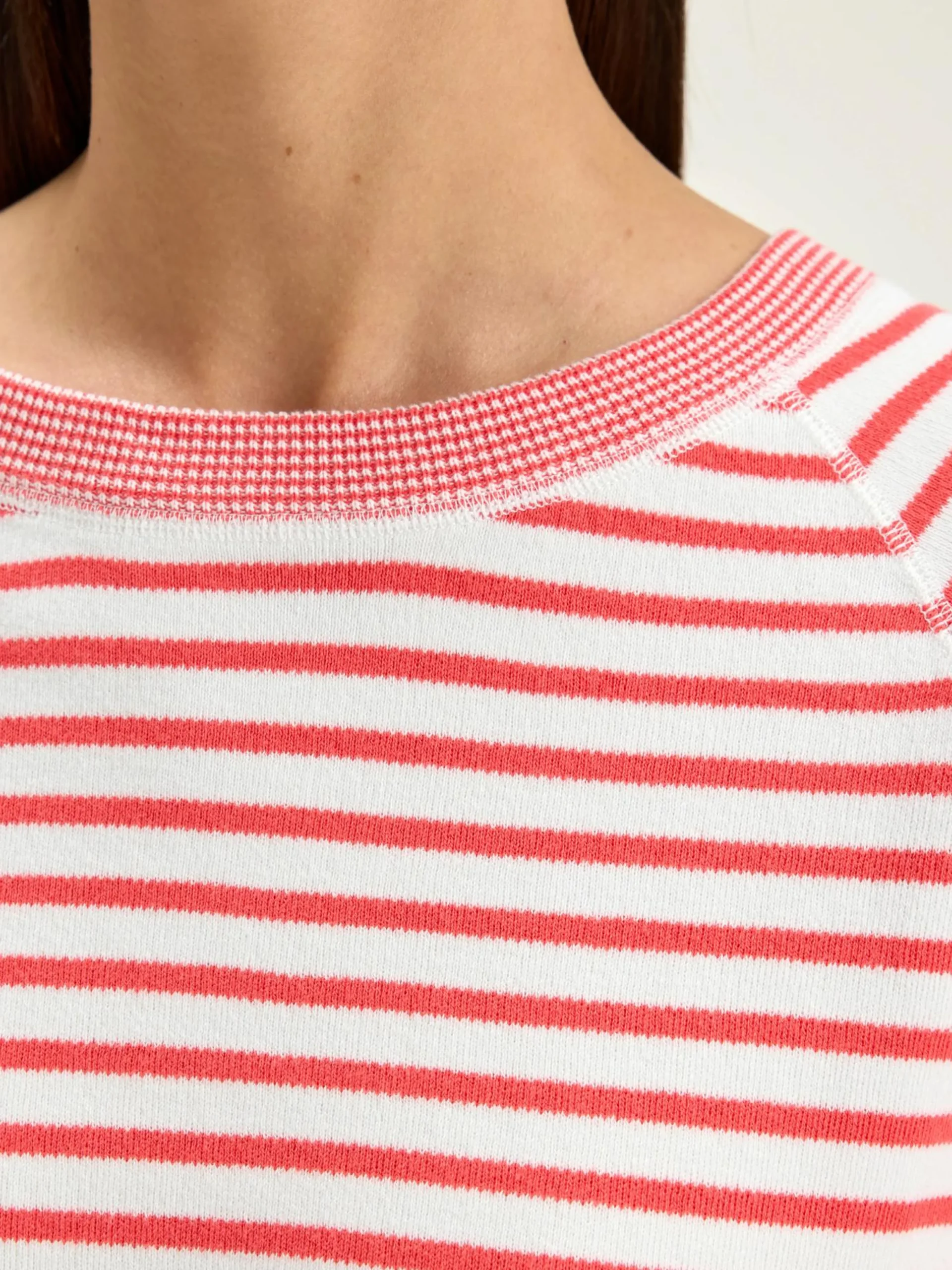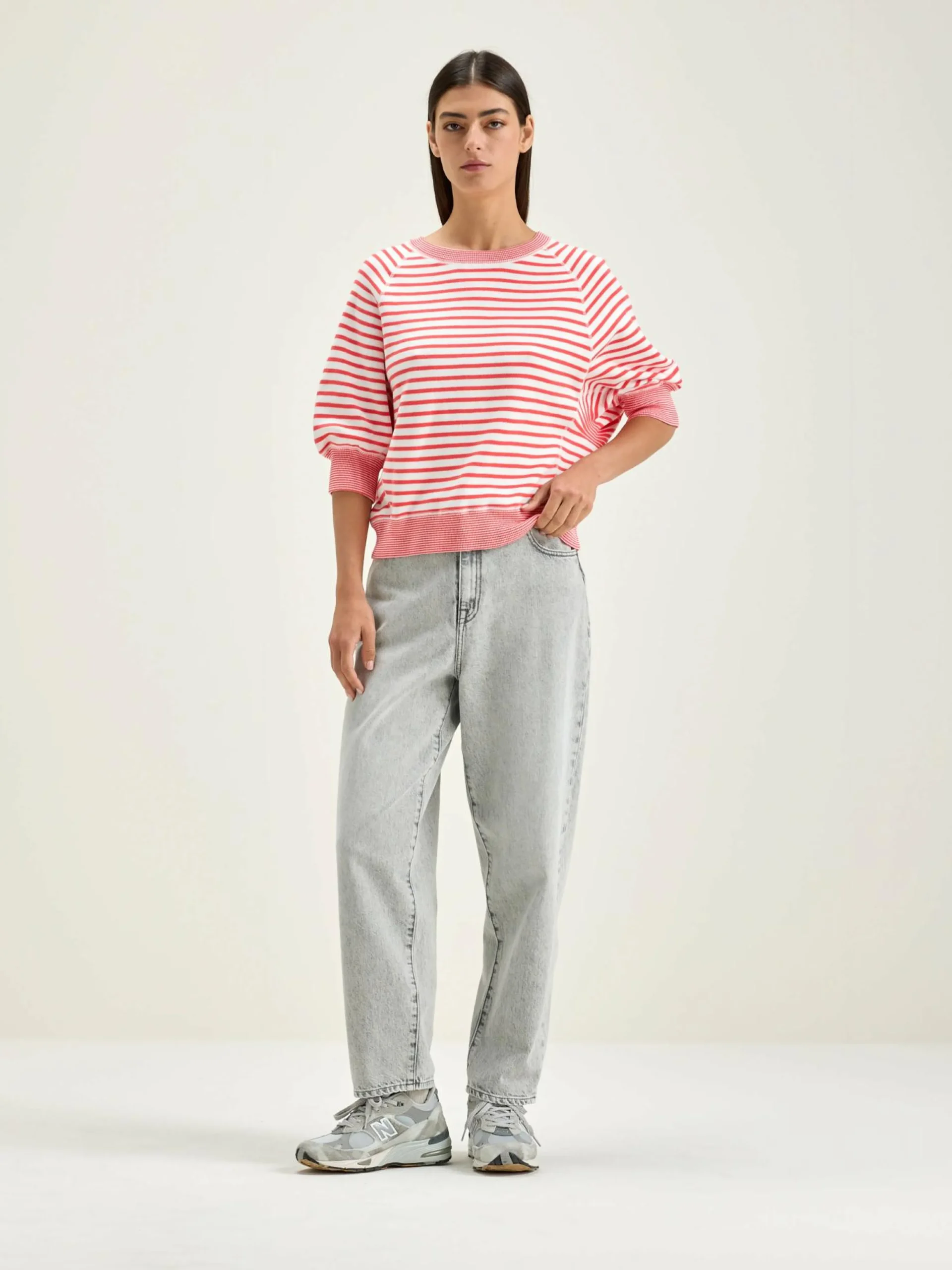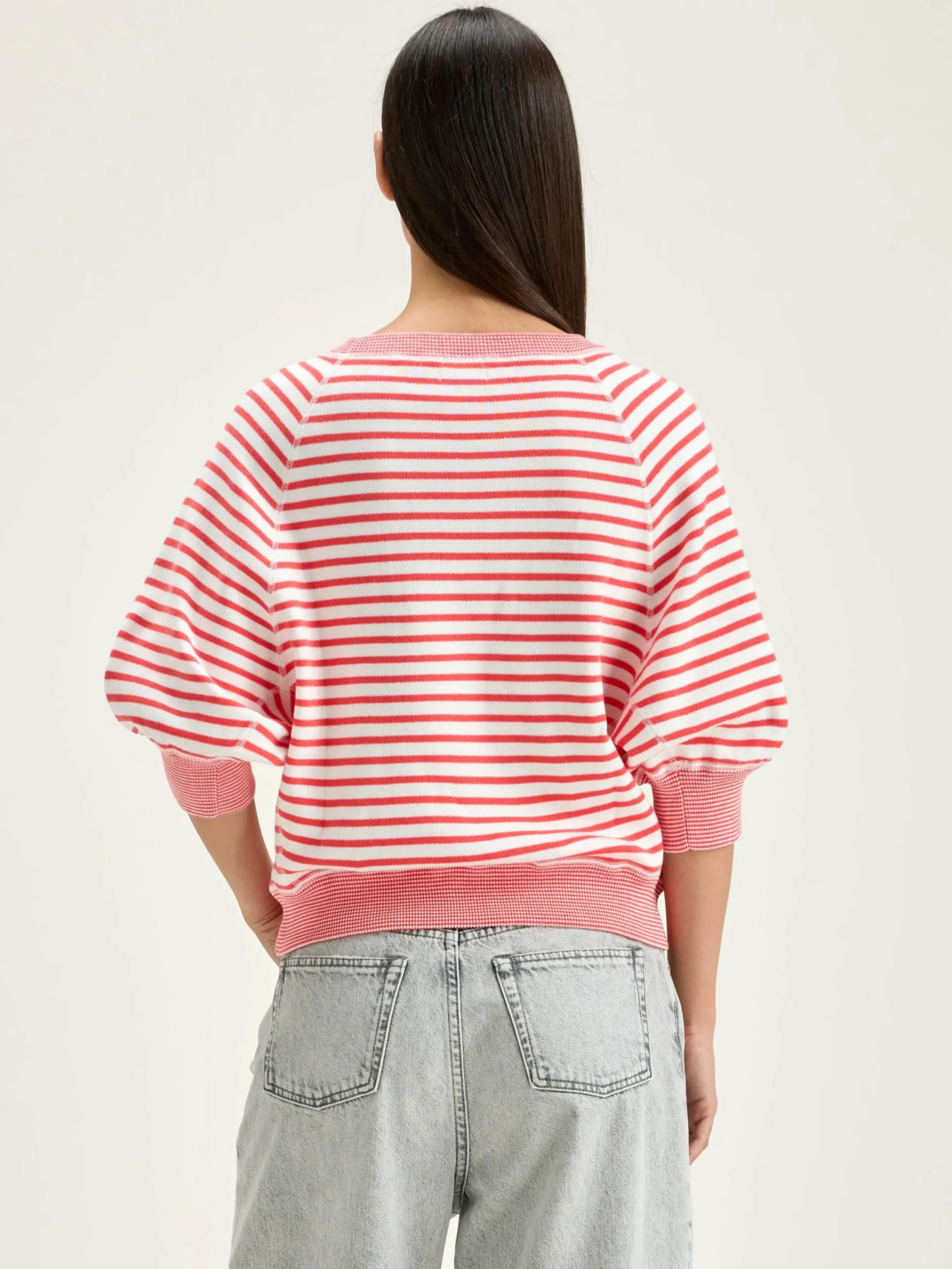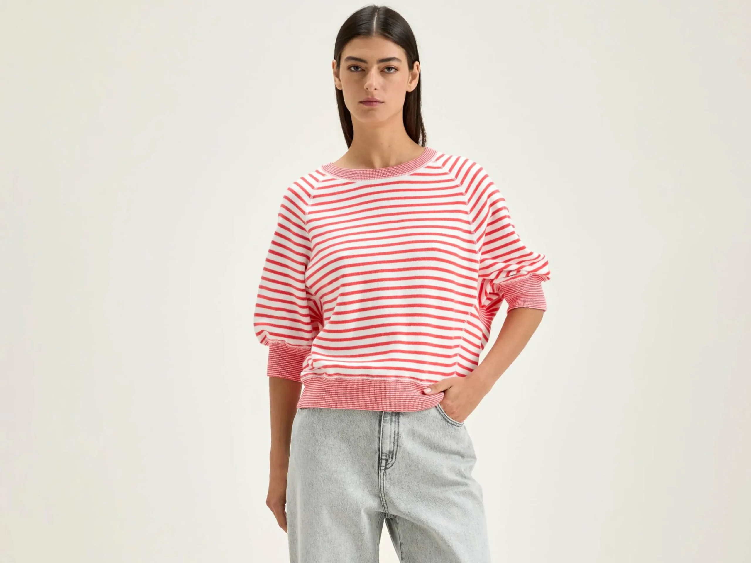 Oversizede crewneck trui met 3/4 mouwen en geribde boorden in ecru katoen met roze strepen.