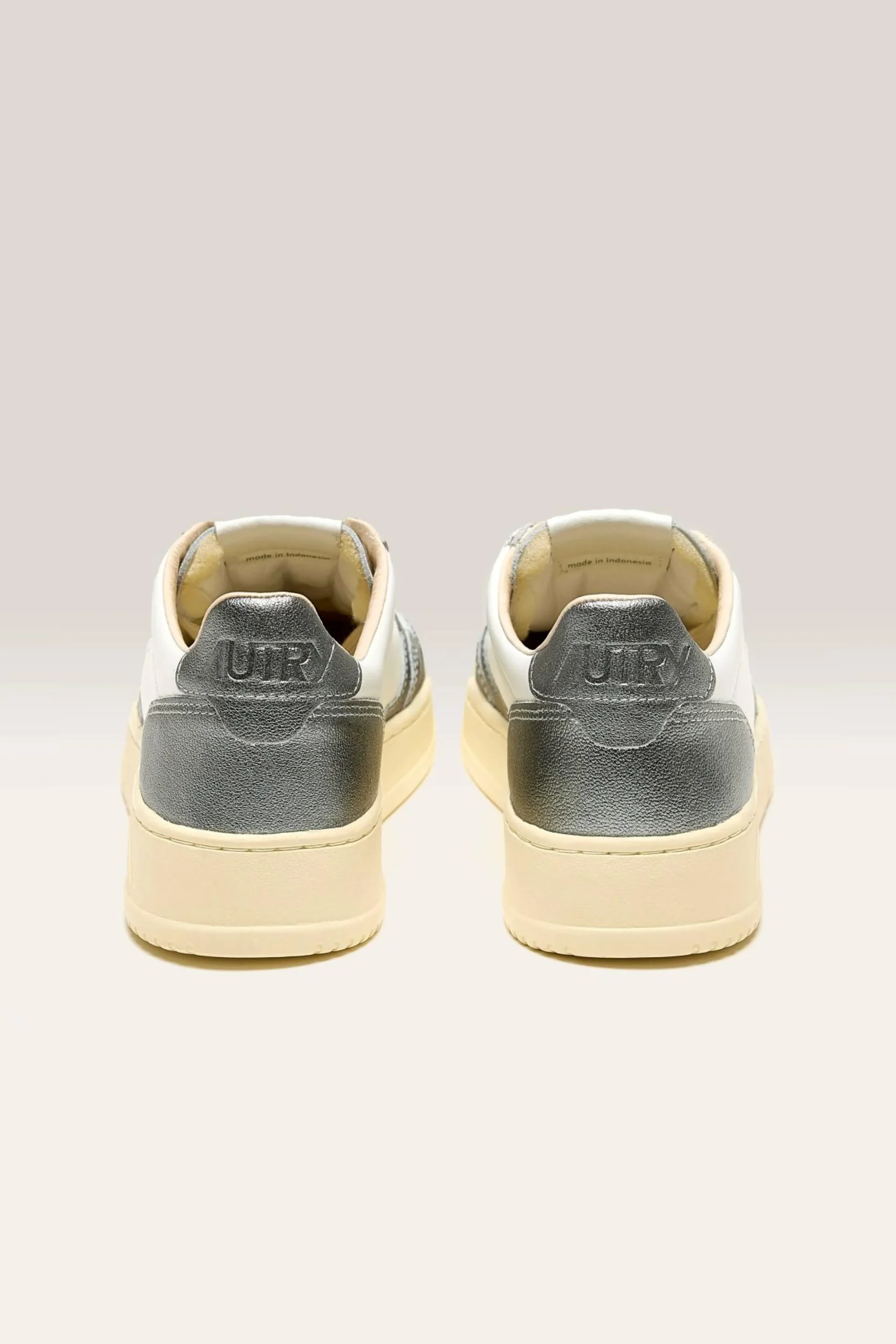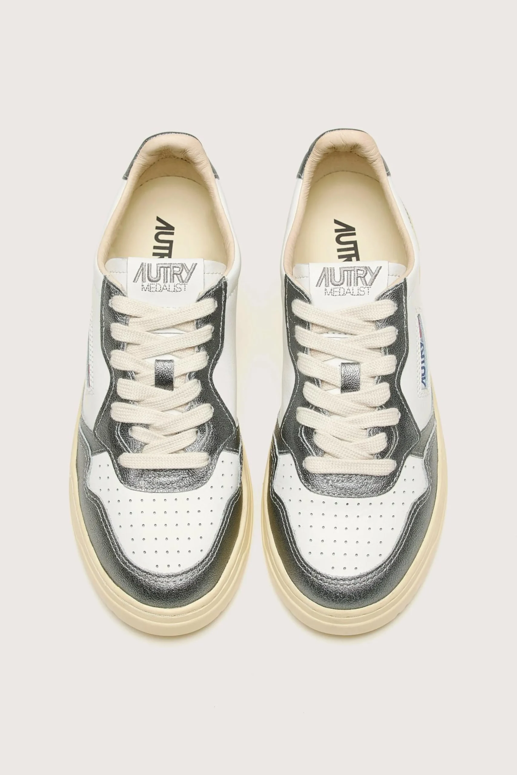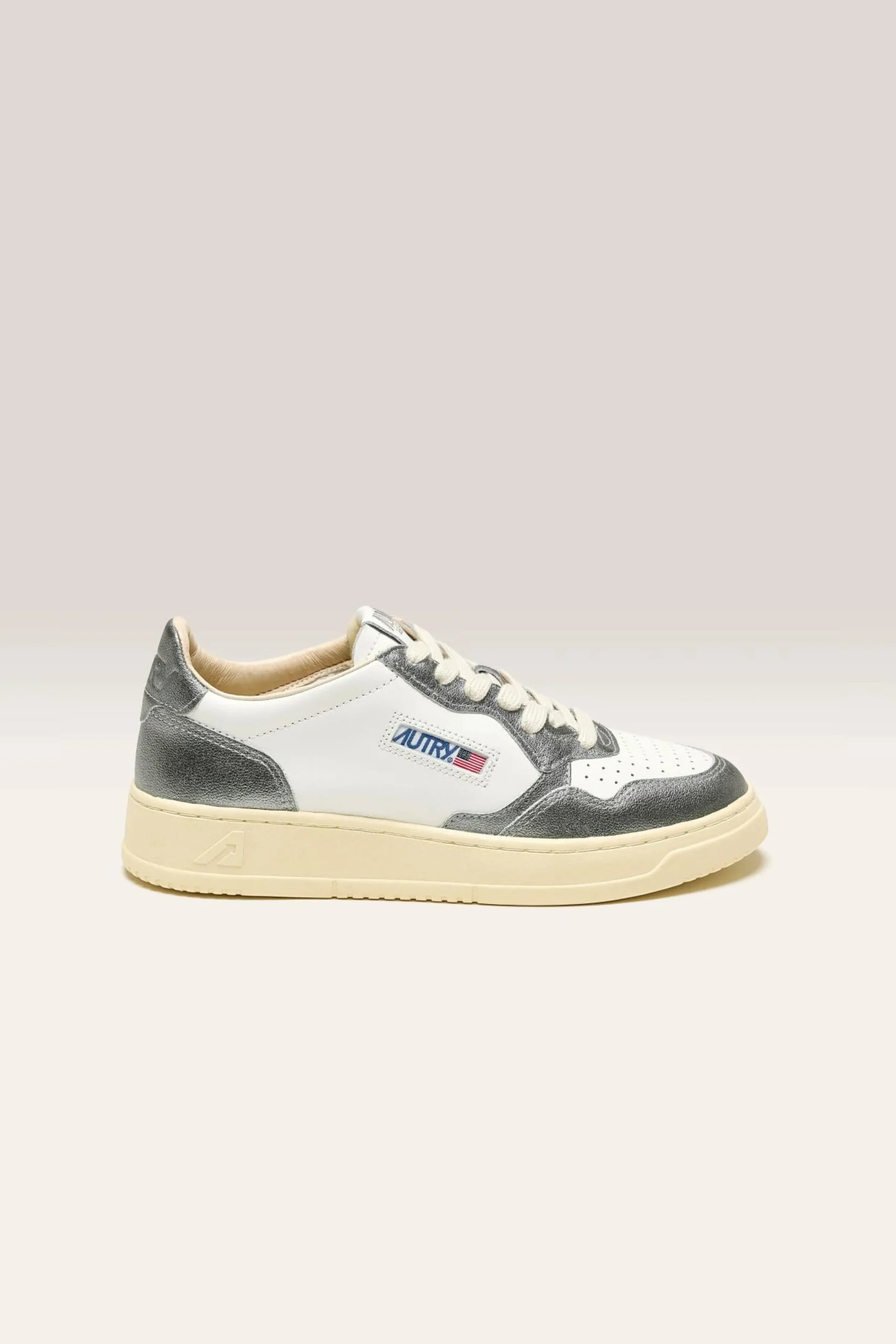 The Autry Medalist Low Bicolor sneaker features a white and steel grey supple leather upper with a perforated toe.