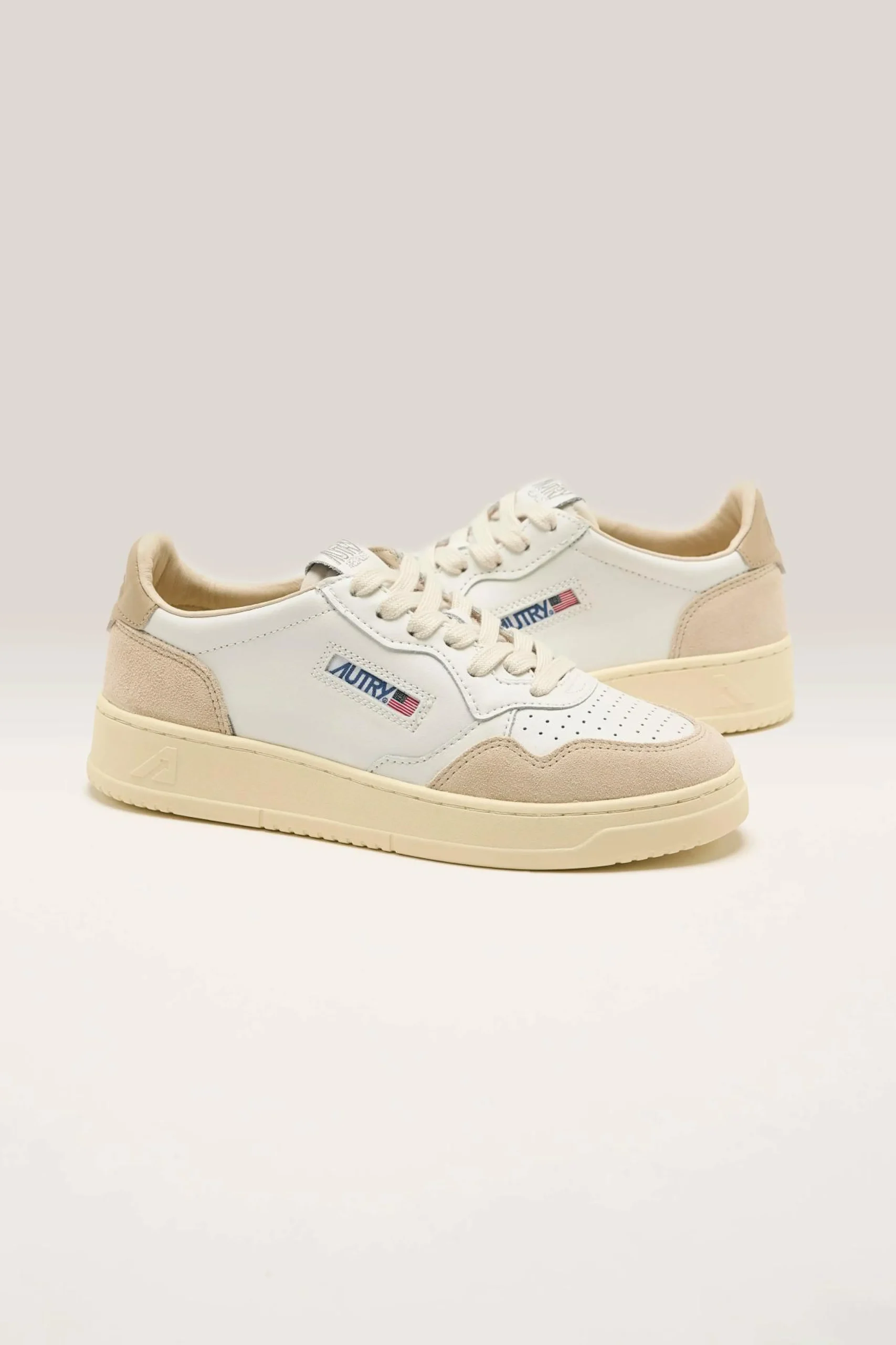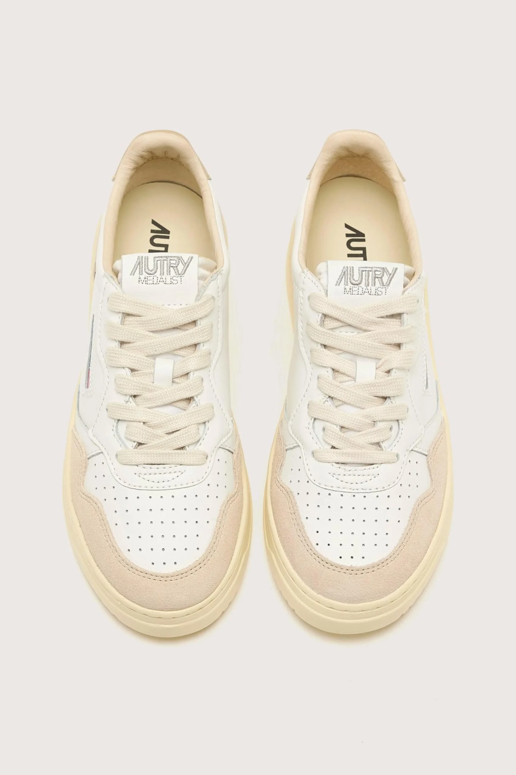 The Autry Medalist Low sneaker features a supple white leather upper, soft suede panels, and a perforated toe.
