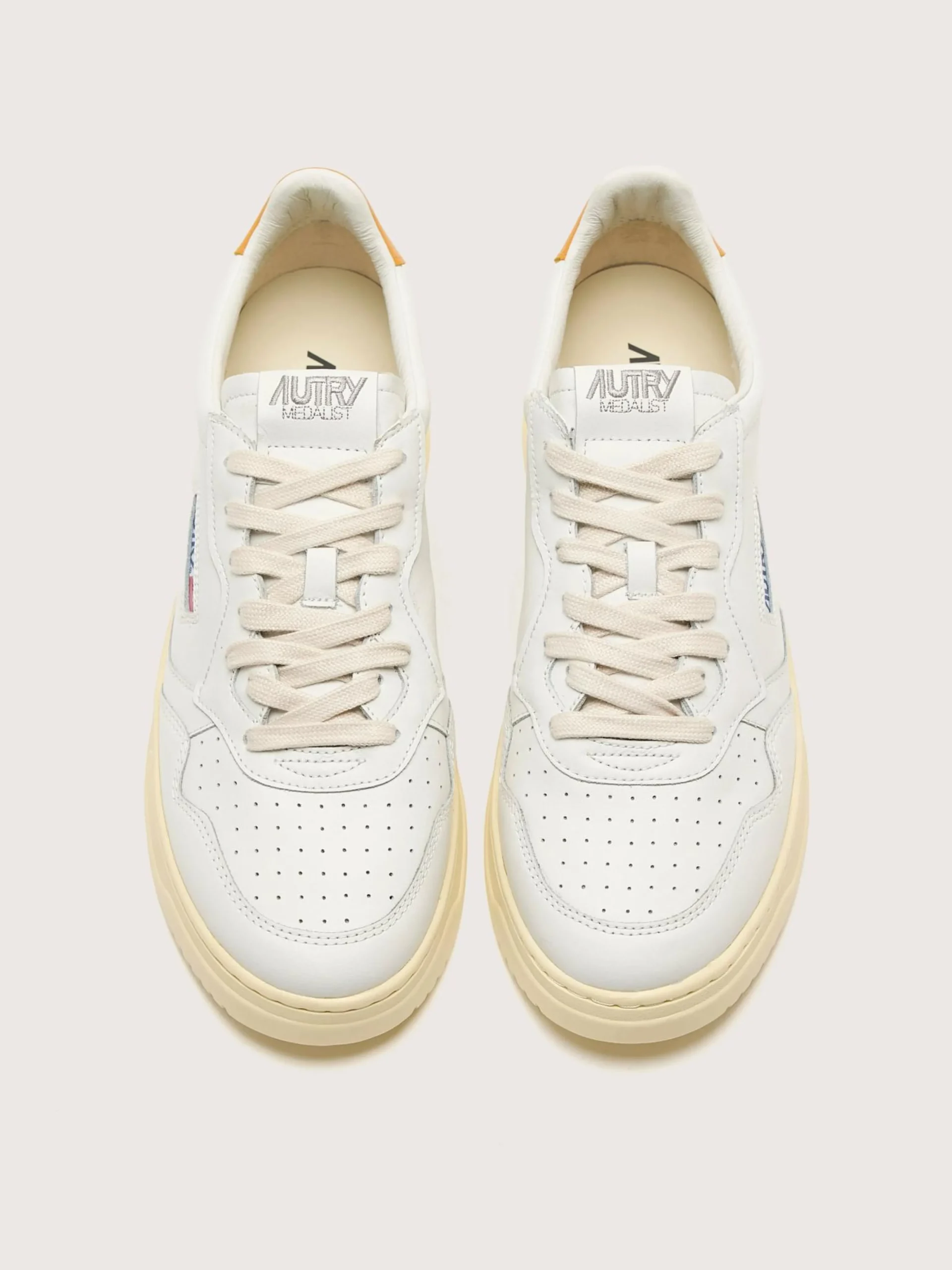 De Autry Medalist Low lifestyle sneakers hebben een sportief silhouet in wit leder met een gouden lederen hiellipje.