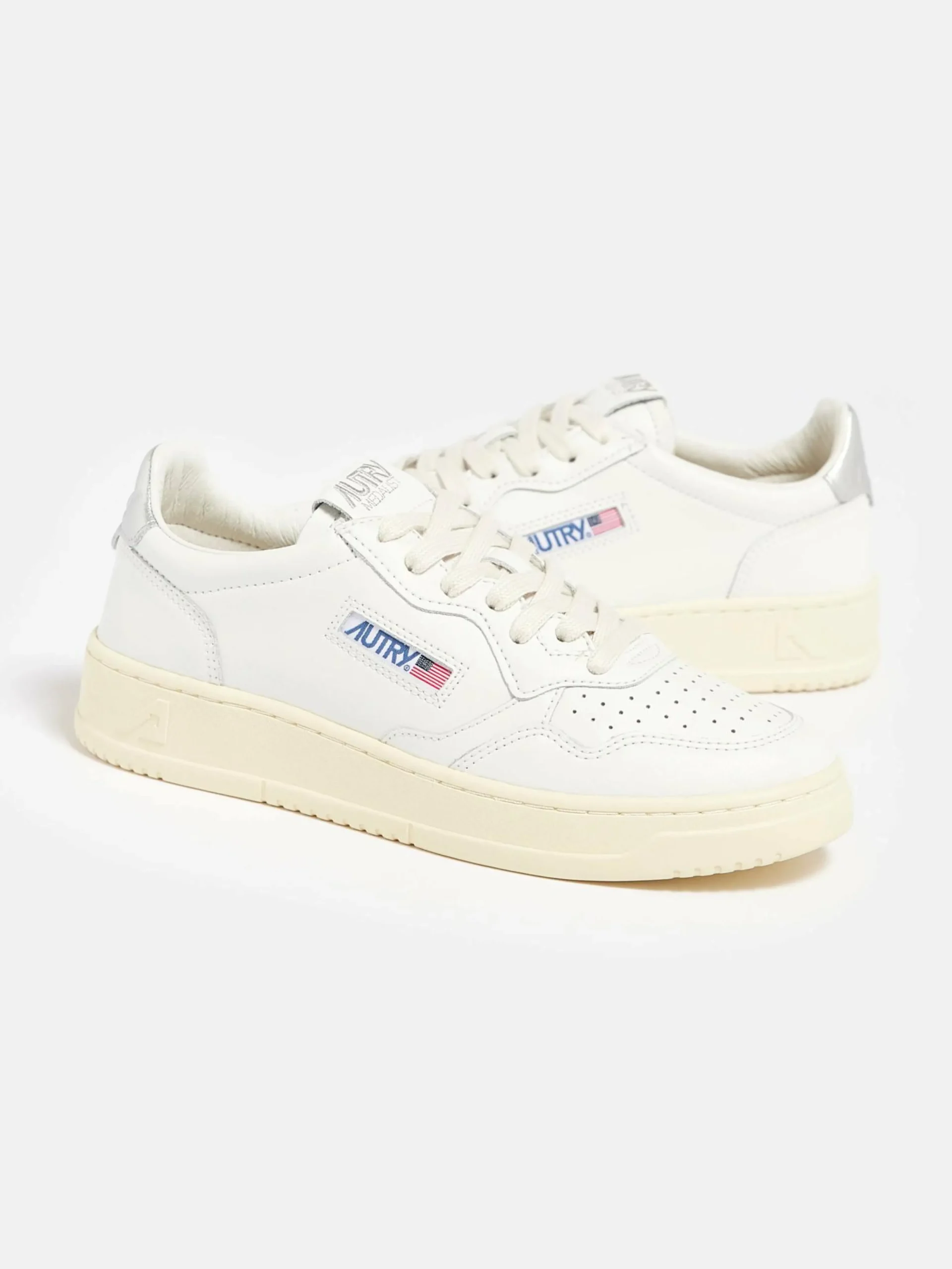 De Autry Medalist Low sneakers hebben een natuurlijk, soepel bovenwerk van wit leder met een geperforeerde neus en een zilverlederen hiellipje.