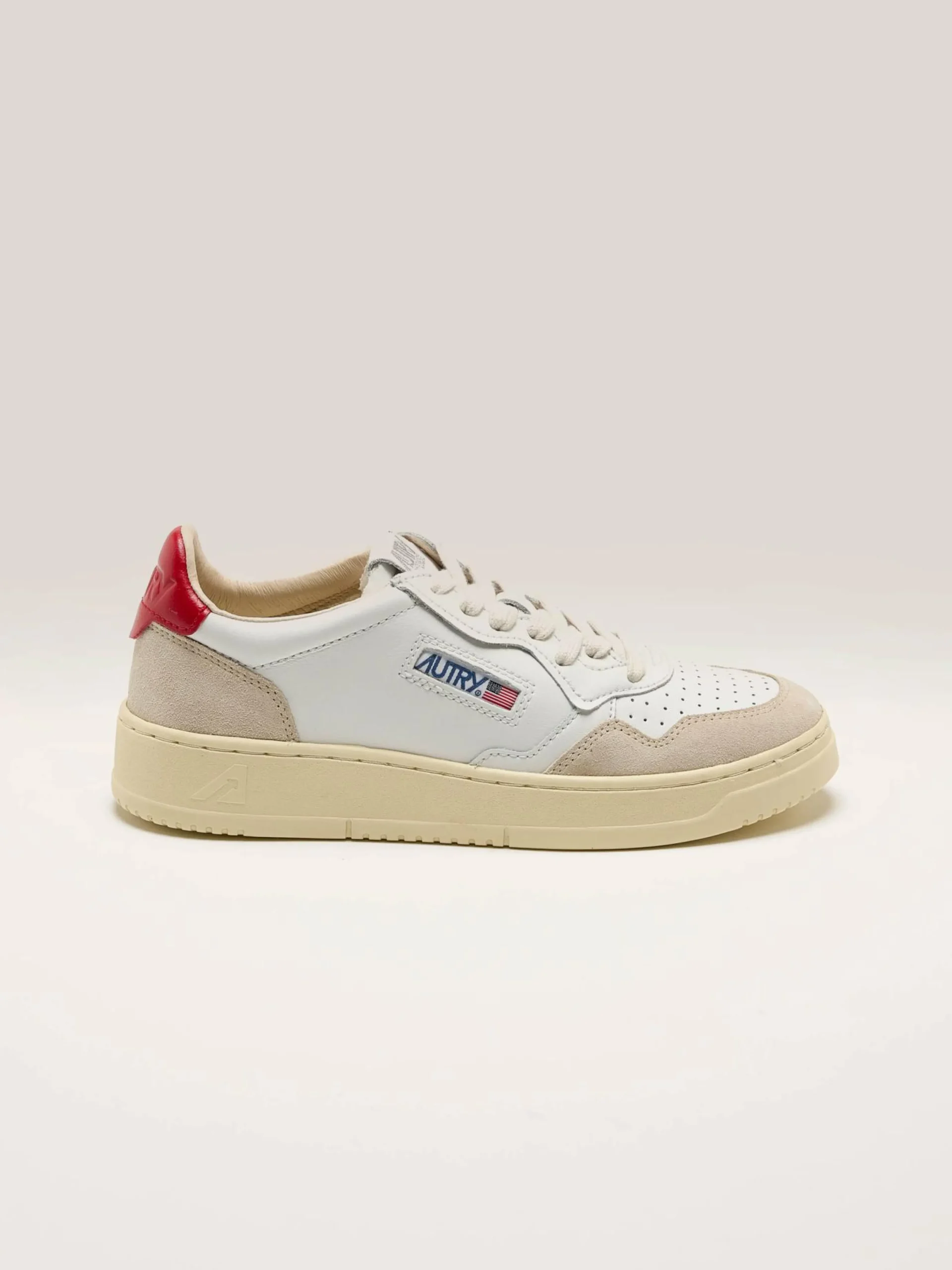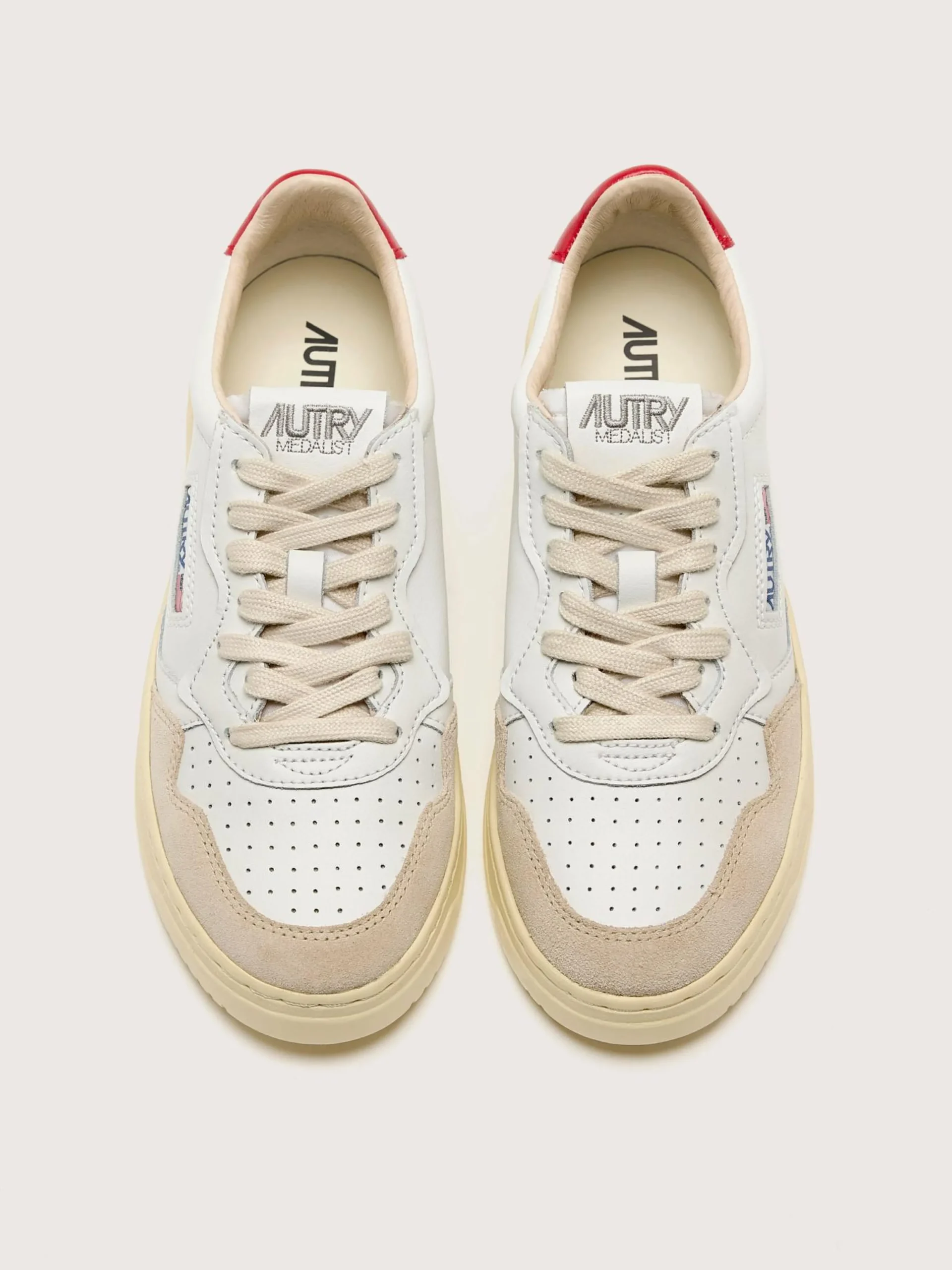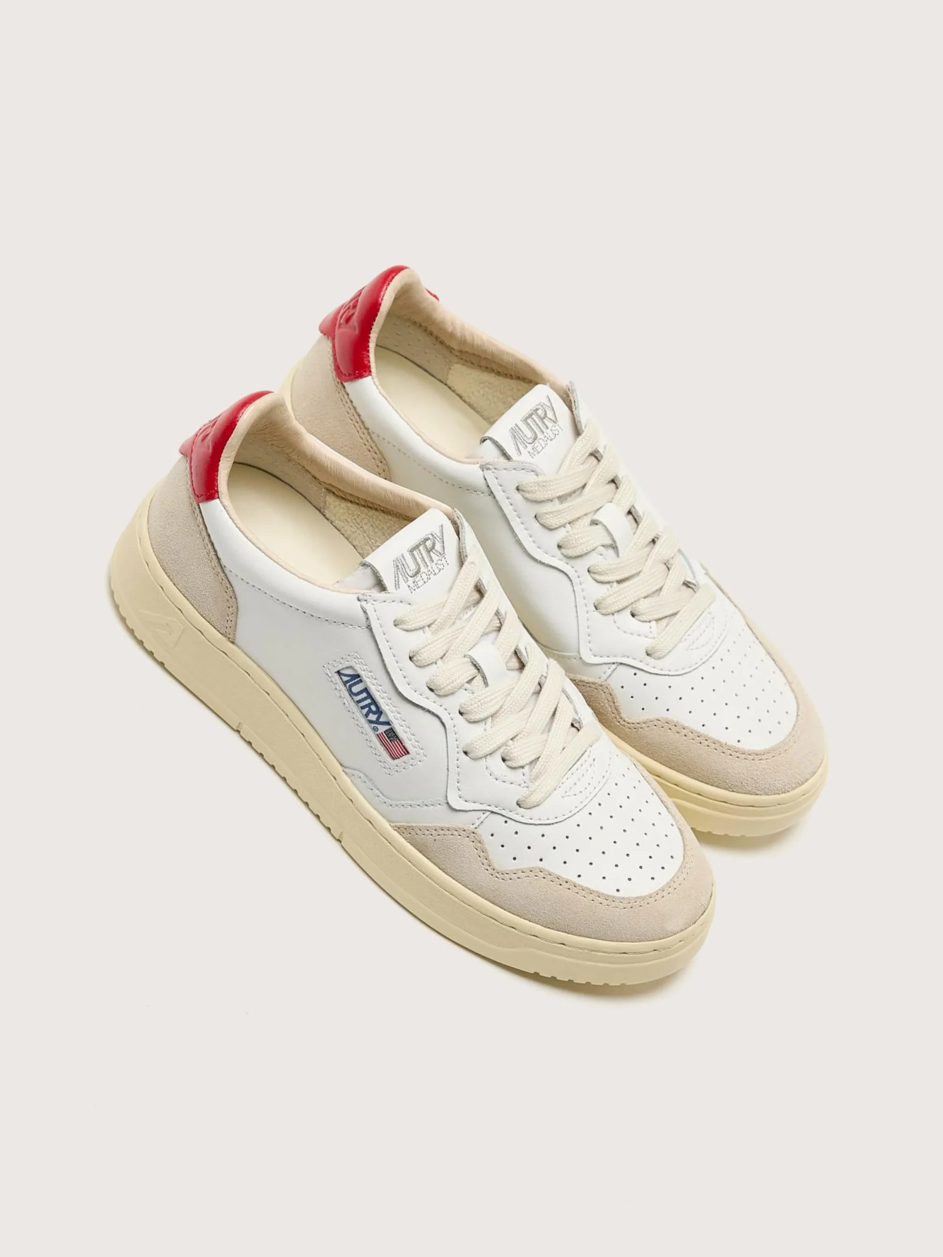 De Autry Medalist Low sneakers hebben een soepel wit lederen bovenwerk met zacht suède panelen, een geperforeerde neus en een rood lederen hiellipje.
