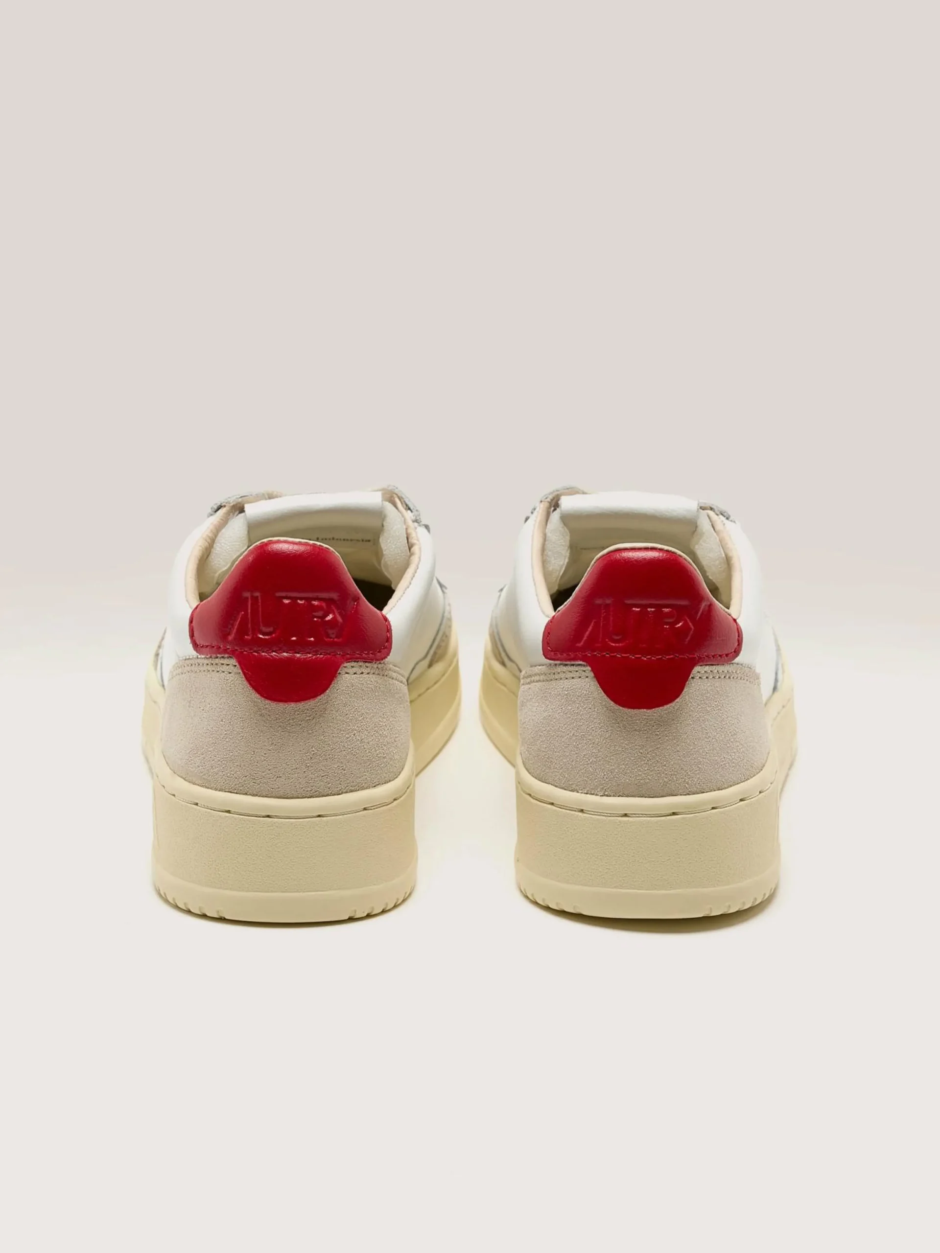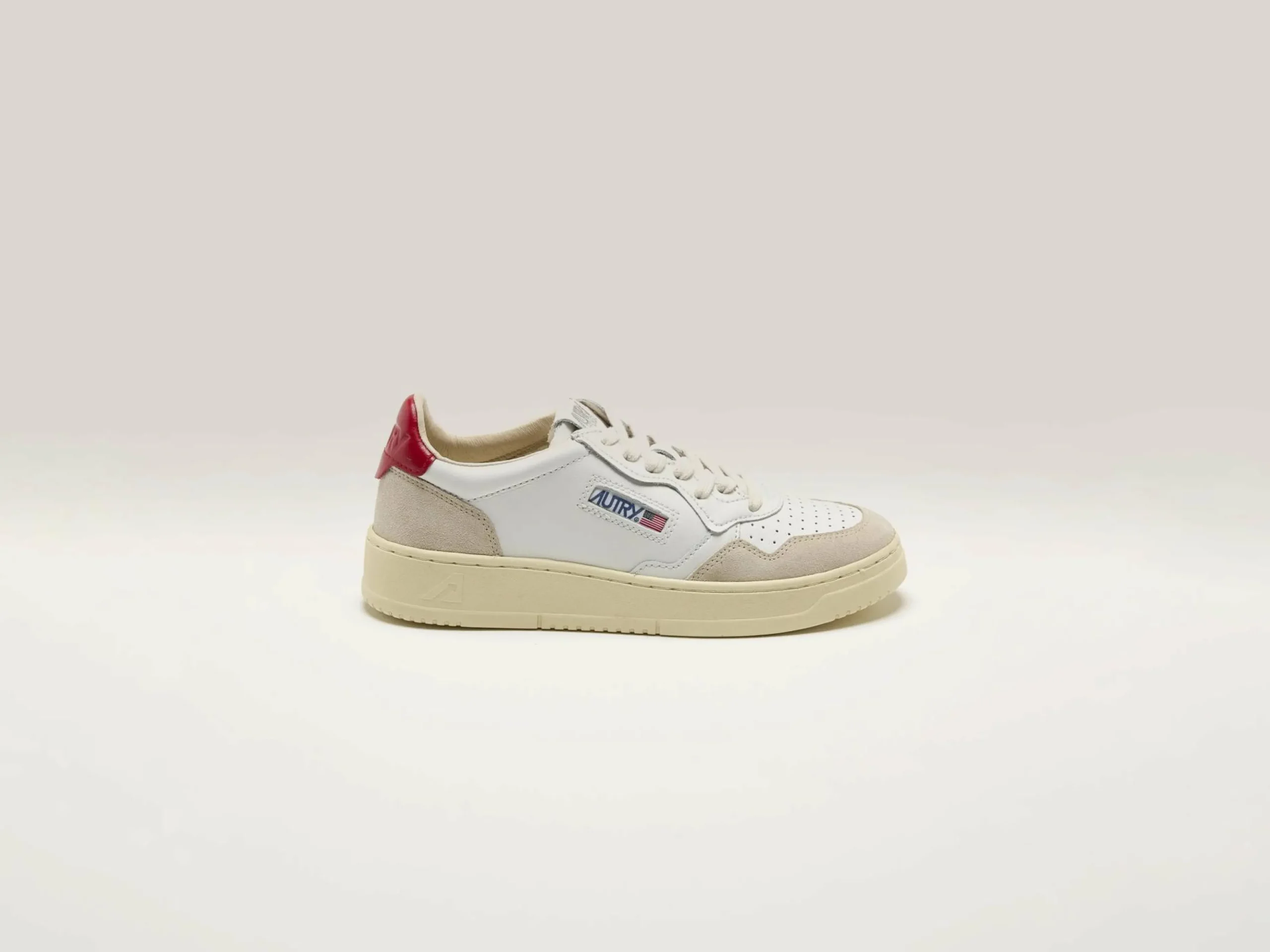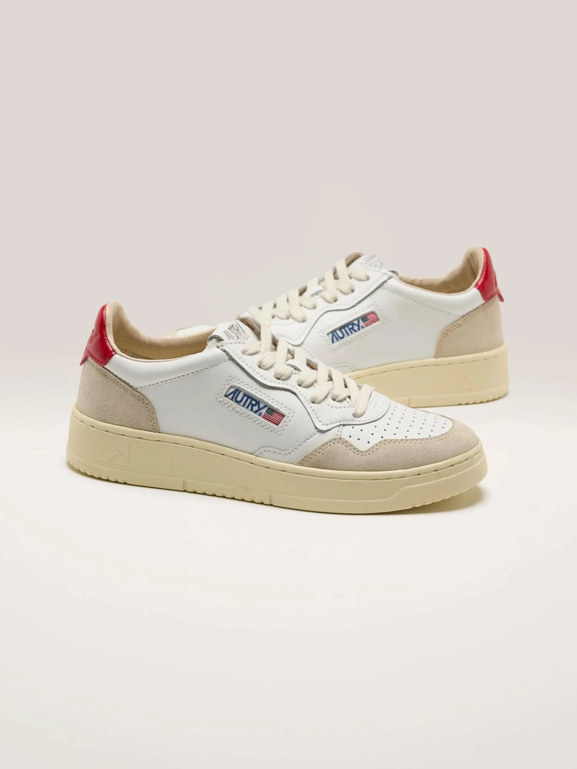 De Autry Medalist Low sneakers hebben een soepel wit lederen bovenwerk met zacht suède panelen, een geperforeerde neus en een rood lederen hiellipje.