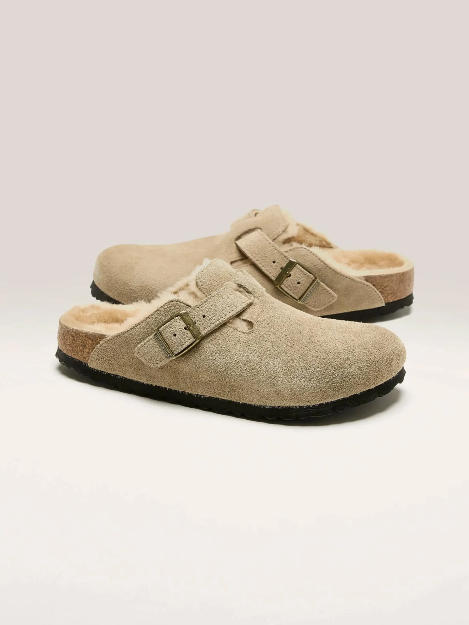 De Birkenstock Boston Shearling klompen hebben een premium suède bovenwerk met voering van natuurlijk lamsleder en een iconisch anatomisch gevormd kurken voetbed.
