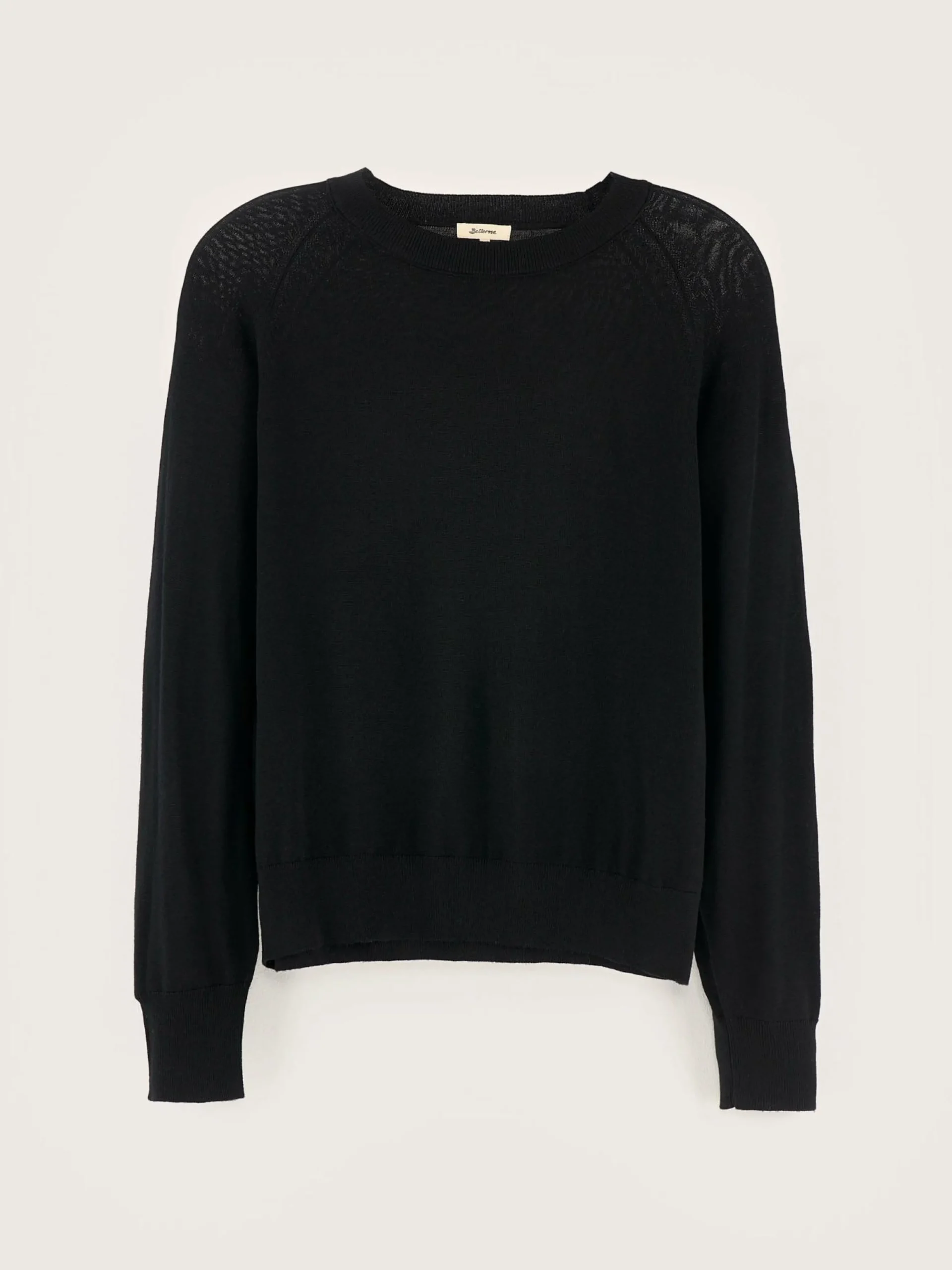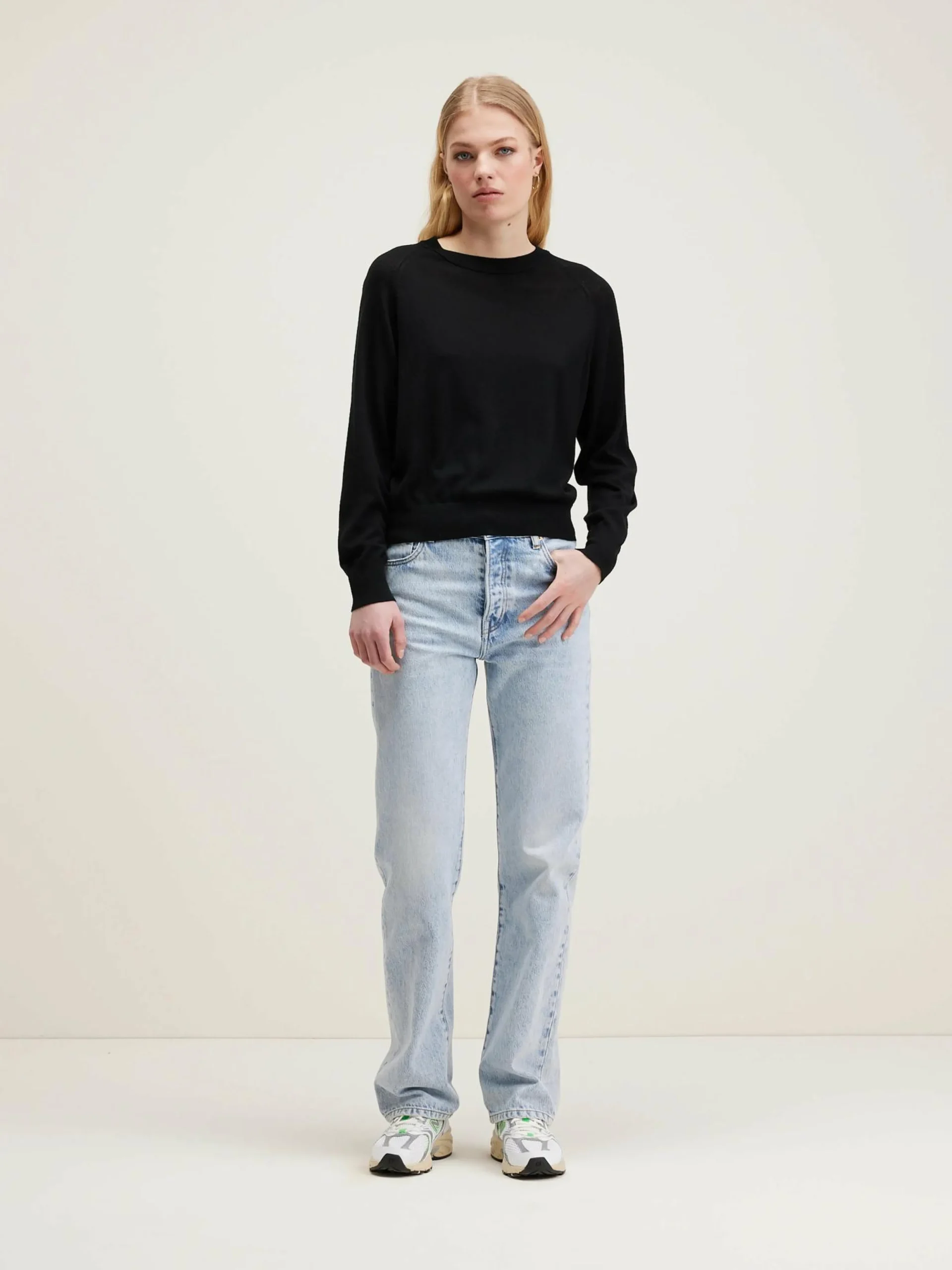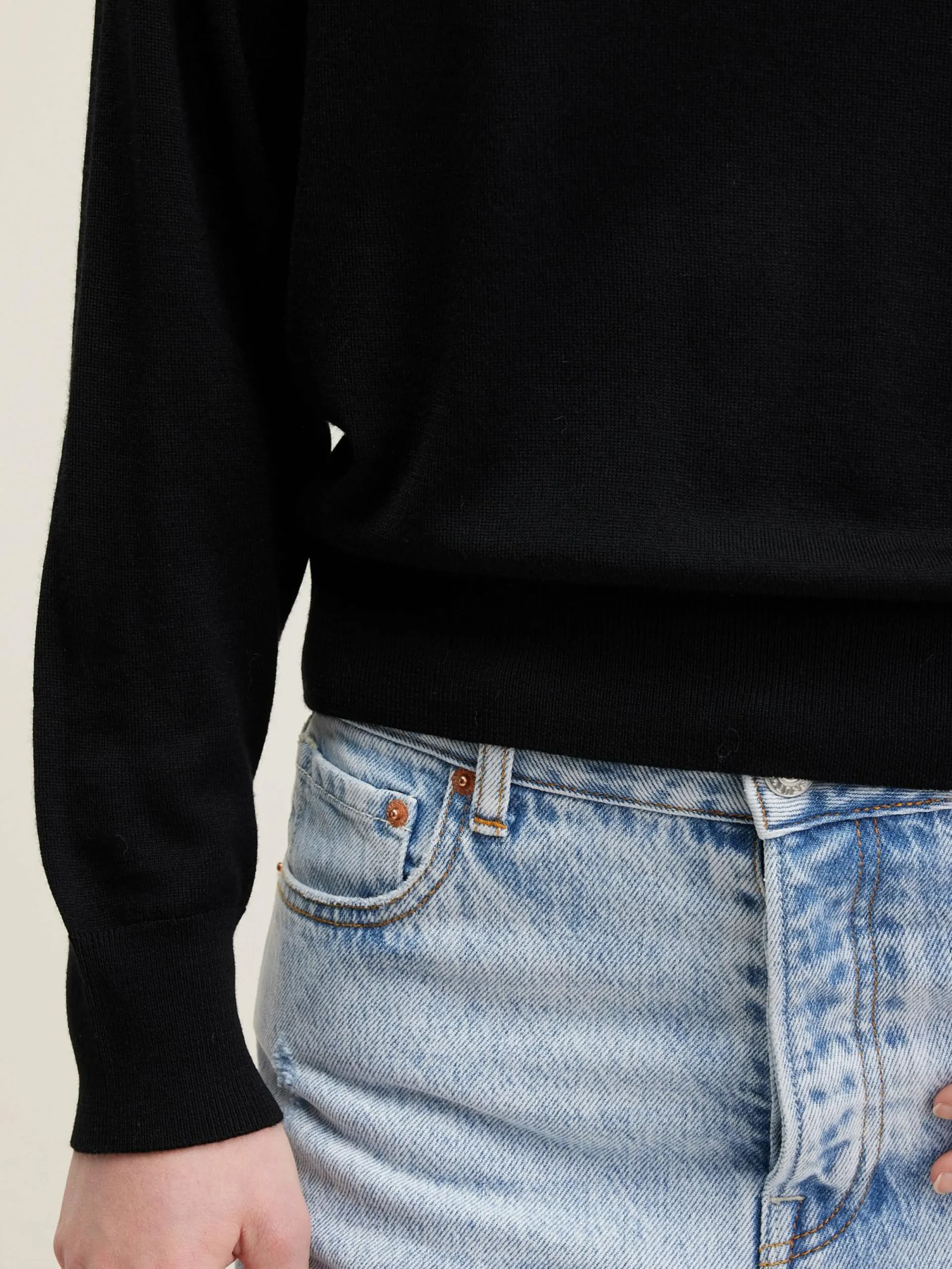 Klassieke, marineblauwe trui van merinowol, met zadelmouwen.