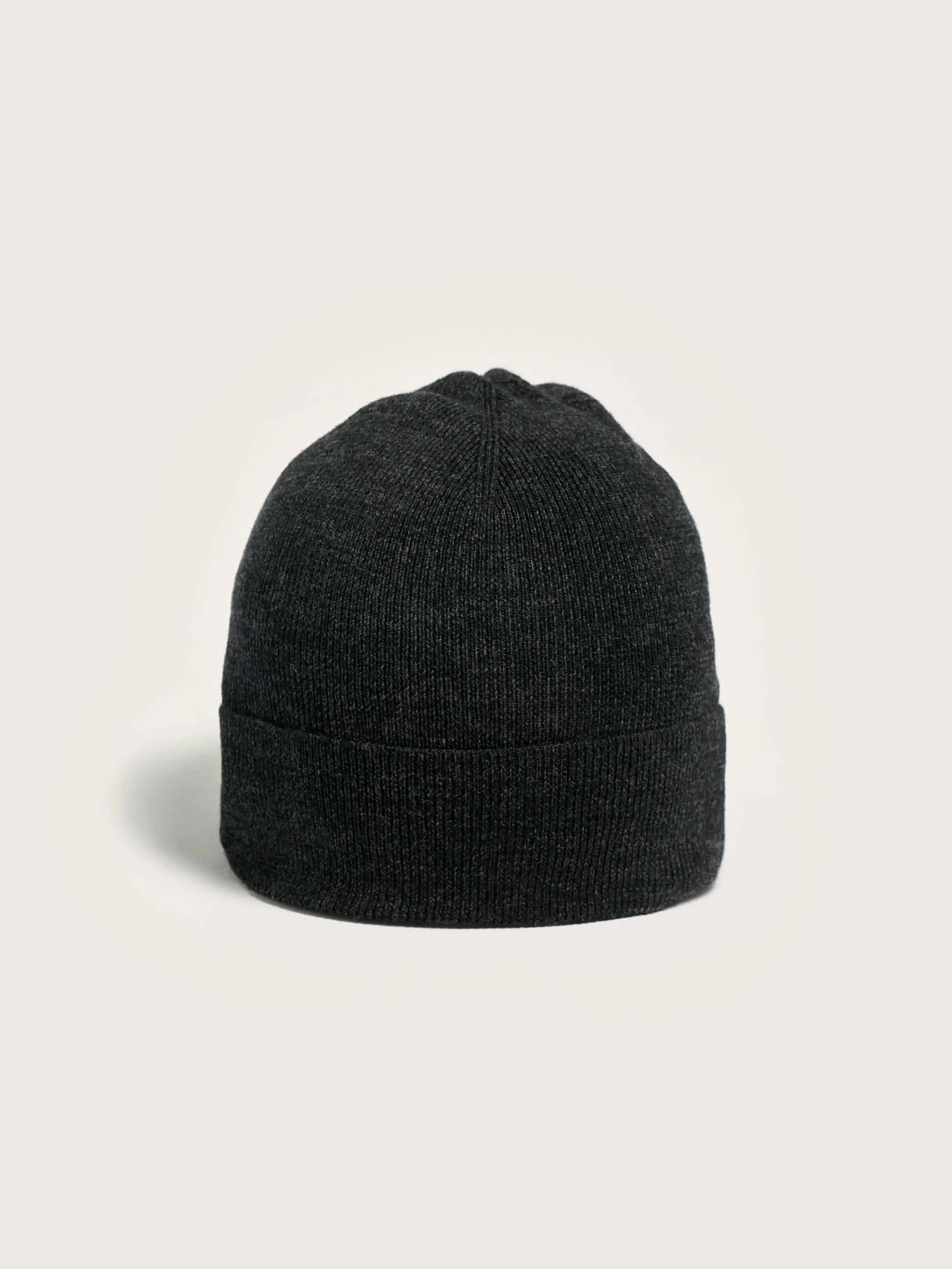 Klassieke geribbelde beanie van off-black, superfijne merinowol.