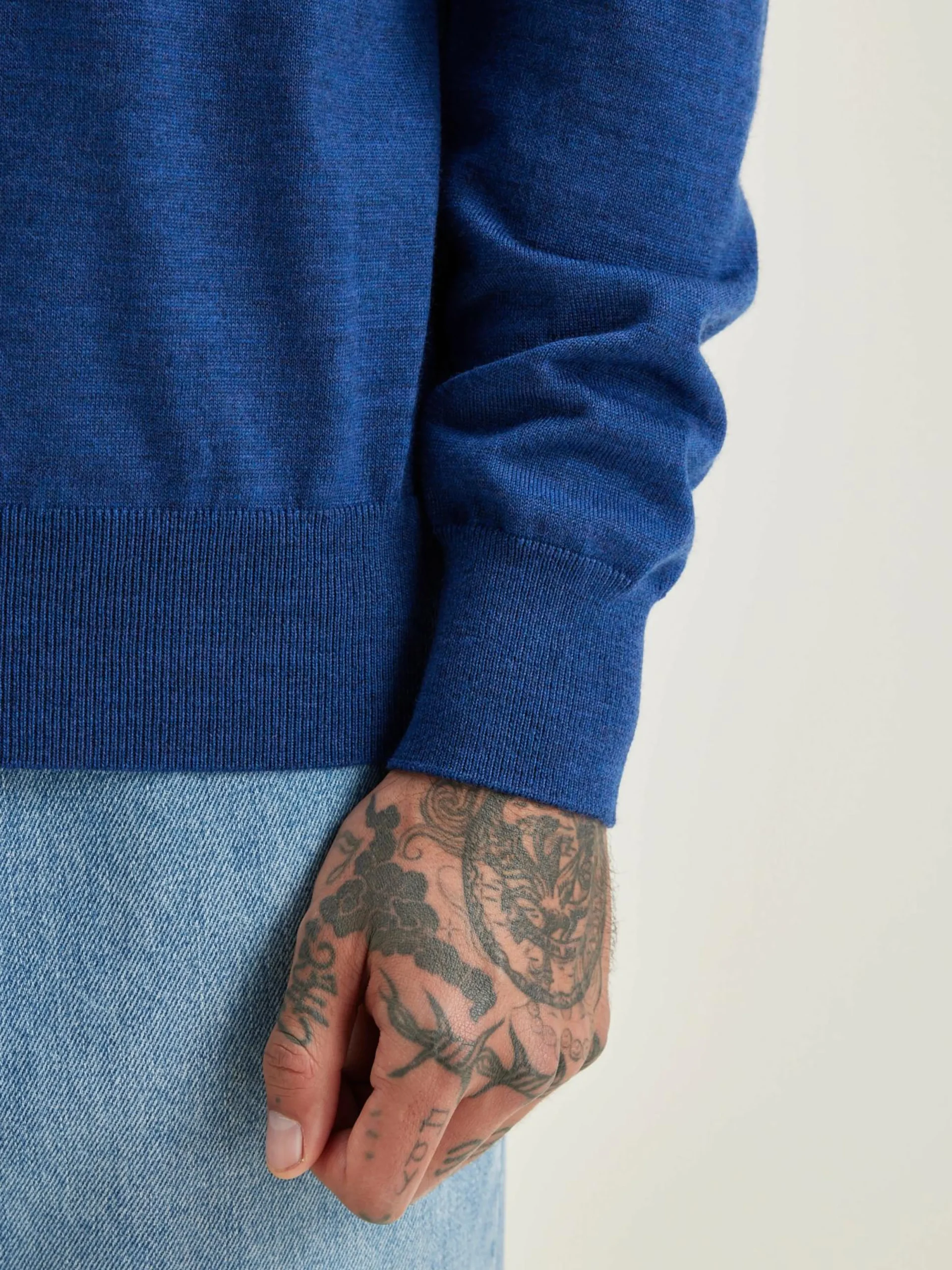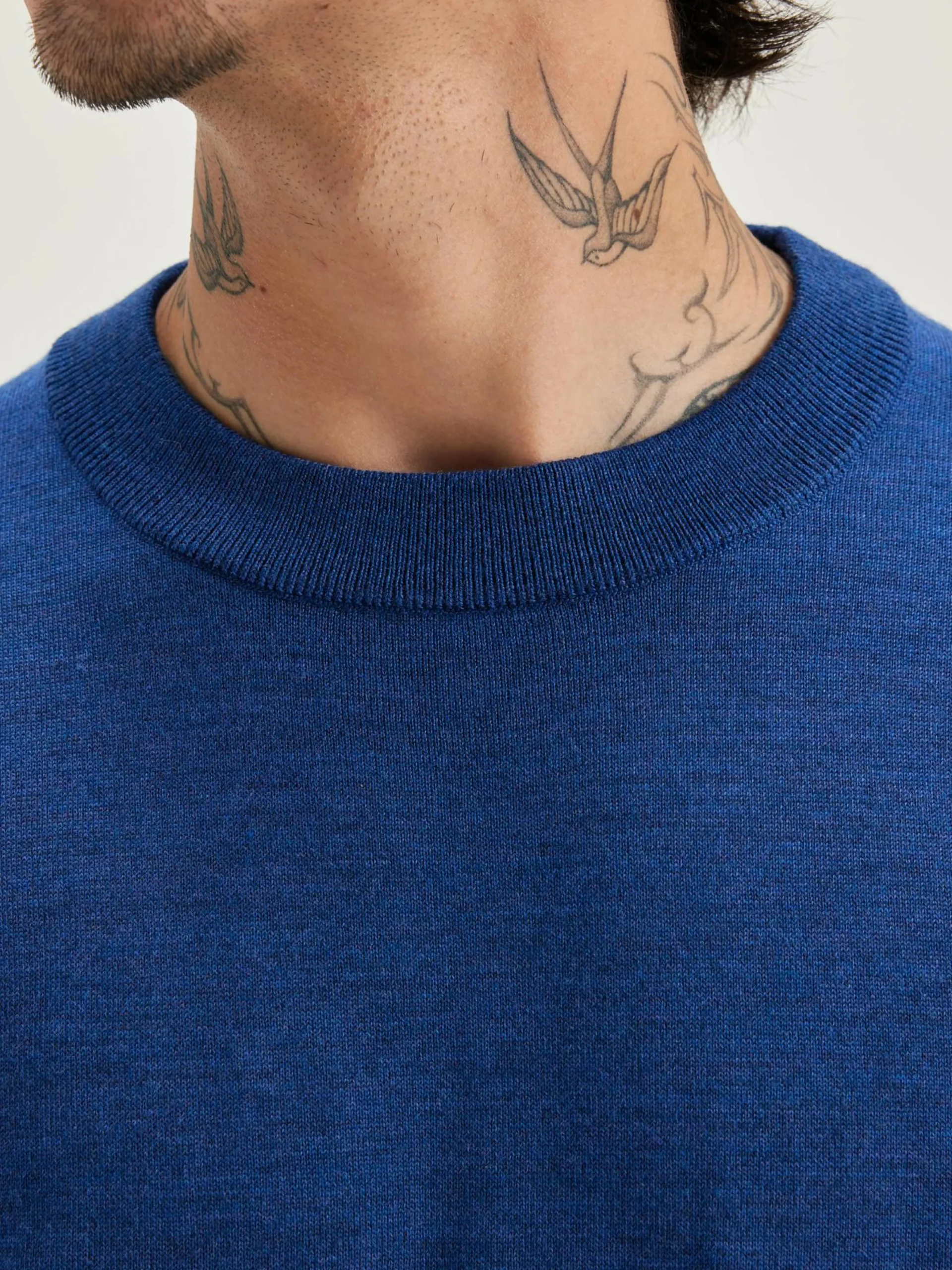 Klassieke, gemengd blauwe sweater met ronde hals, van superfijne merinowol.