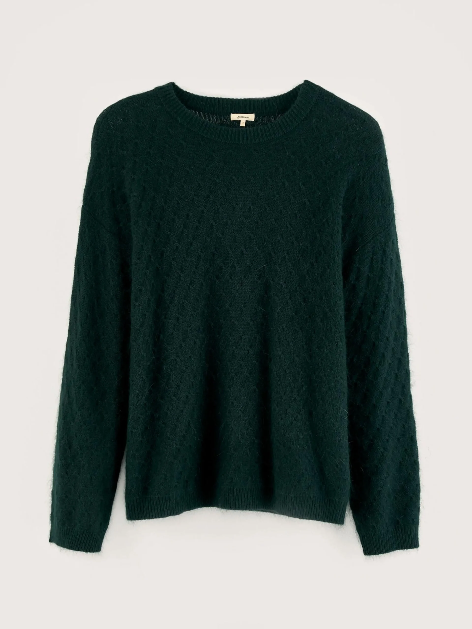 Flesgroene, relaxede trui met ronde hals, van angoramix.