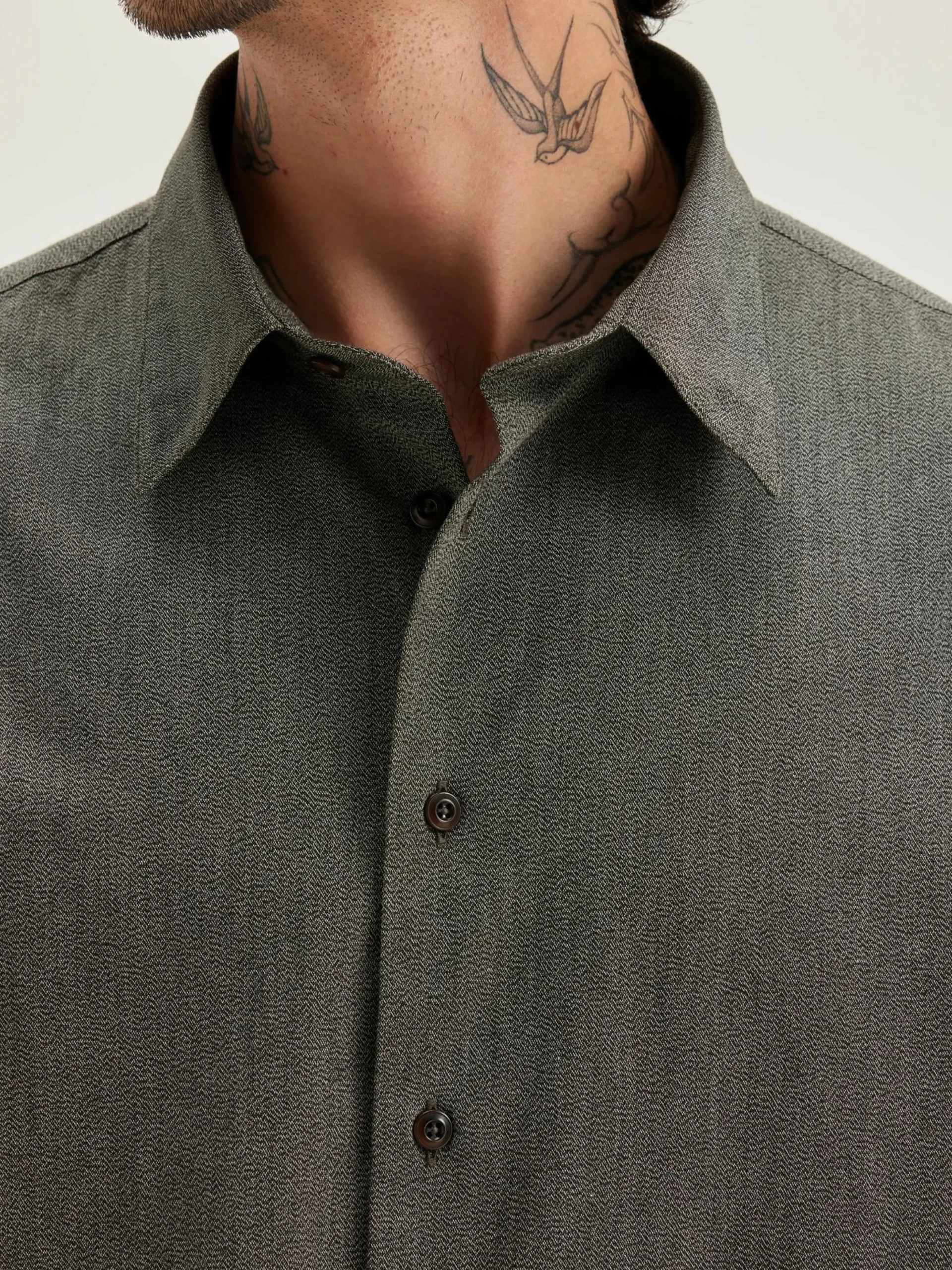 - Knoopsluiting vooraan en enkelgestikt placket