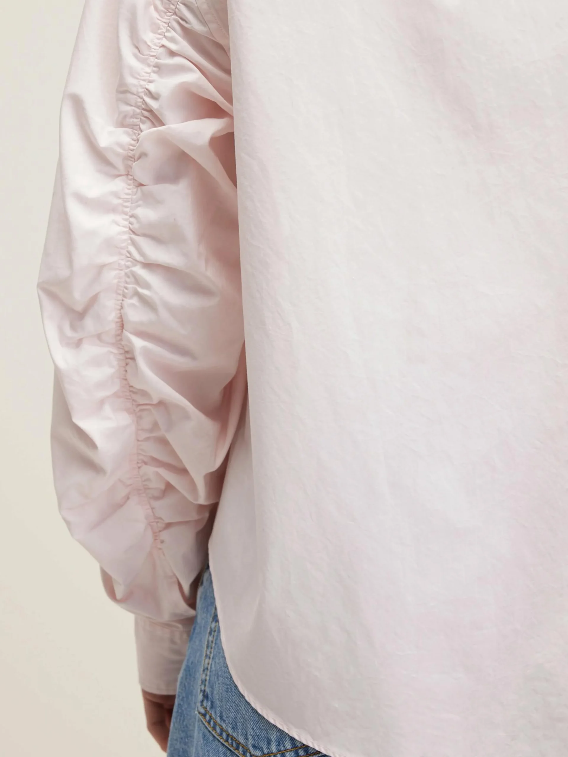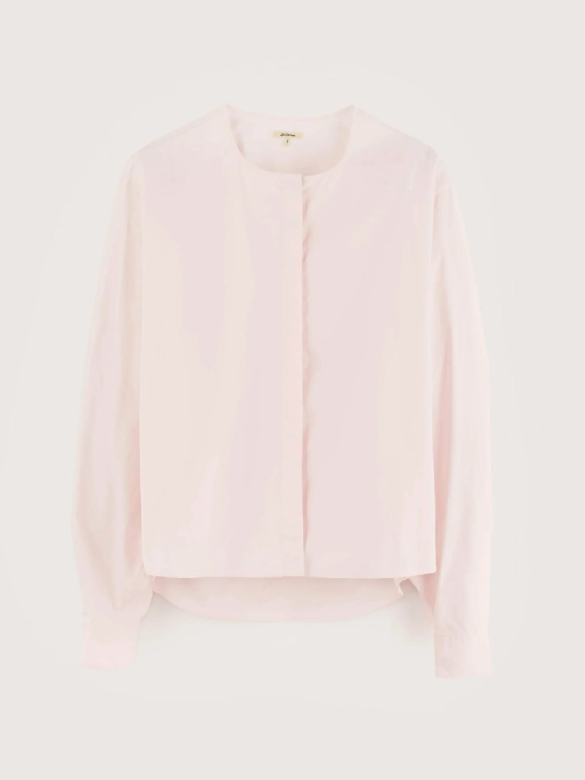Hemd met ronde hals en lange mouwen met ruches, van lichtroze katoenpopeline.