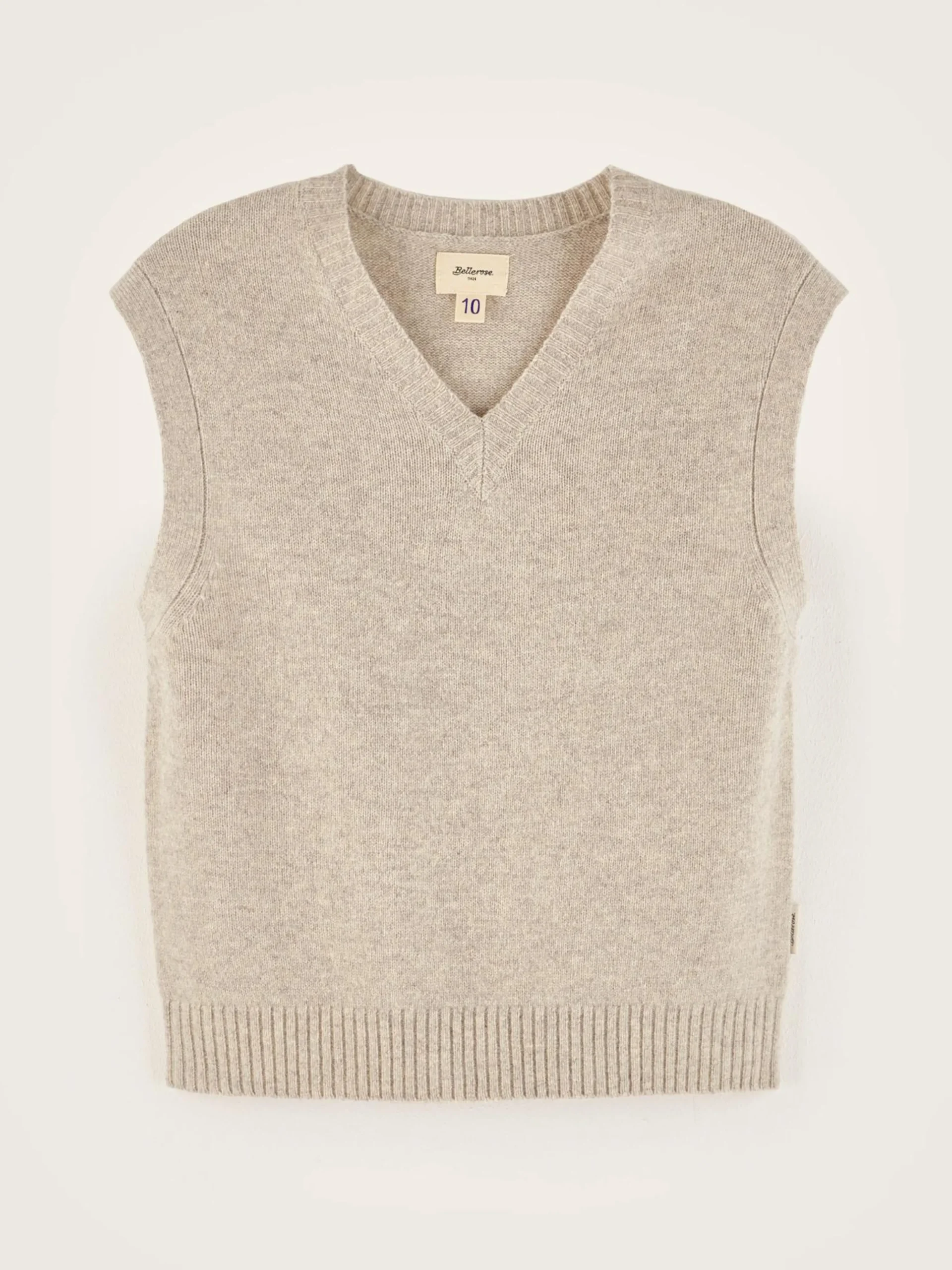 Comfortabele, mouwloze debardeur met V-hals, van lichtgrijze merinowol.