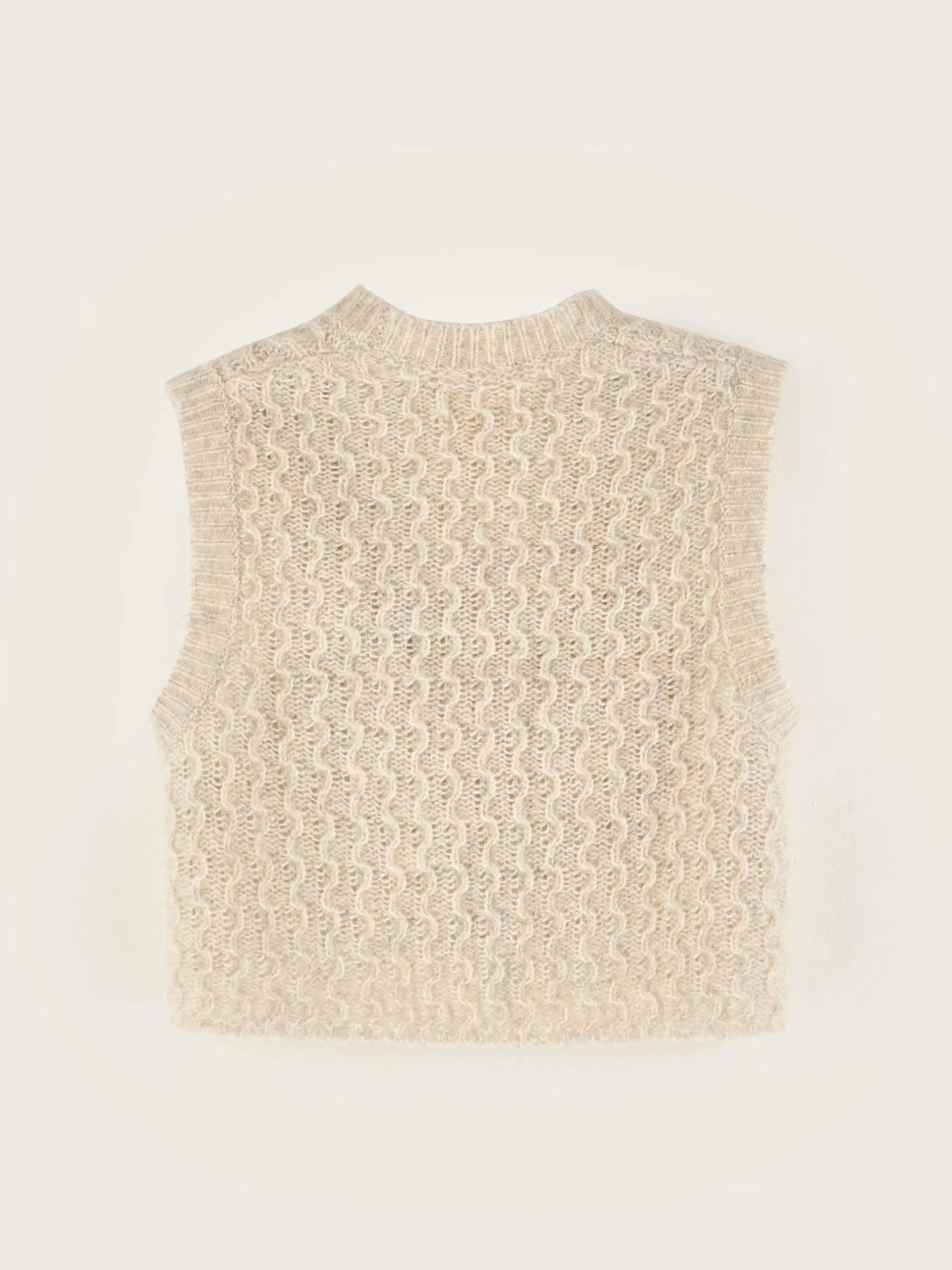 Oestergrijs mouwloos, comfortabel, gebreid vest.