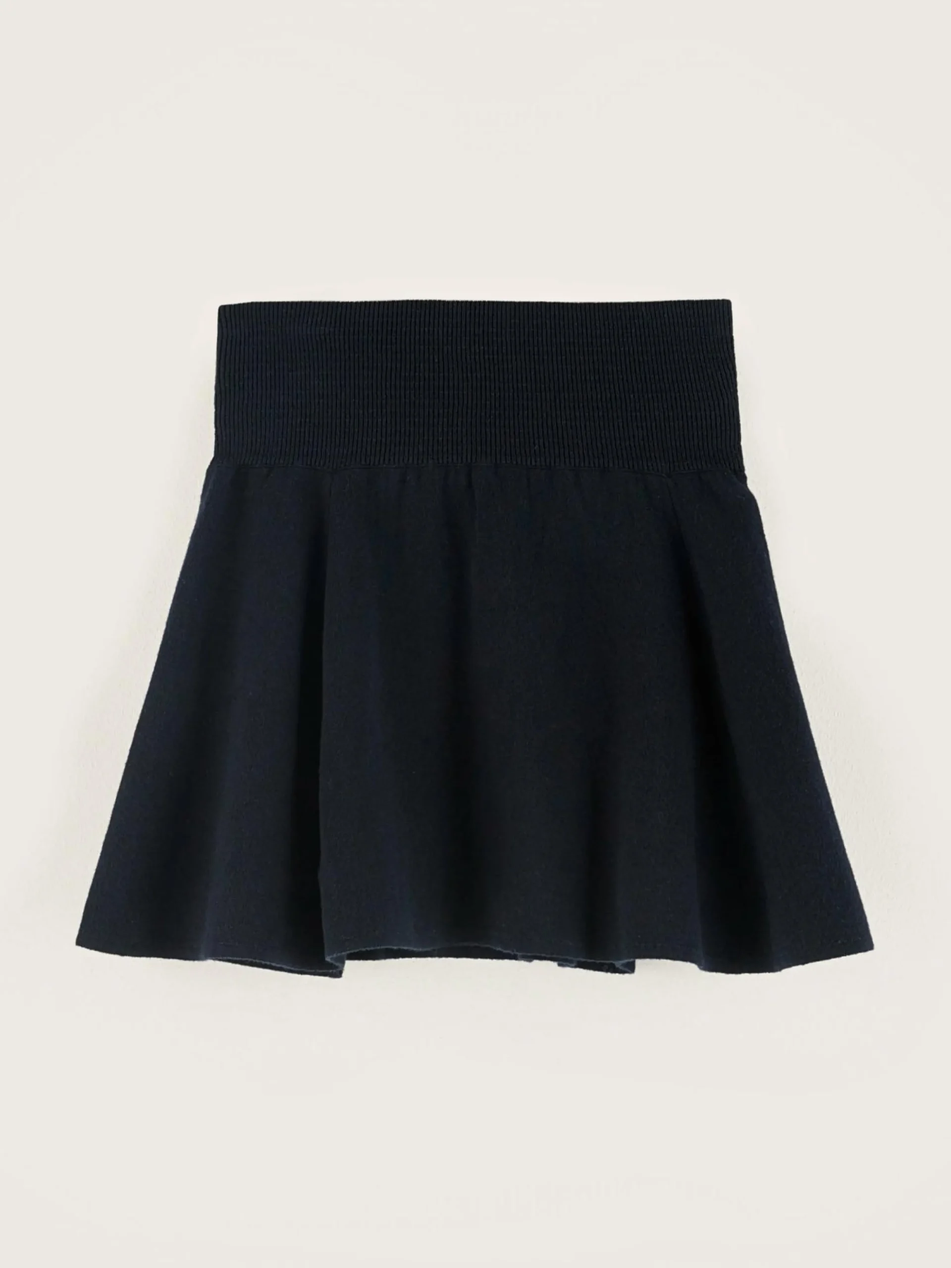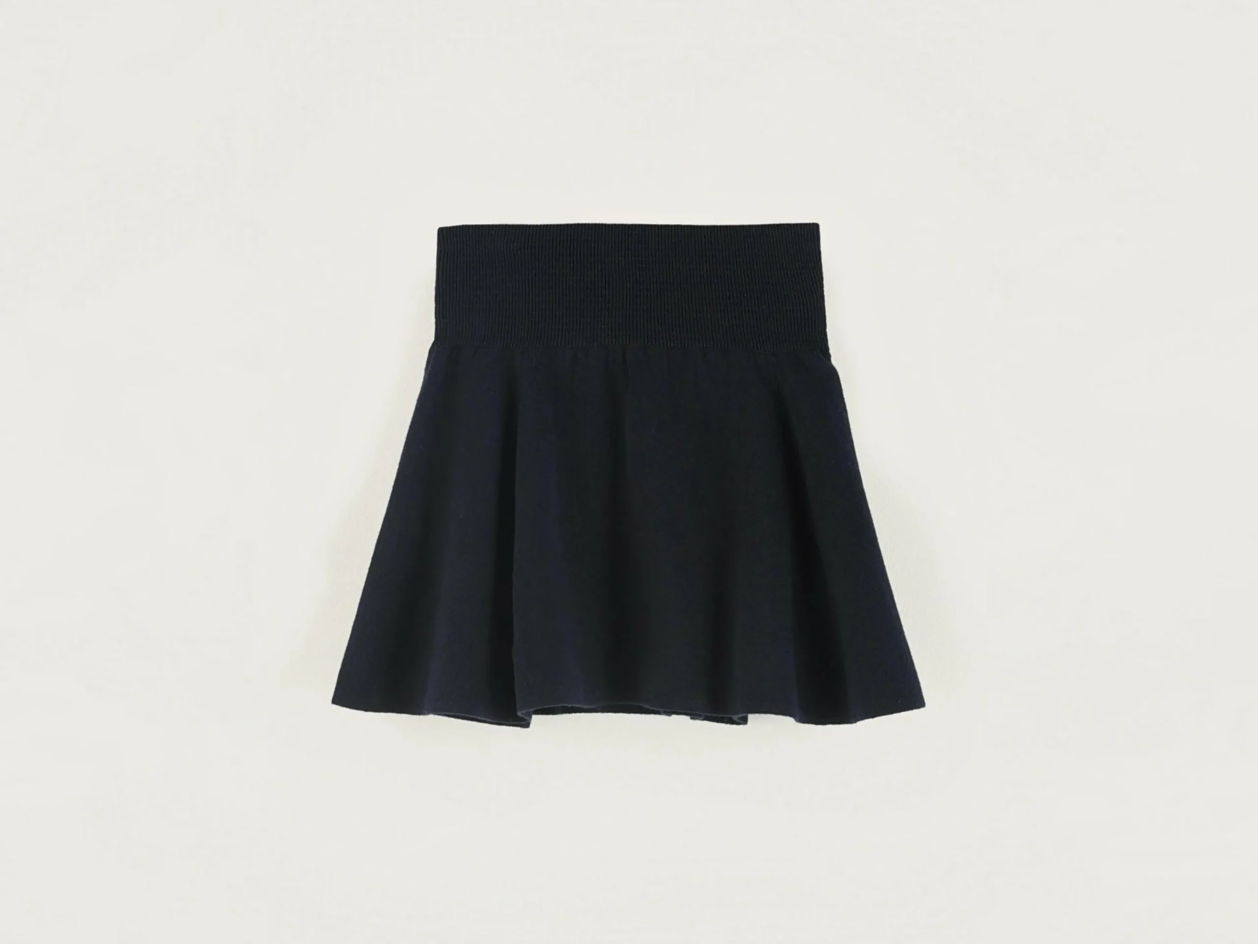 Minirok met brede elastische tailleband van marineblauw tricot.