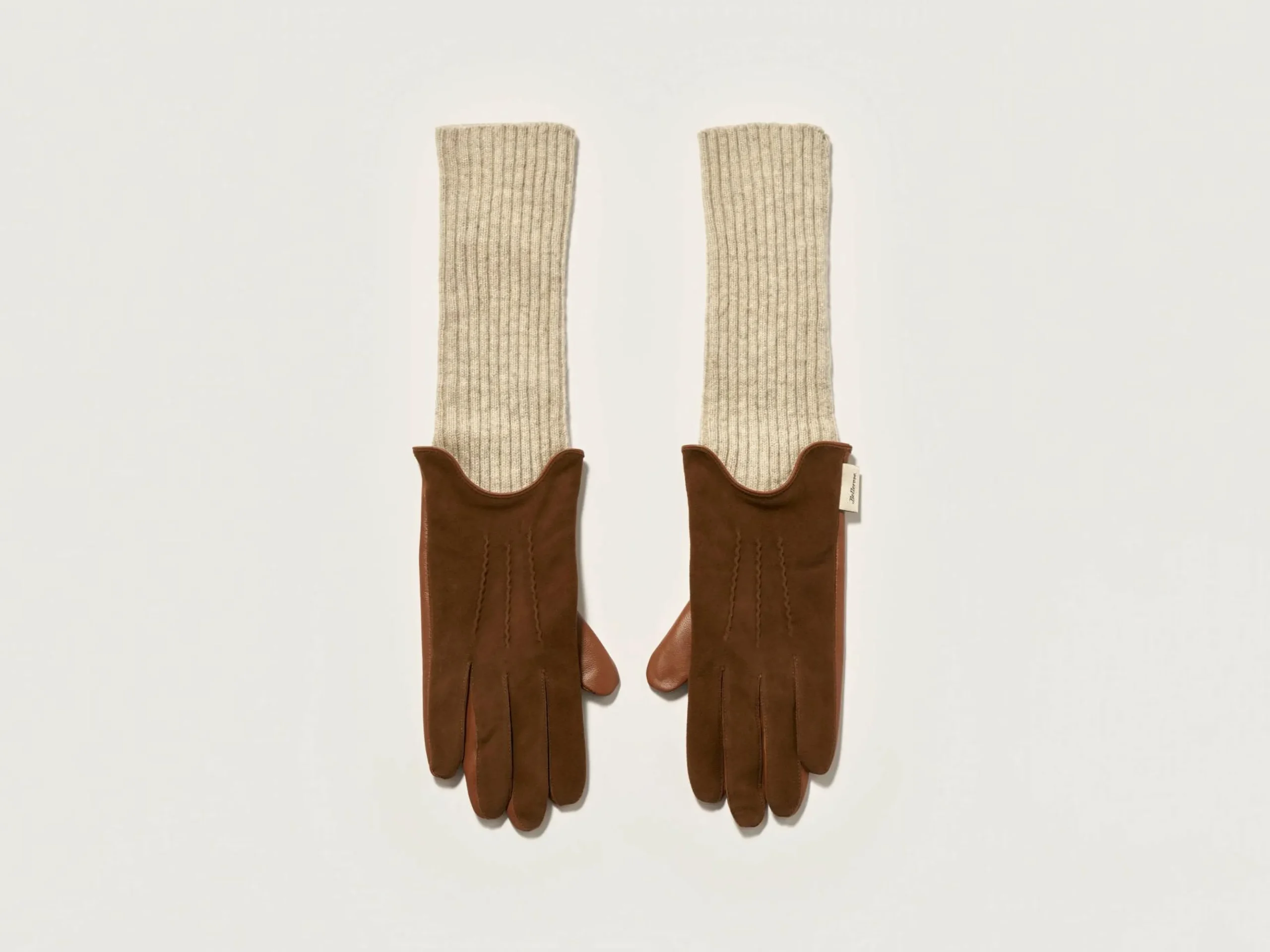 Bruine handschoenen met een bovengedeelte van suèdeleer en een contrasterende, ribgebreide strook aan de polsen.