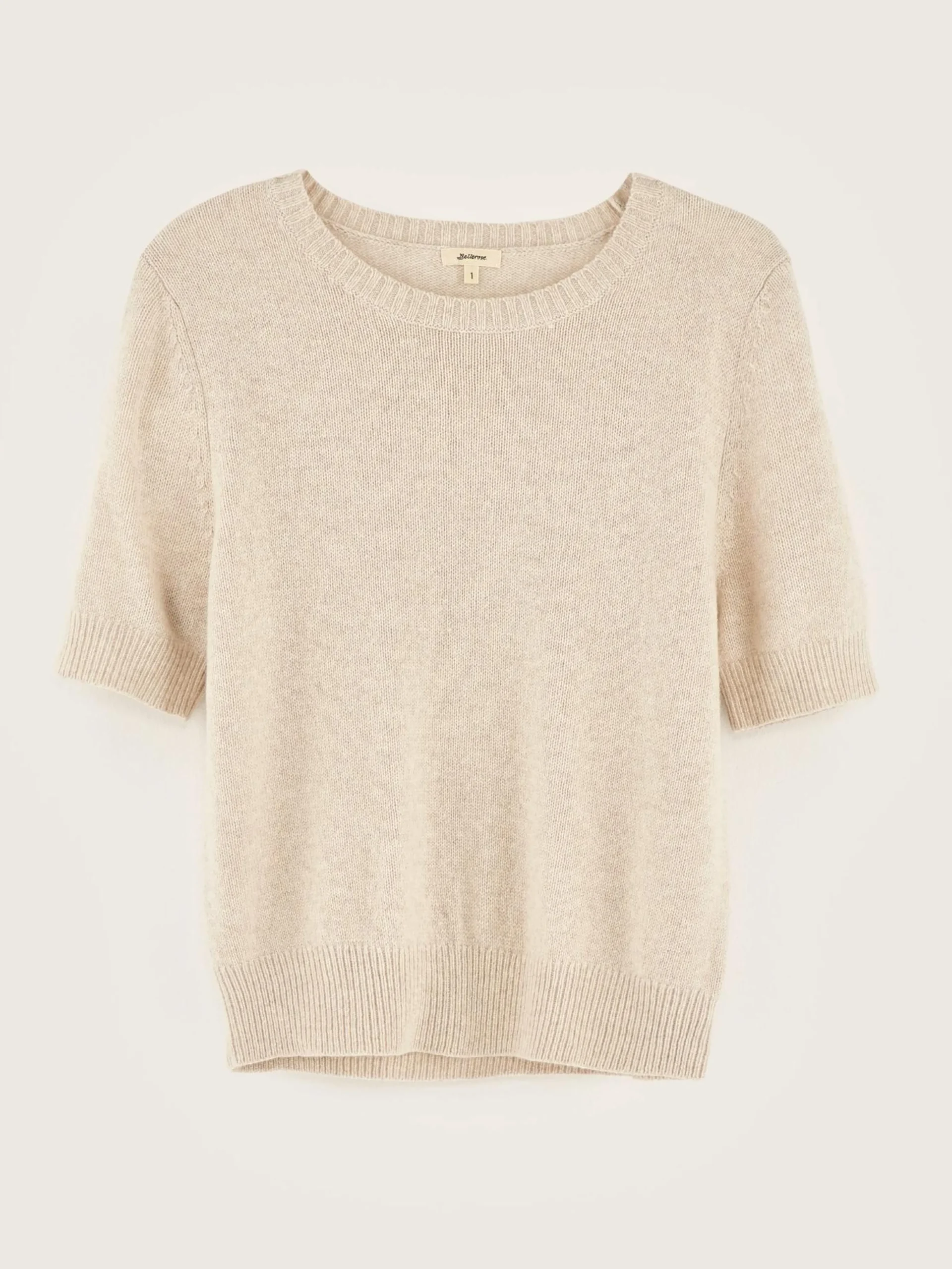 Aansluitende, beige gemĂȘleerde trui met korte mouwen.