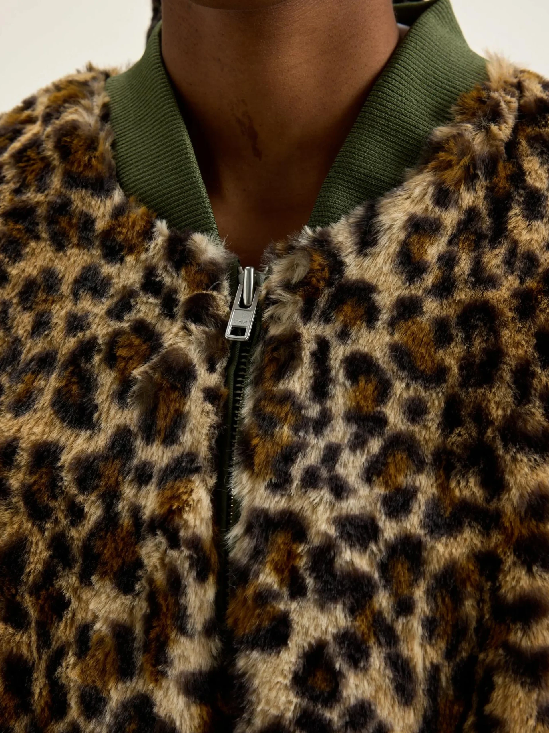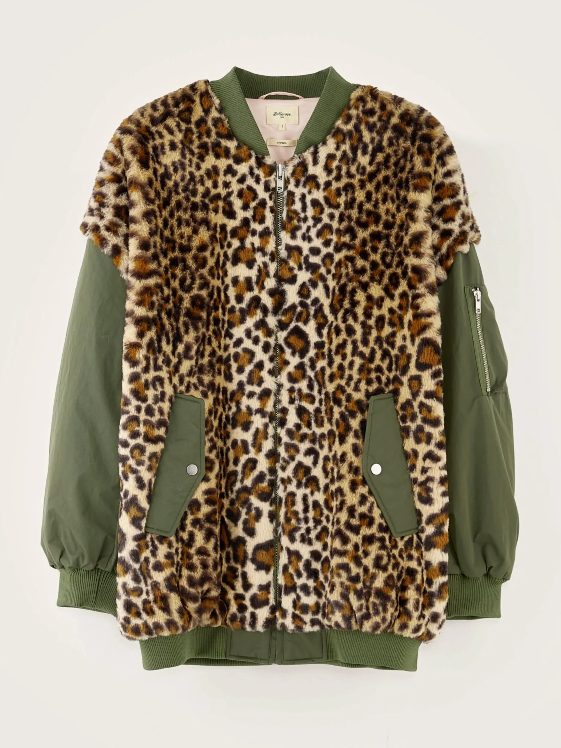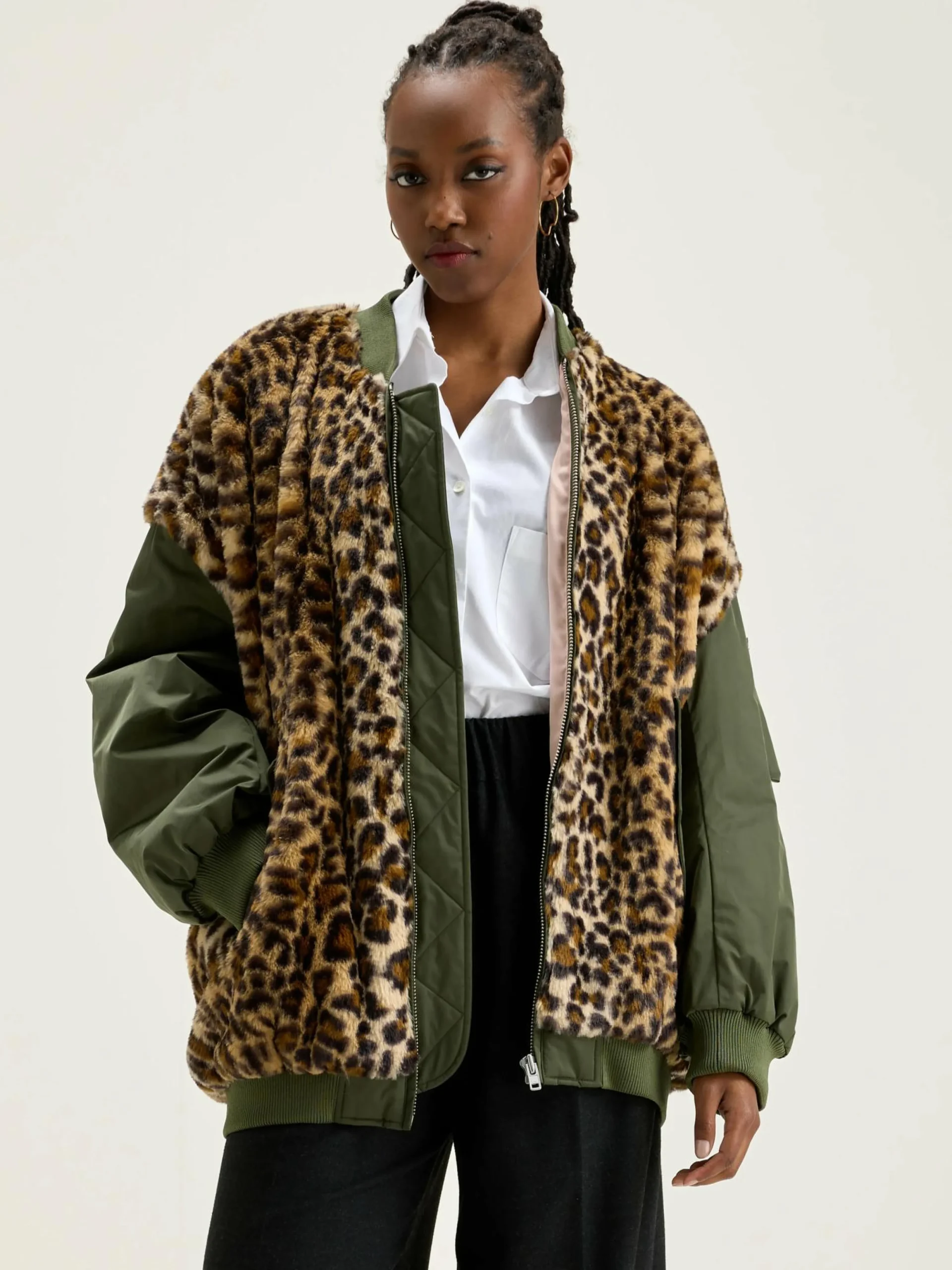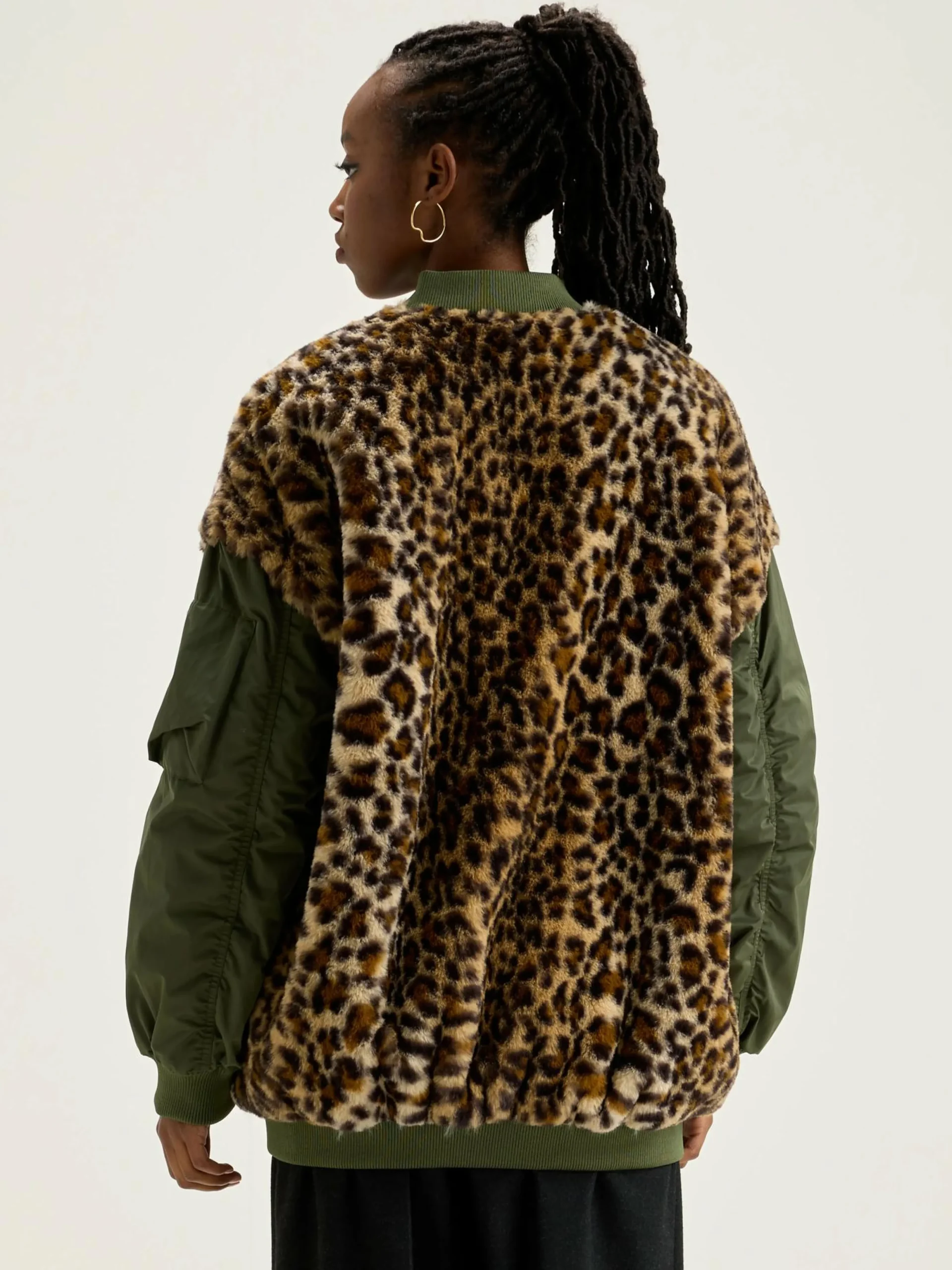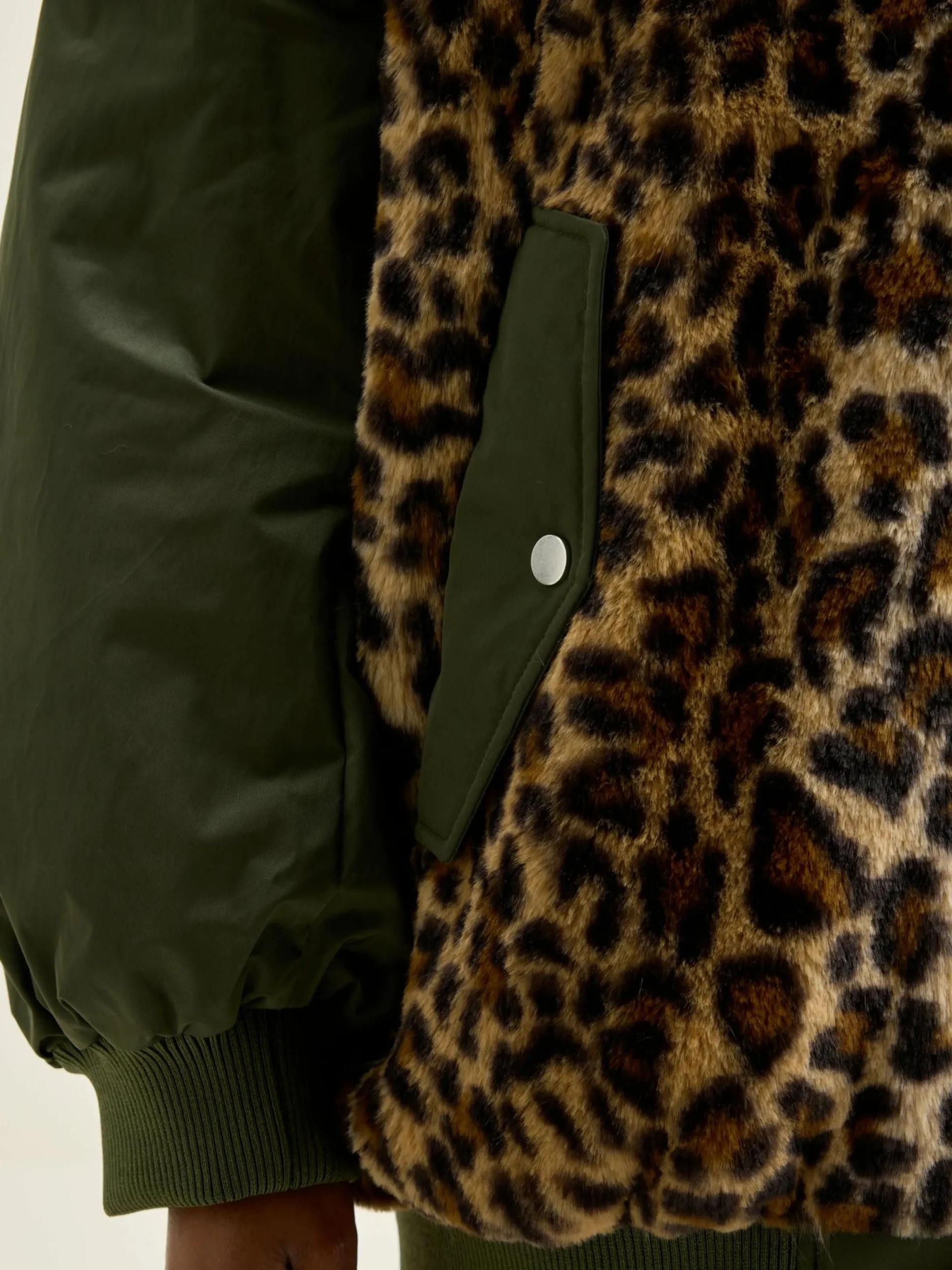 Oversizede bomberjas met body van nepbont met luipaardprint en mouwen van kaki satijncanvas.