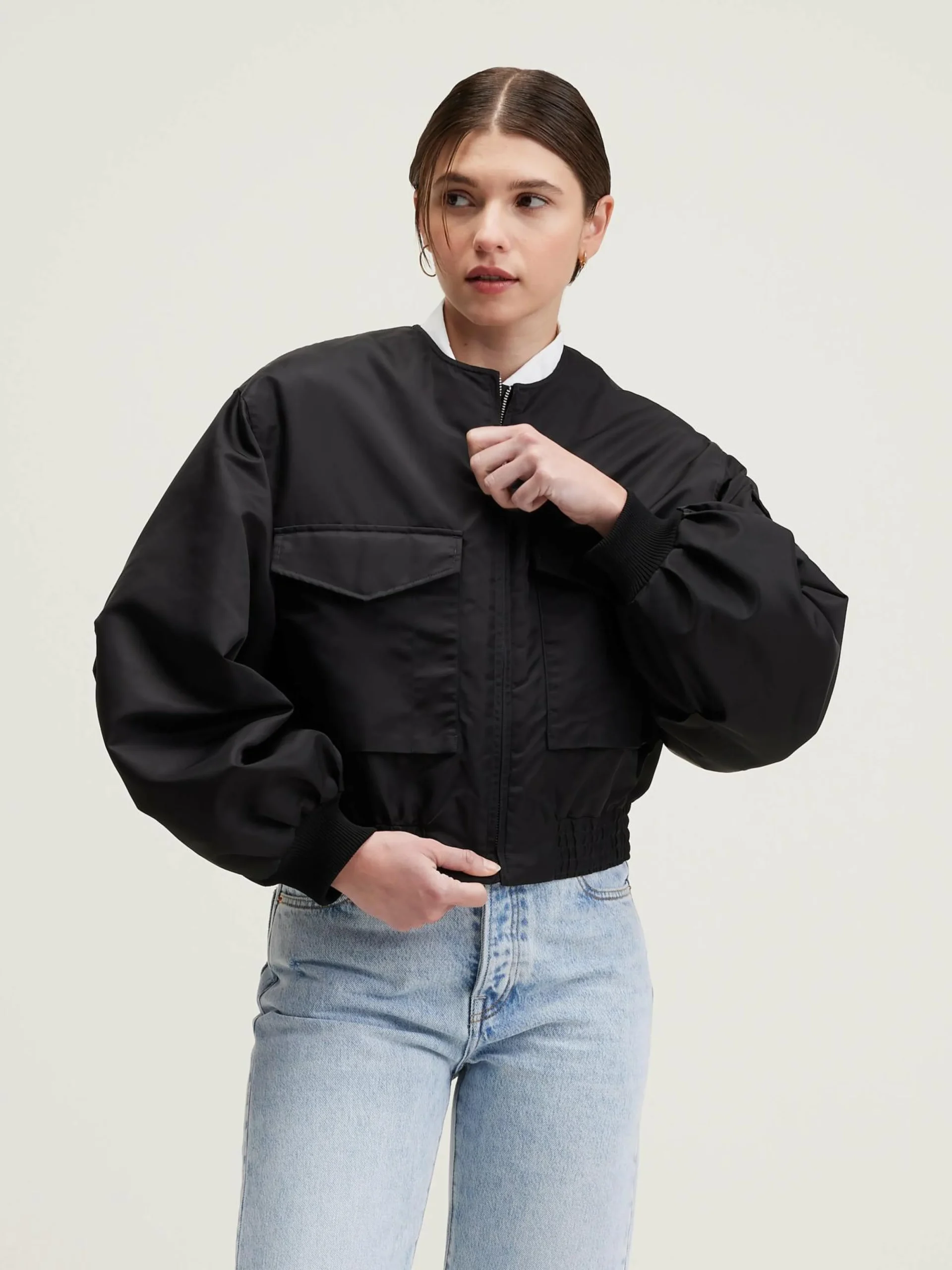 Kraagloos pilotenjack van off-black canvas.