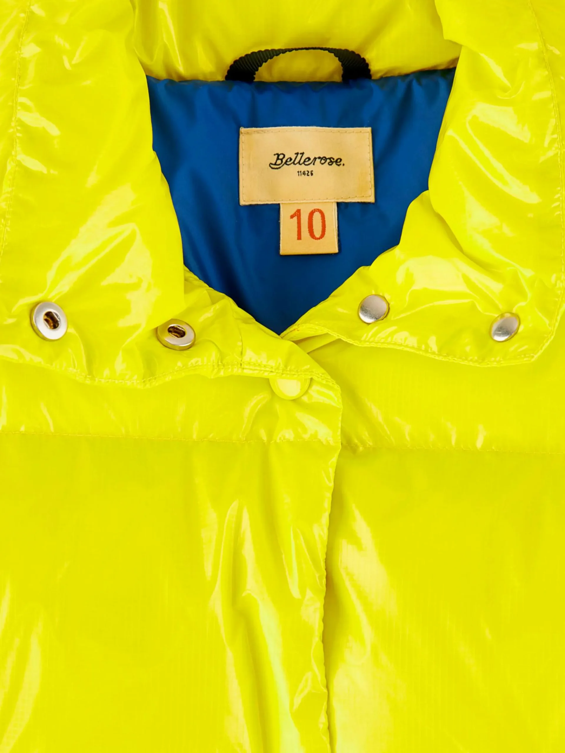Gloeiend gele pufferjas met ritssluiting vooraan, aanpasbare lengte dankzij drukknopen.