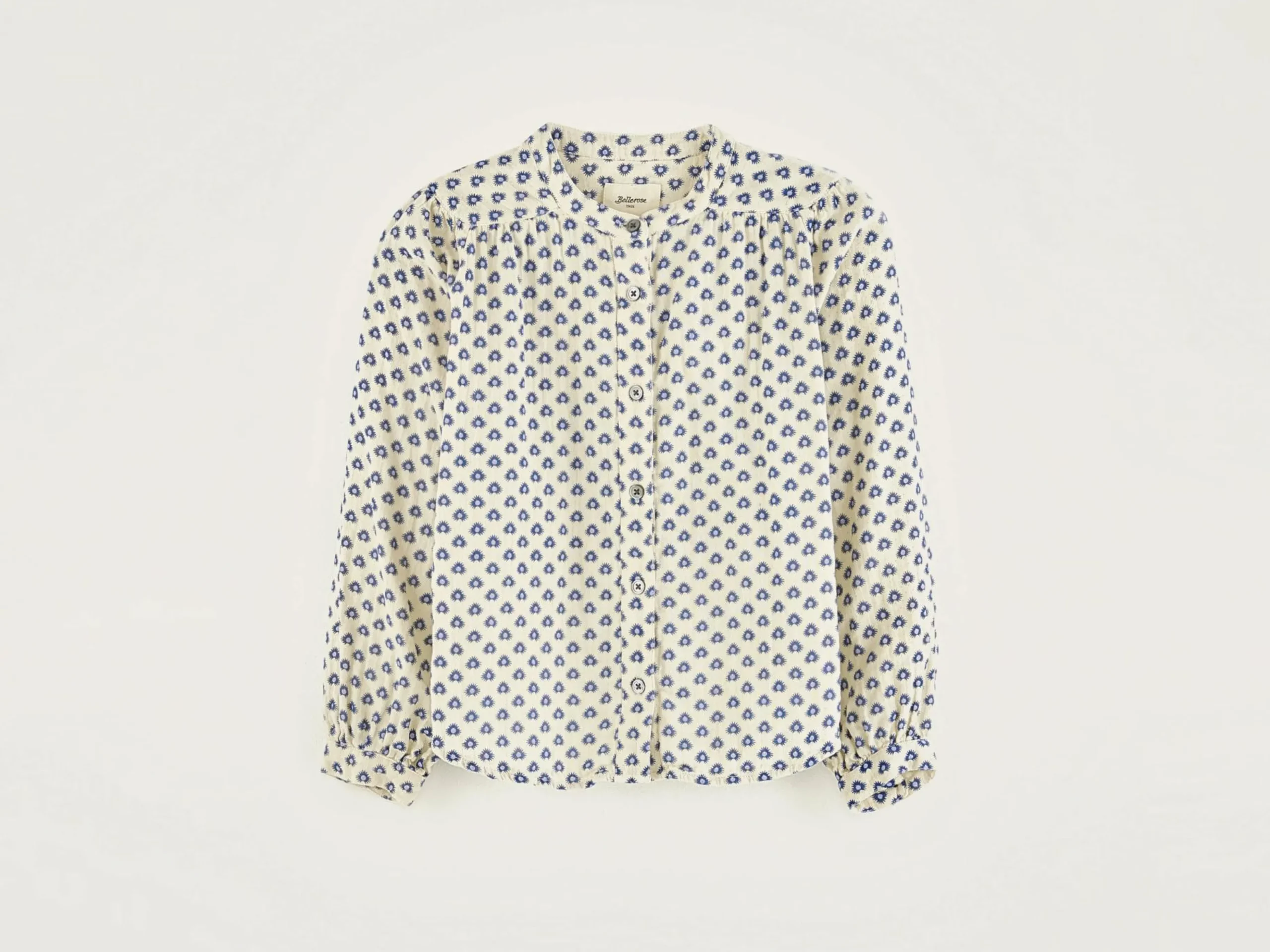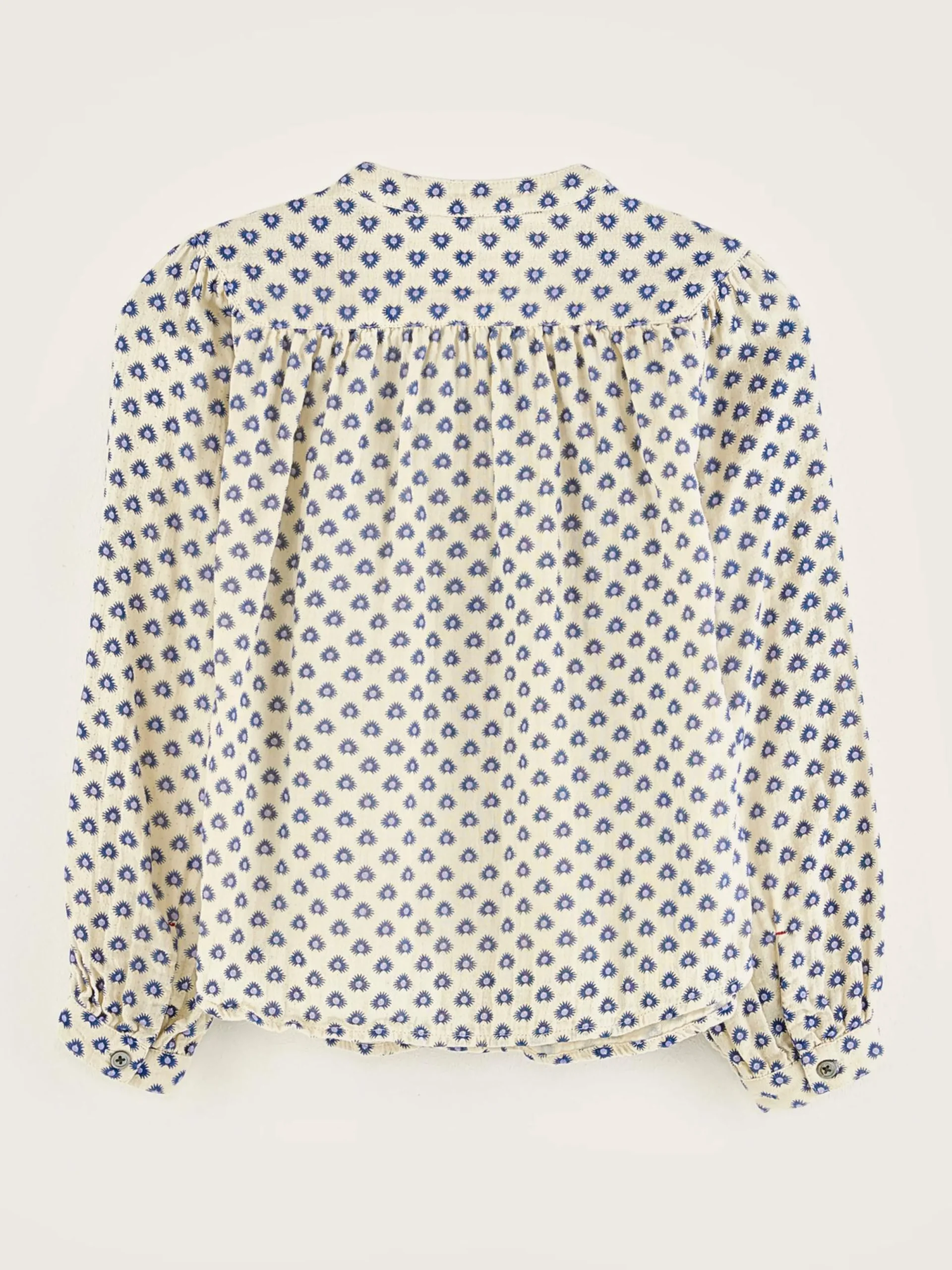 Klassieke, dubbel geweven katoenen blouse, volledig bedrukt met blauw en goud.