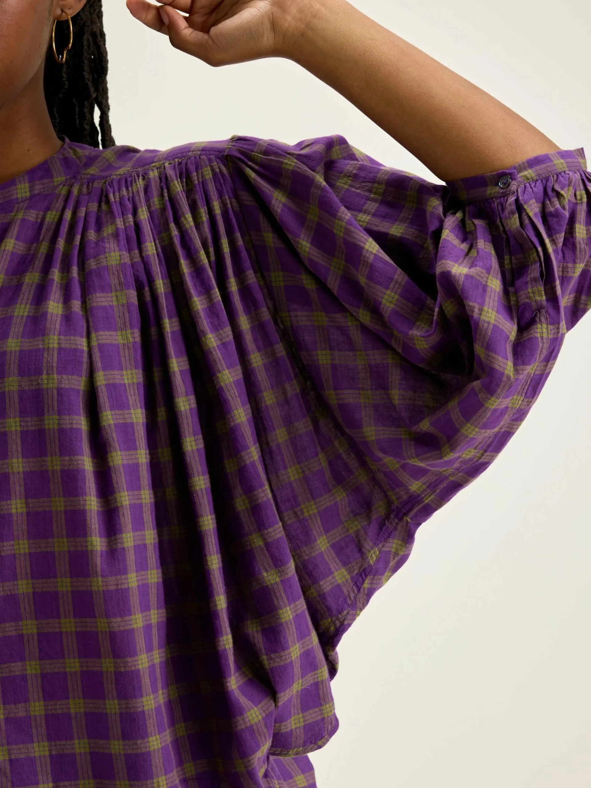 Oversizede blouse van katoen met paarse ruiten, met gefronste details.