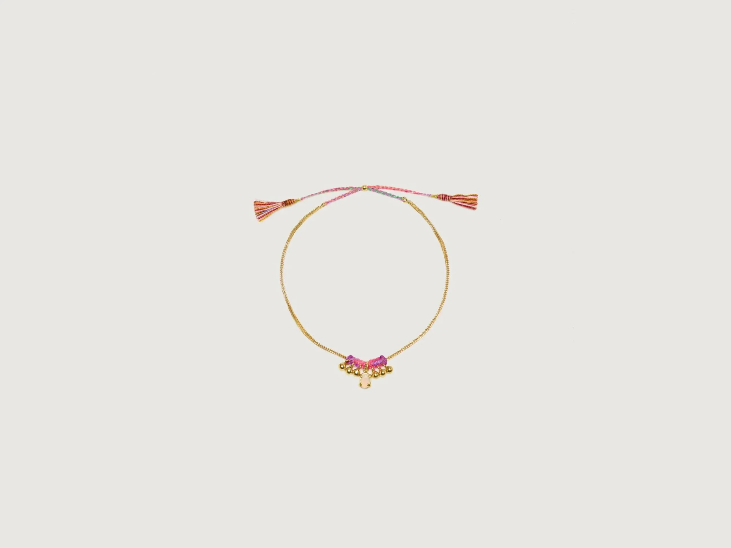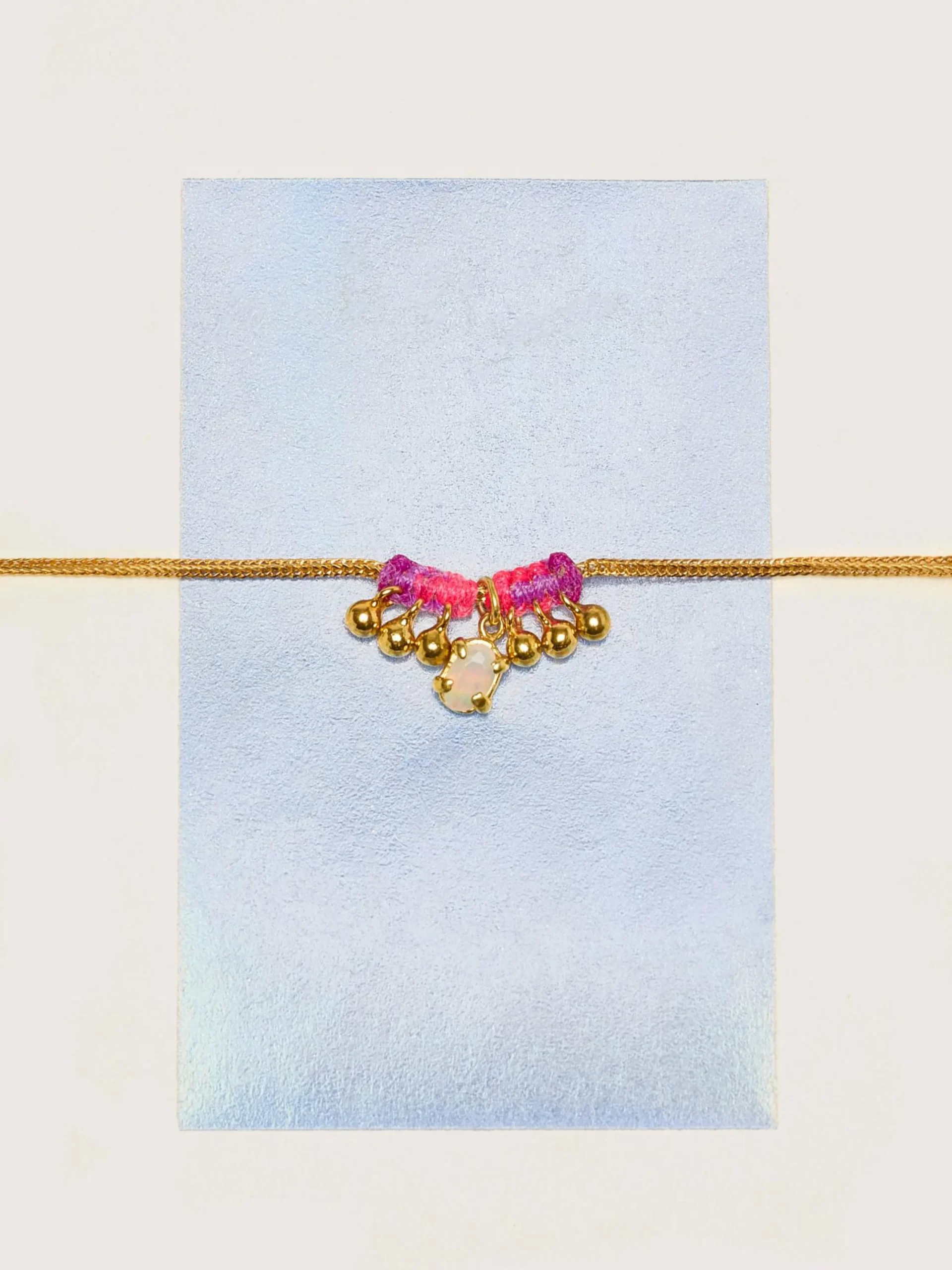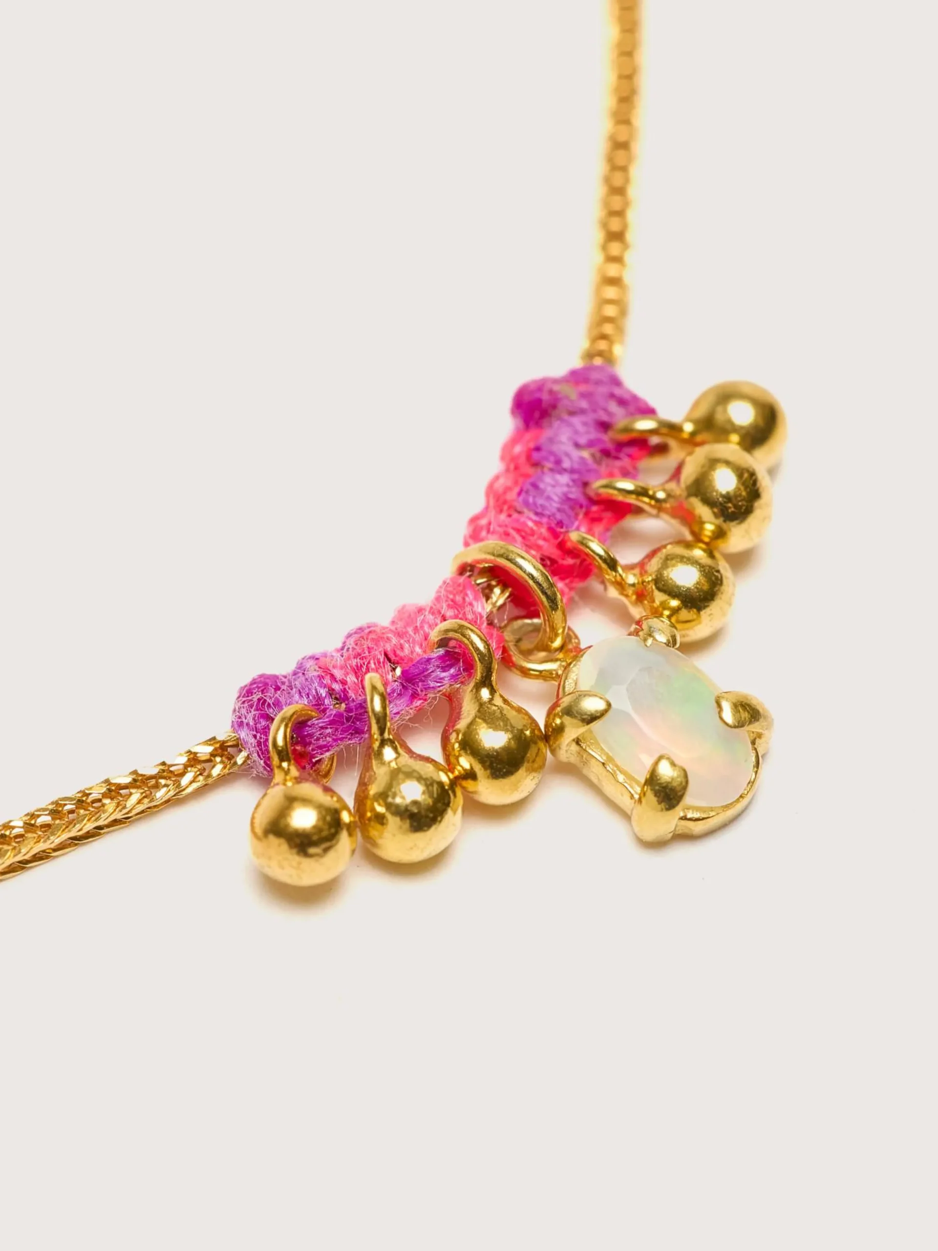 De Saira armband is een verstelbare verguld zilveren ketting versierd met een vergulde Afrikaanse Opaal hanger en gouden belletjes.