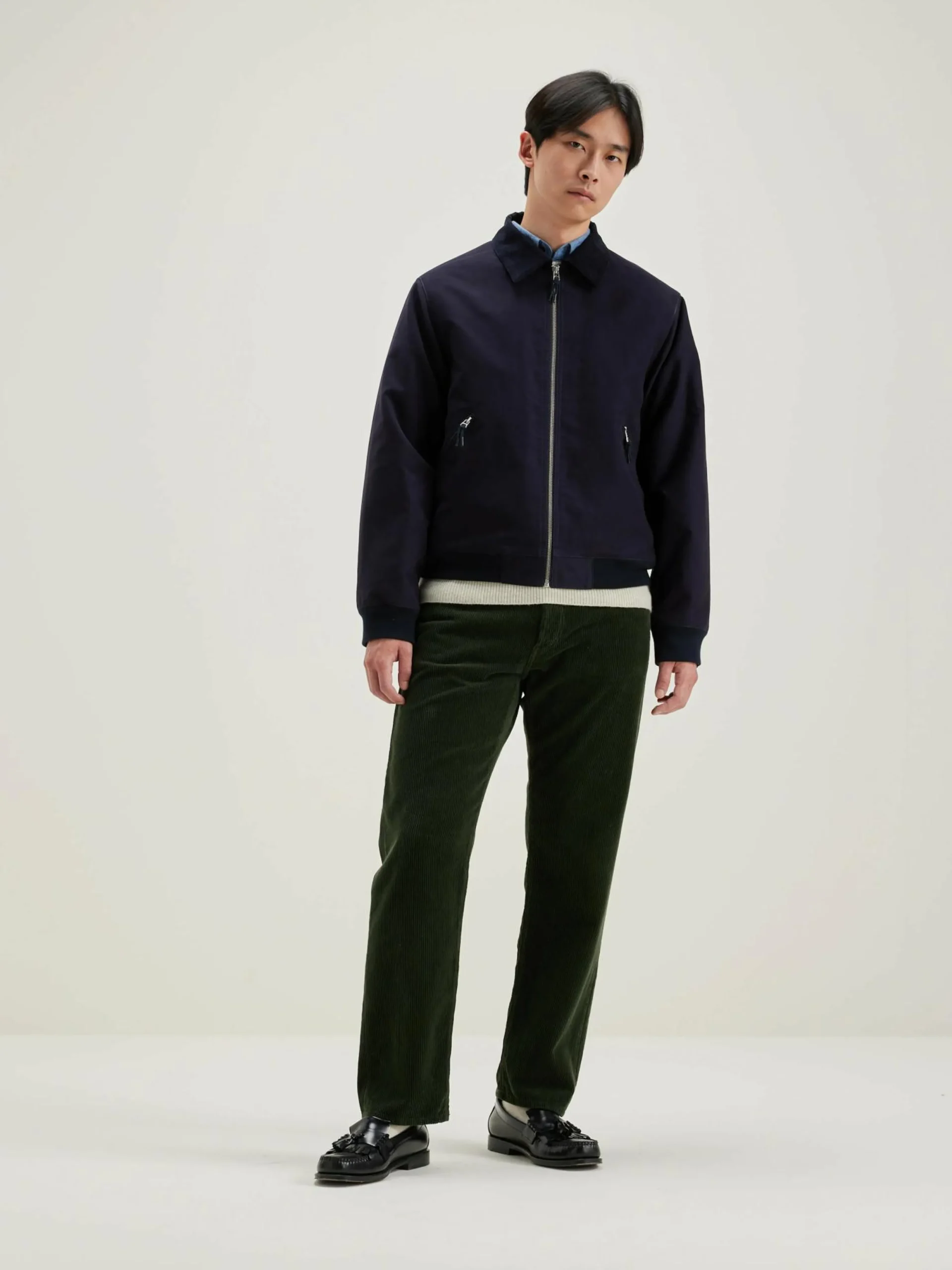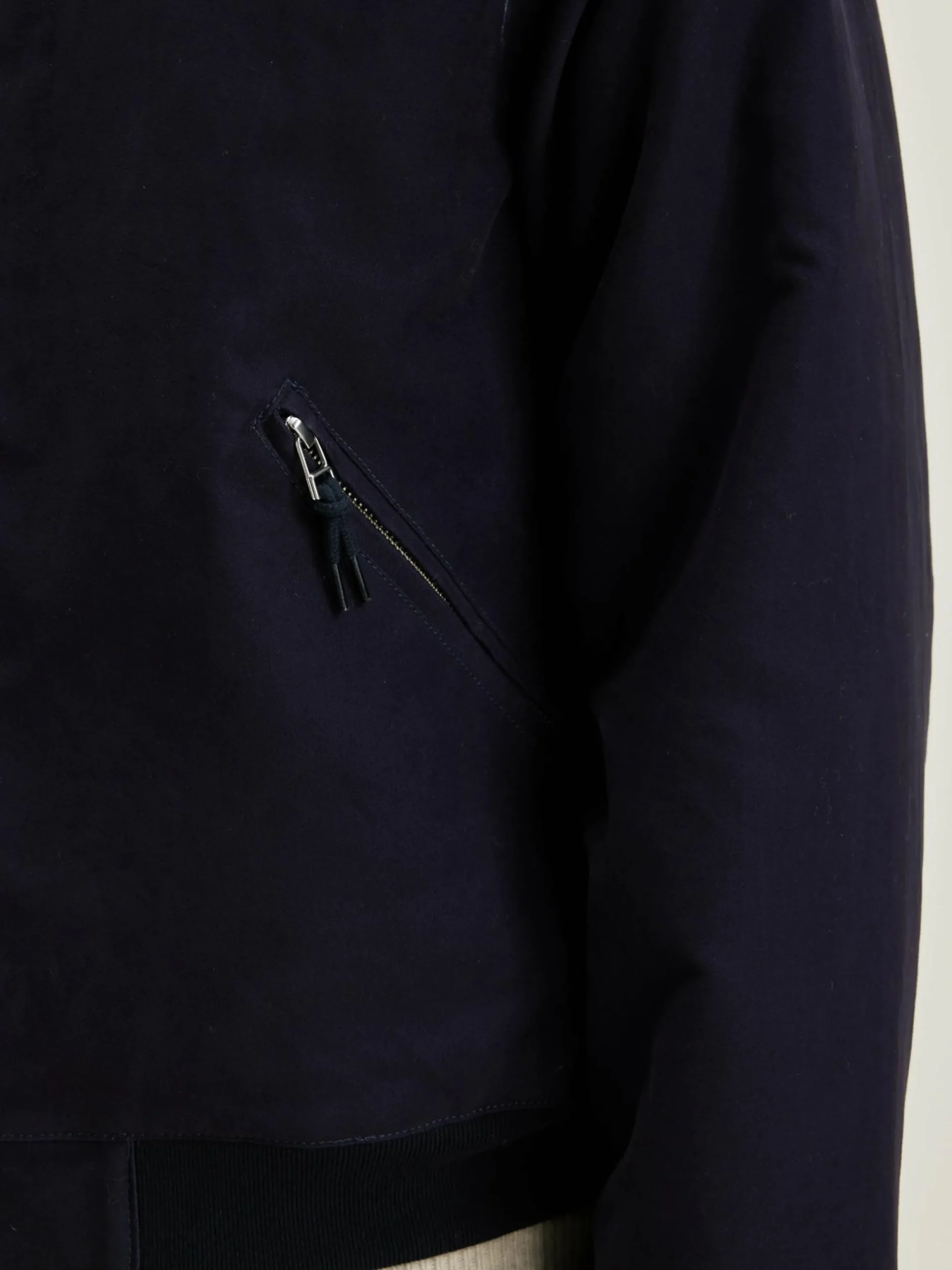 Klassiek golfjasje van zwartblauw moleskin katoen, met ritssluiting en gewone kraag.