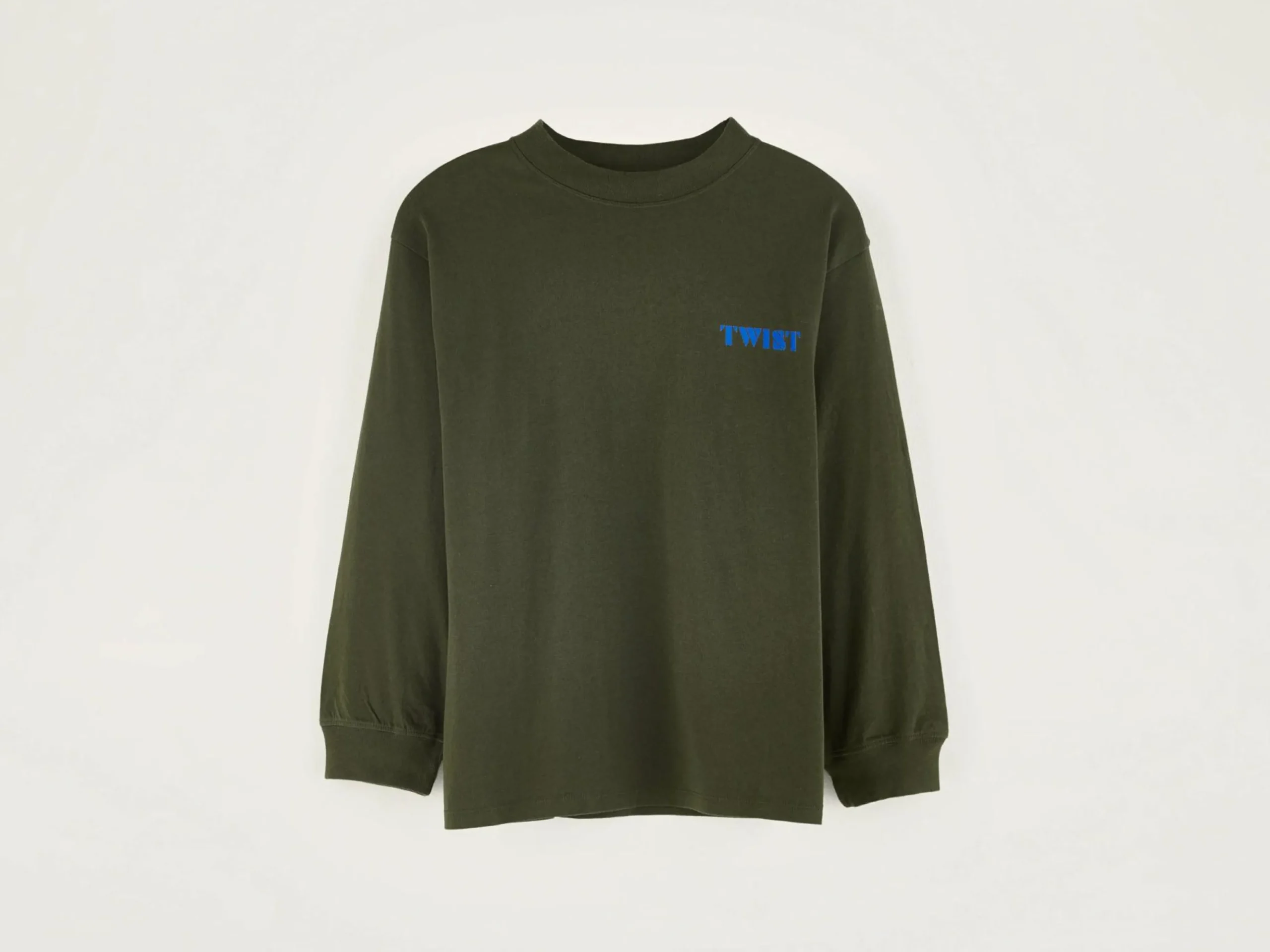 Comfortabel mosgroen T-shirt van geborstelde katoenjersey, met “Twist”-print op de borst.