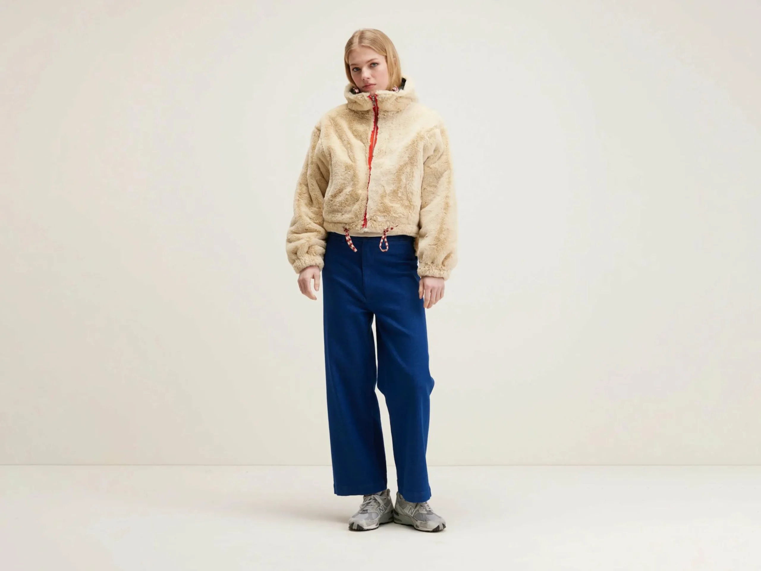 Omkeerbare jas van marineblauw canvaskatoen met capuchon en voering van ecru imitatiebont.