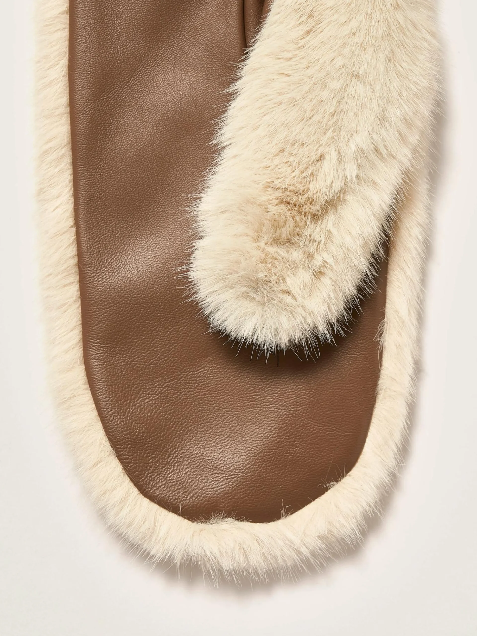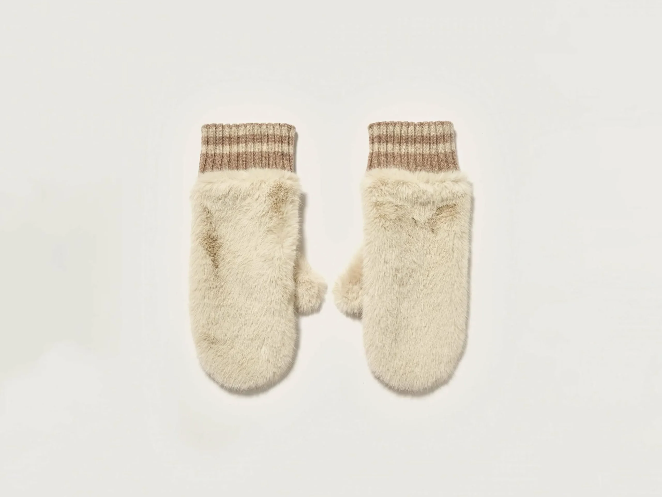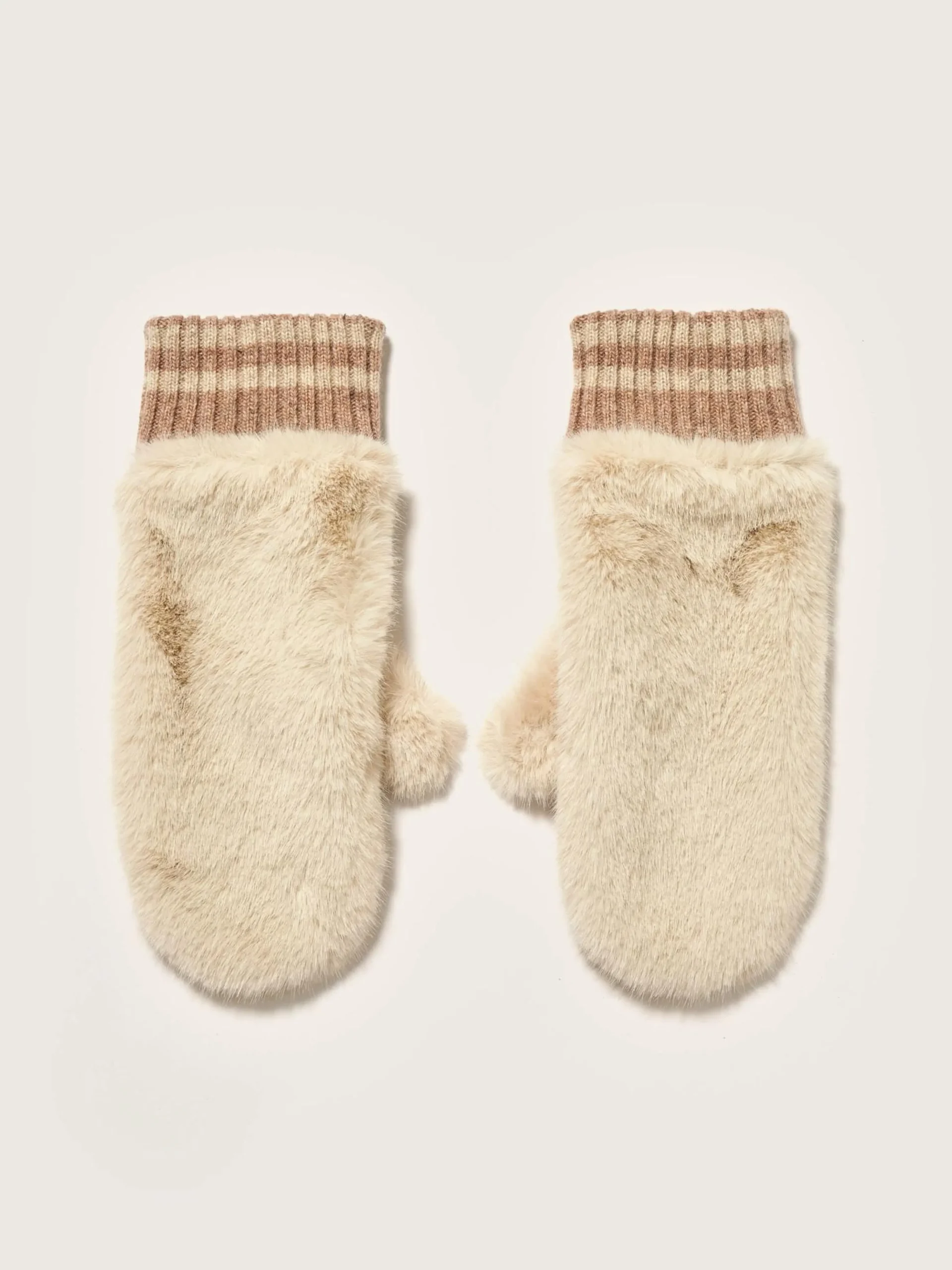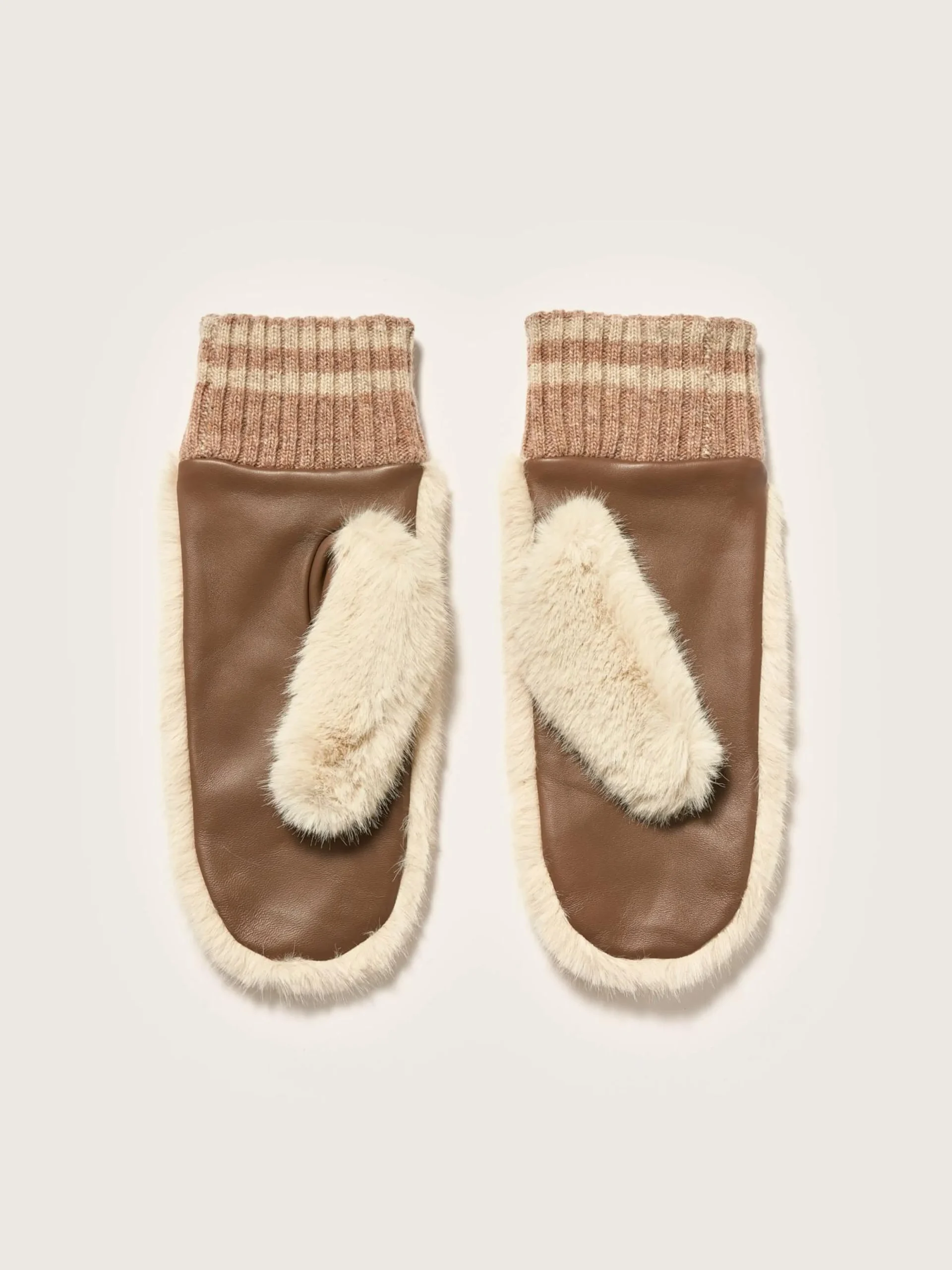 Wanten van lichtbeige nepbont, met leer ter hoogte van de handpalmen en een ribgebreide rand aan de polsen.