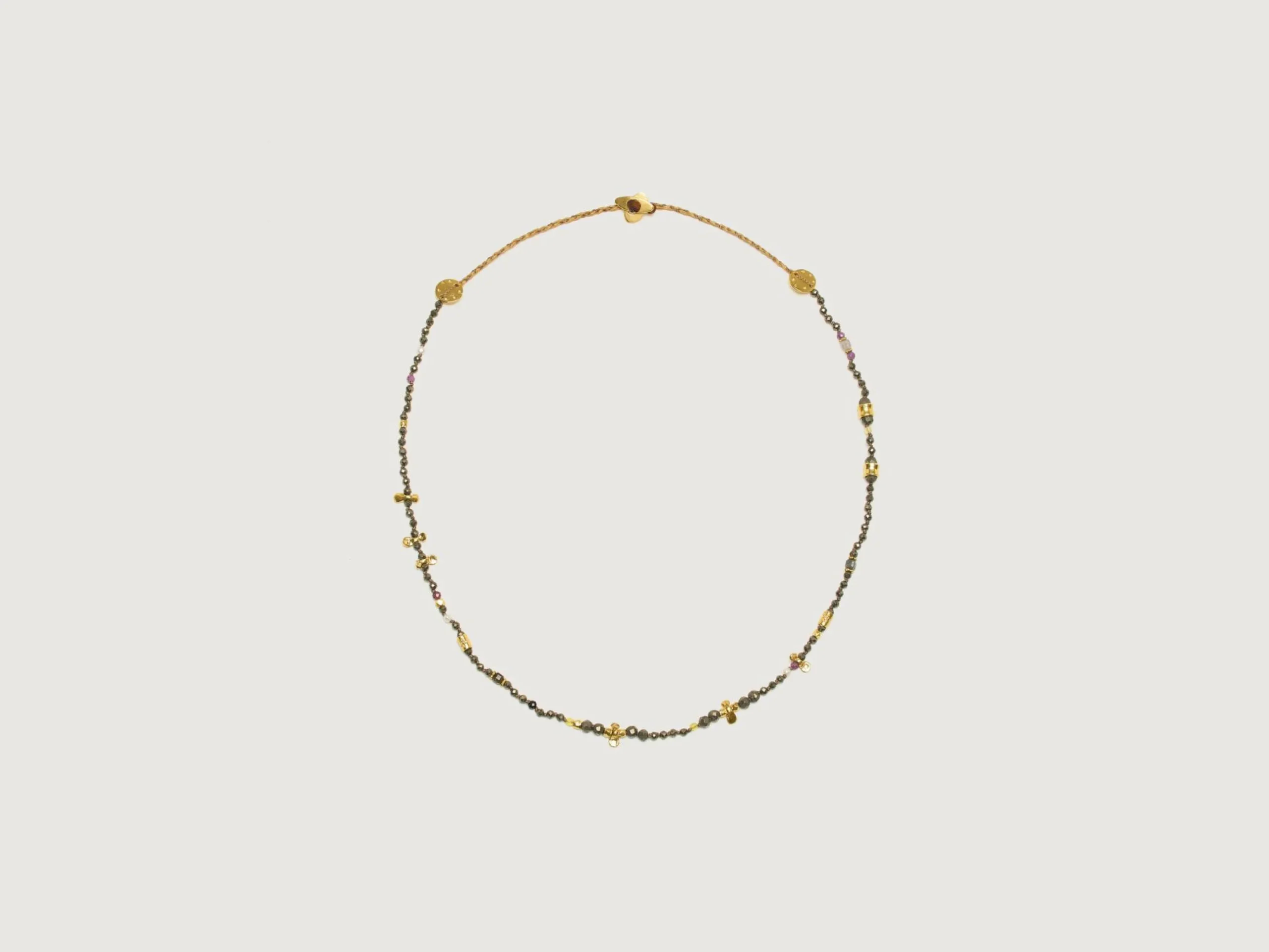 The Mary Gaitani Pyrite necklace is handmade in Greece with pyrite stones and 18k gold-plated charms on a waxed cord.