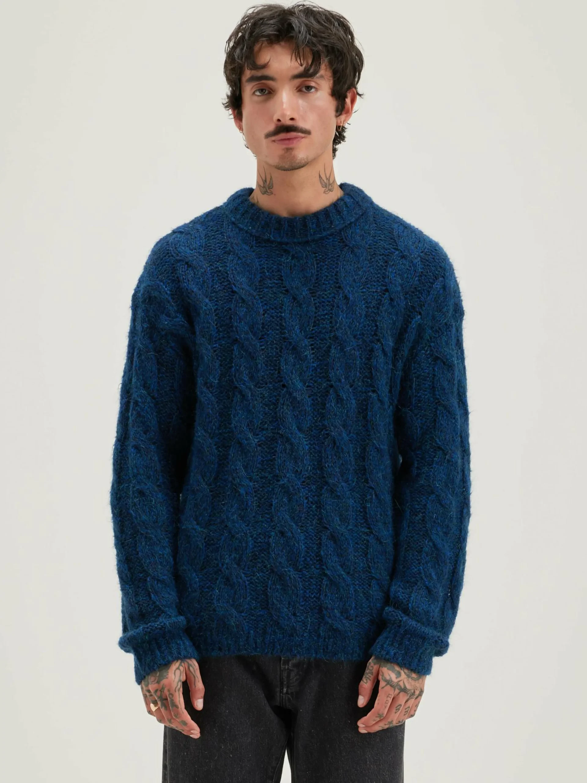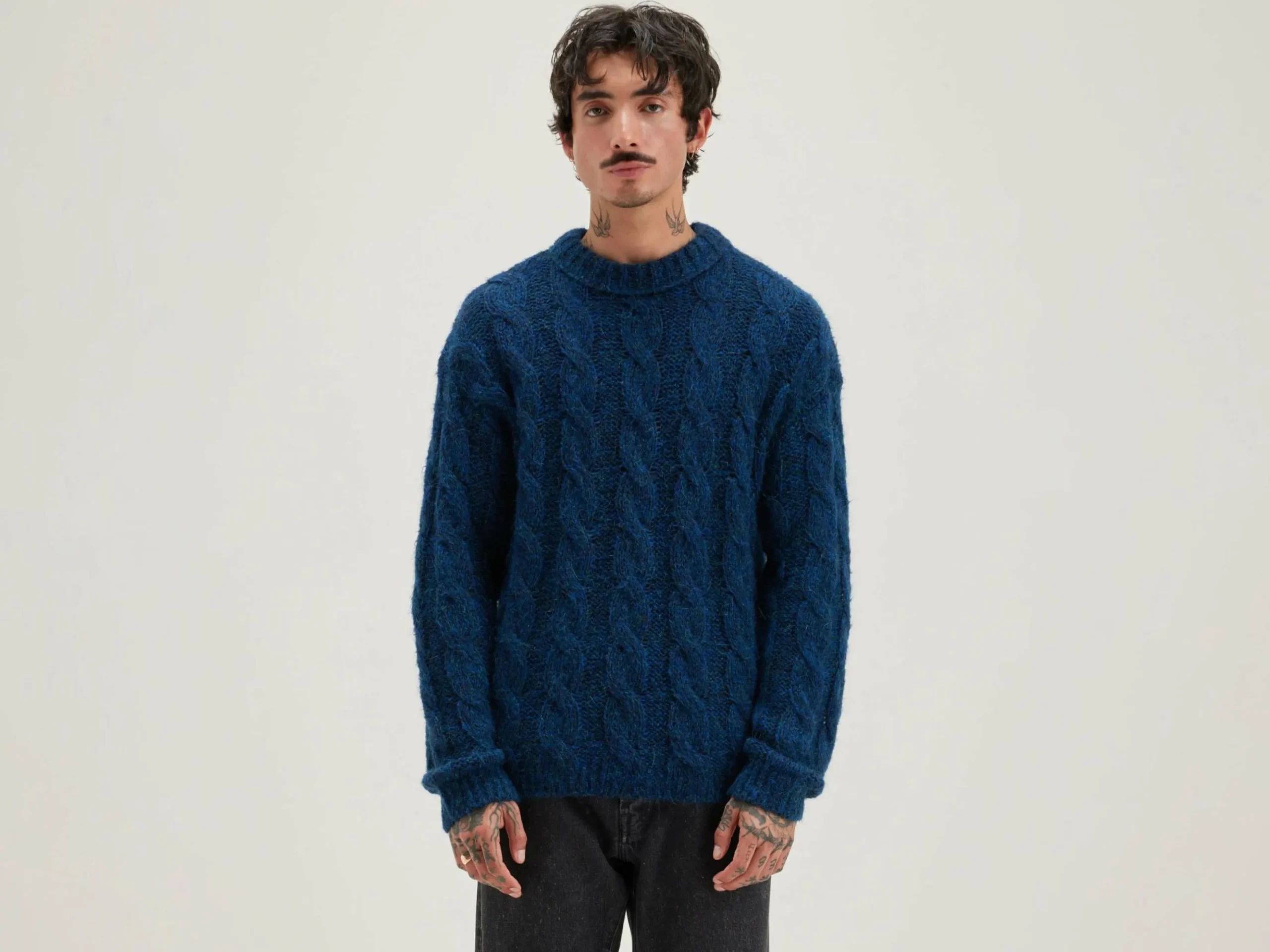 Klassieke, heideblauwe kabeltrui met mock neck.