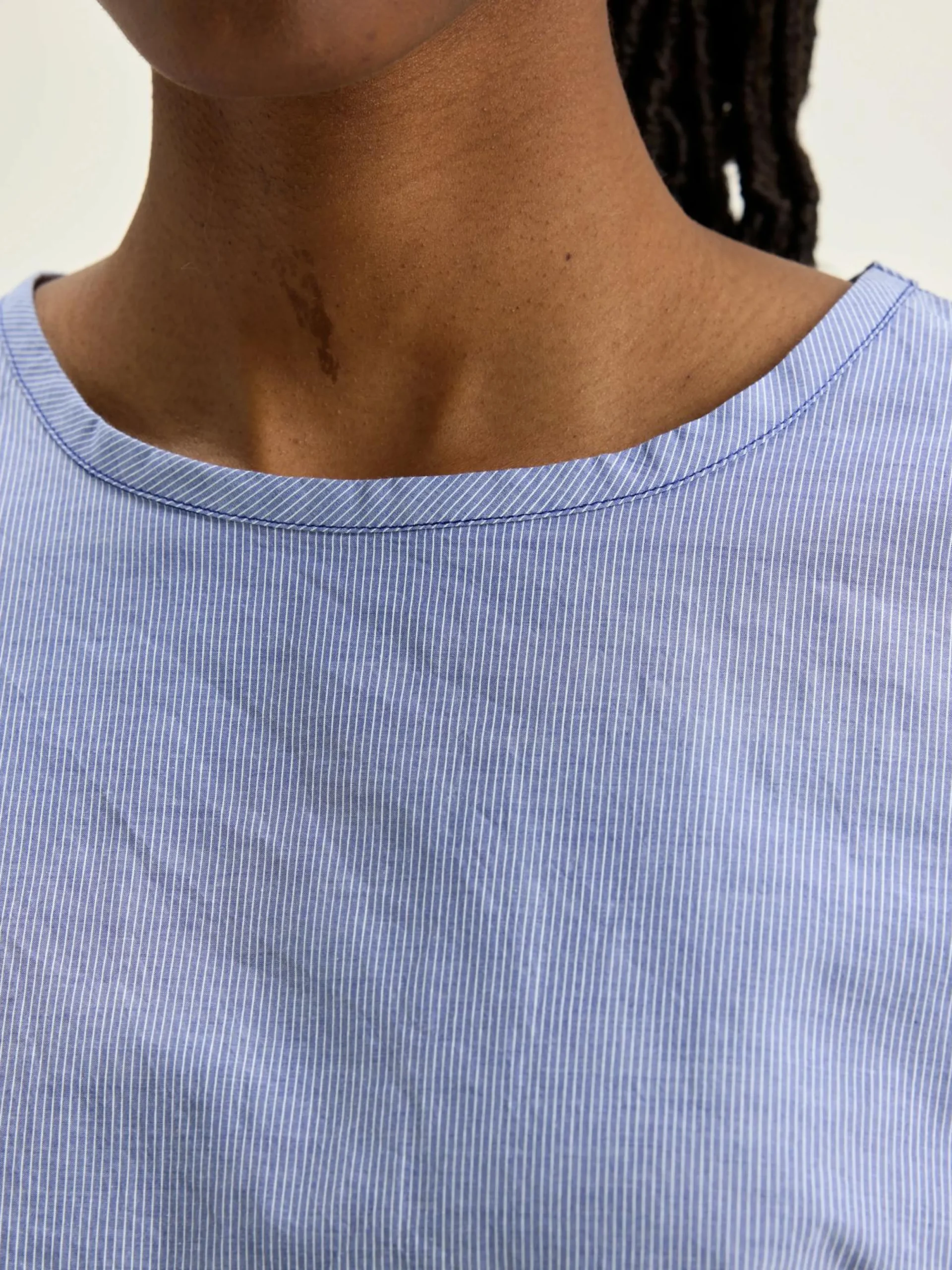 Oversizede, T-shirtachtige blouse van katoen met chambray blauwe en witte strepen.
