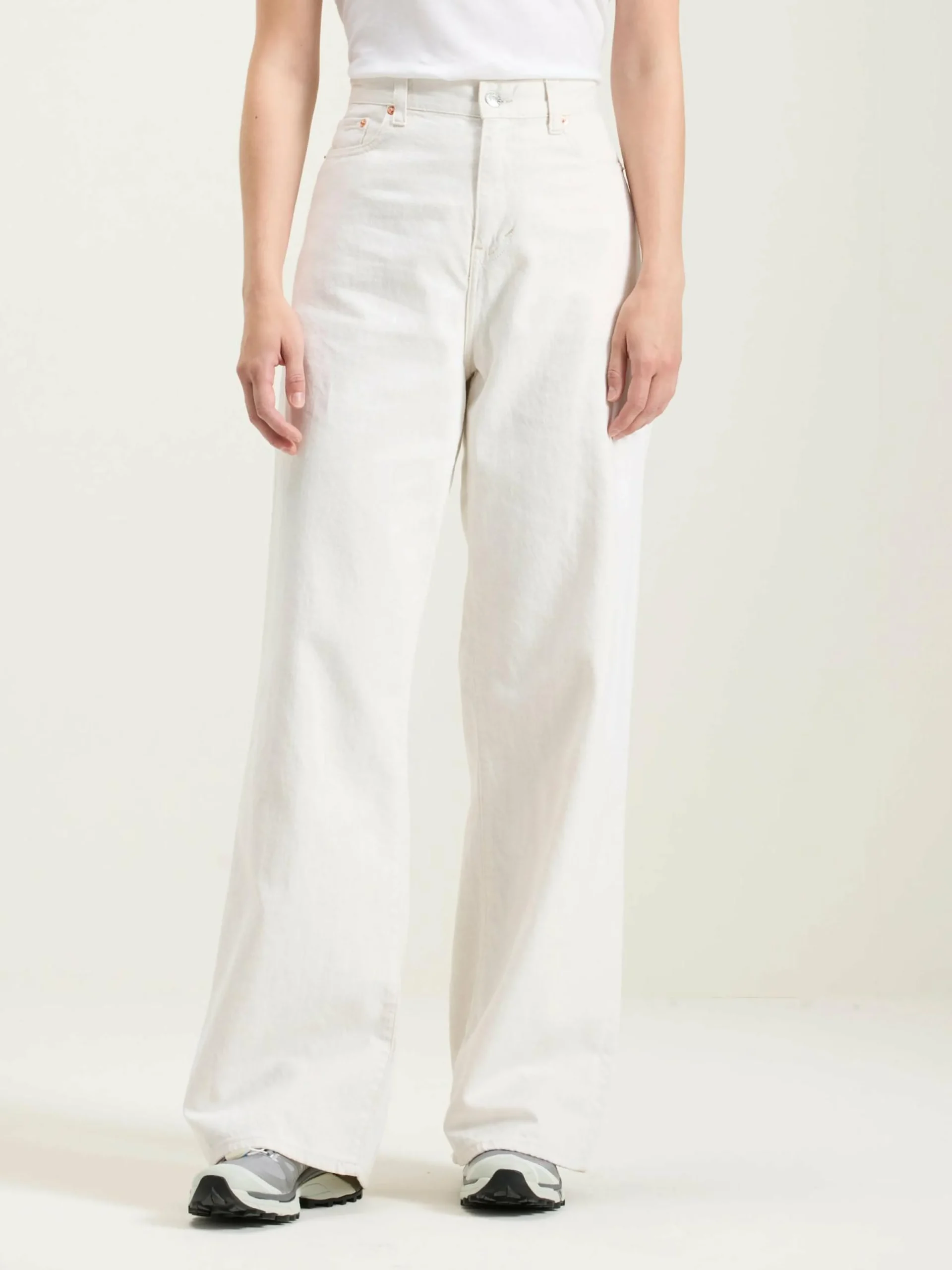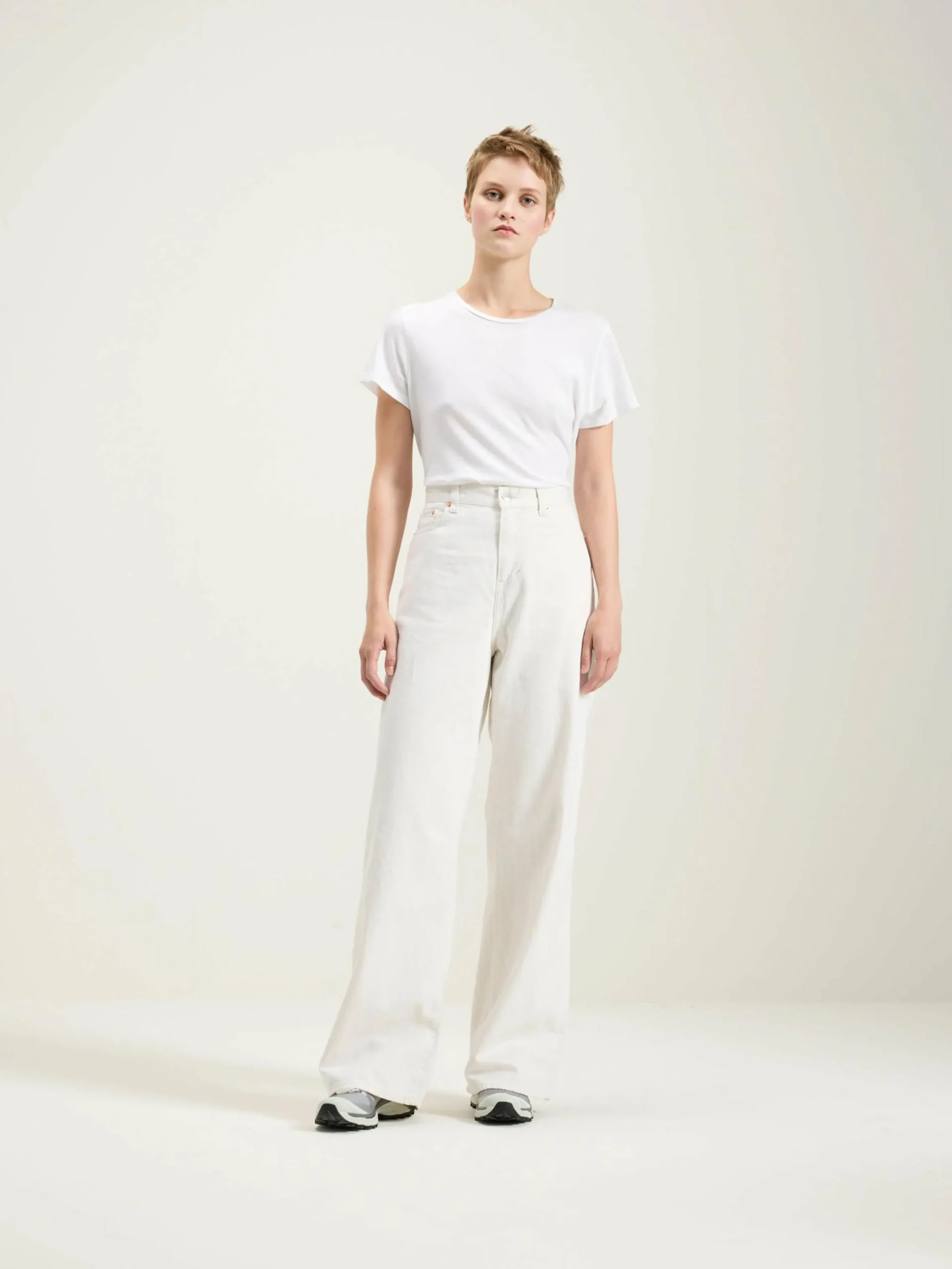Hoog getailleerde boyfriend jeans met wijde pijpen en distressed details op de zoom, in vintage wit katoen en linnen denim.