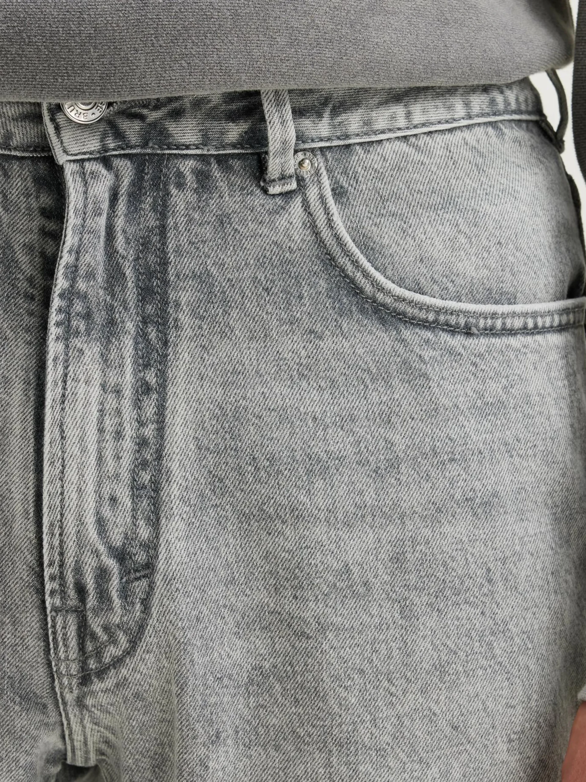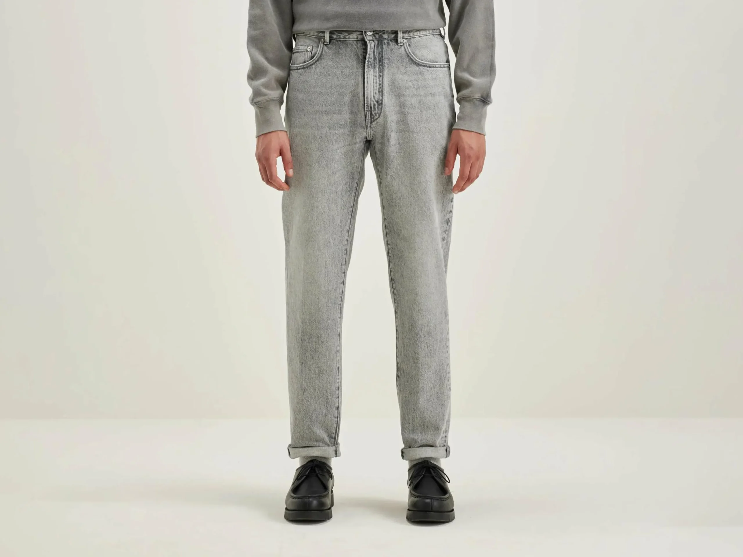 Slim fit jeans met hoge taille en taps toelopende pijpen, van versleten grijs katoendenim.