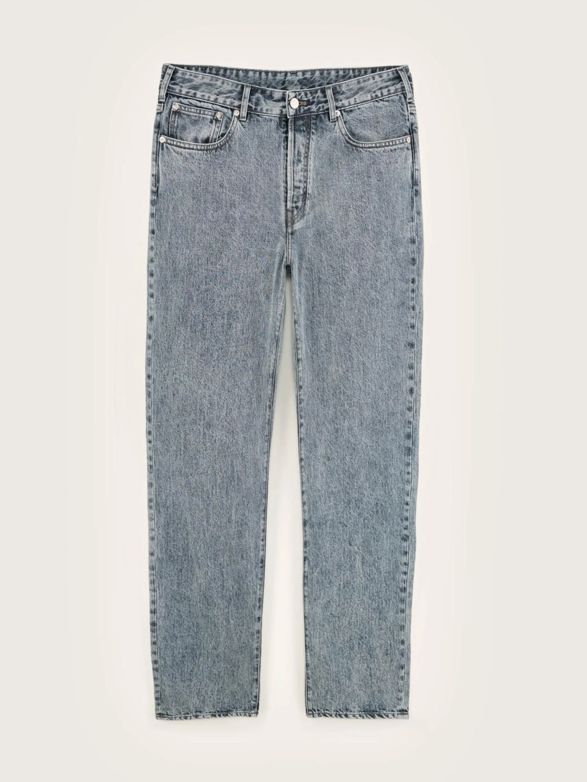 Comfortabele jeans met normale taille en taps toelopende pijpen, van versleten middenblauw katoendenim.