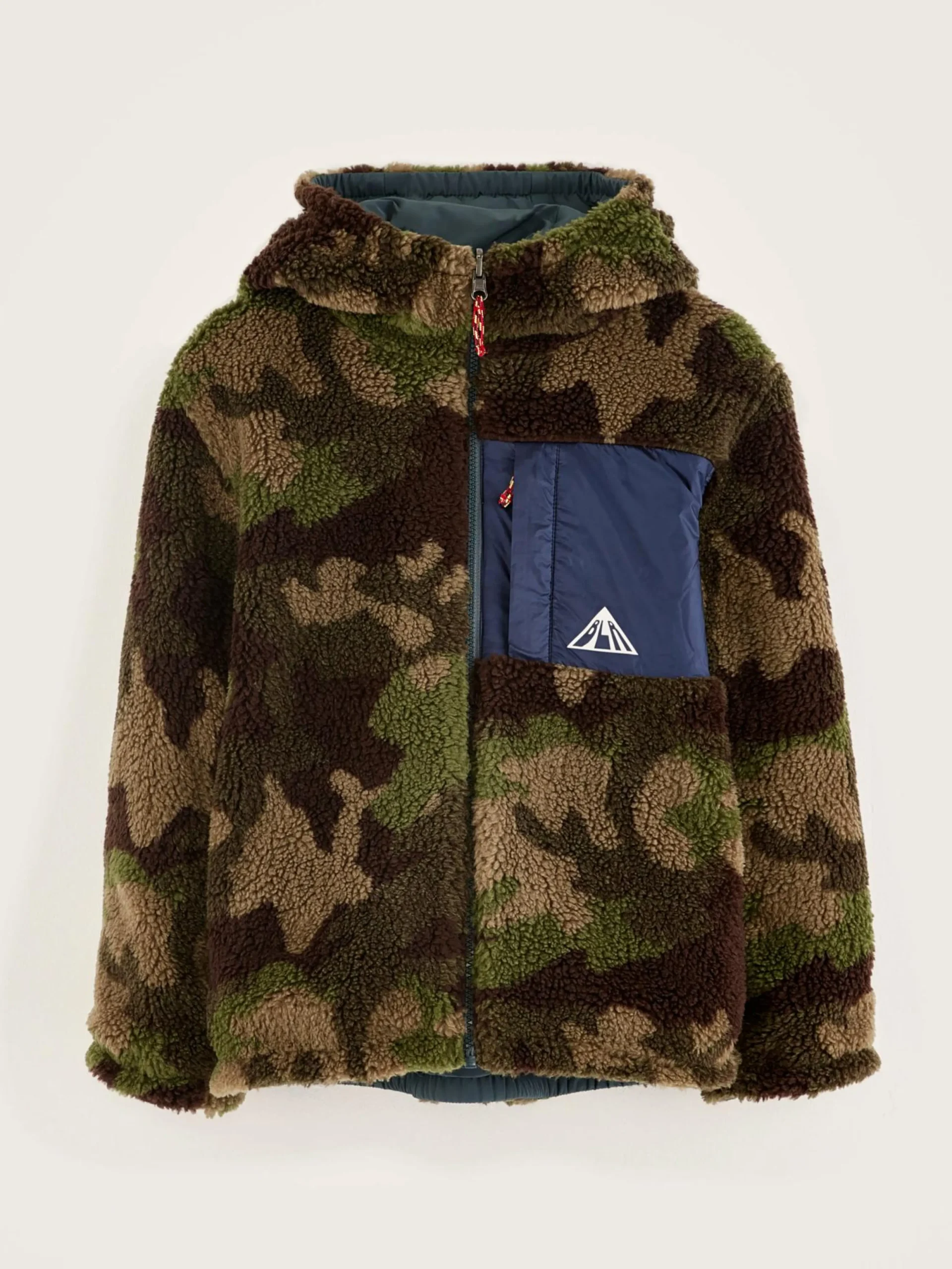 Klassieke, omkeerbare jas met capuchon, van waterafstotende, blauwgrijs ripstop textiel en teddystof met camouflageprint.