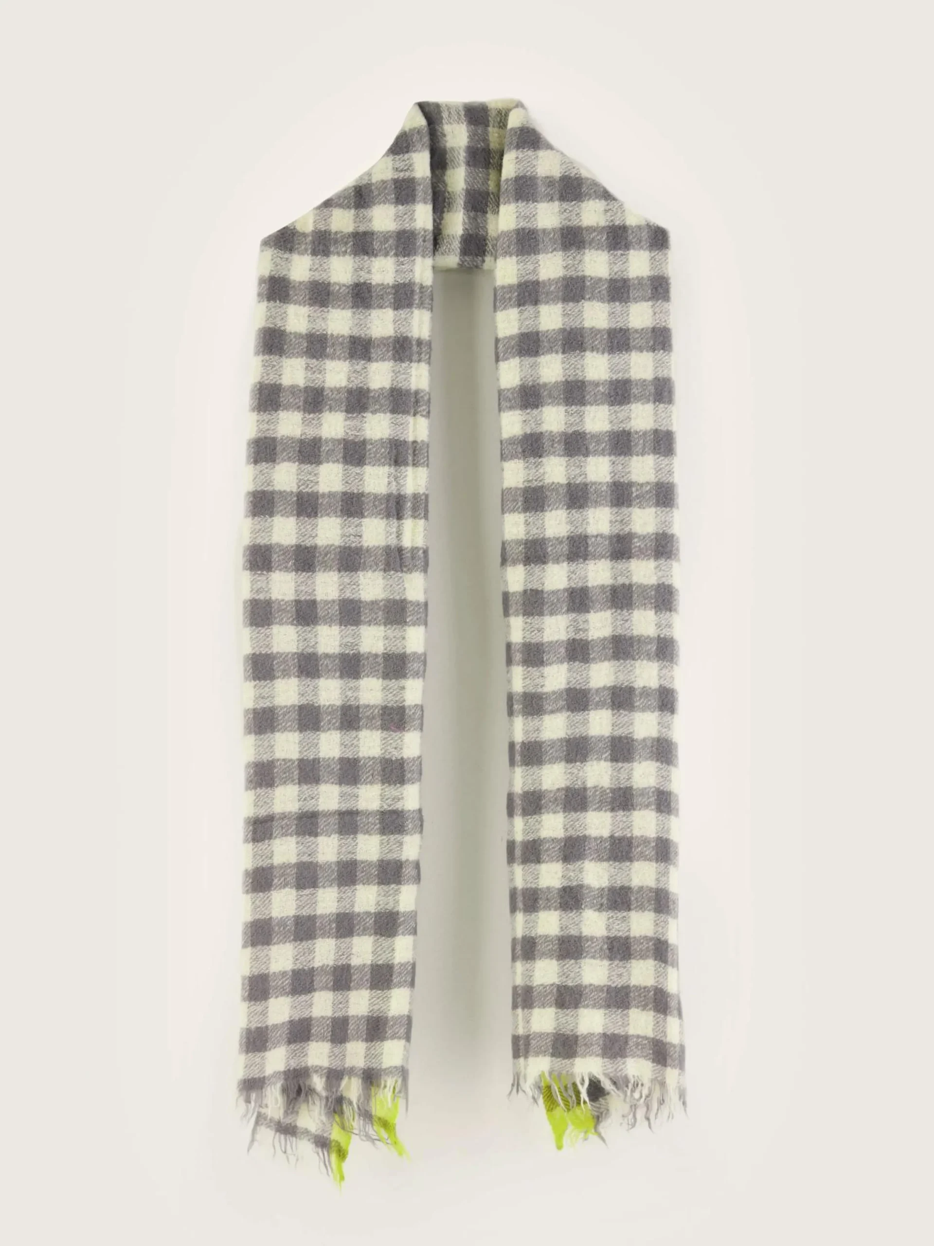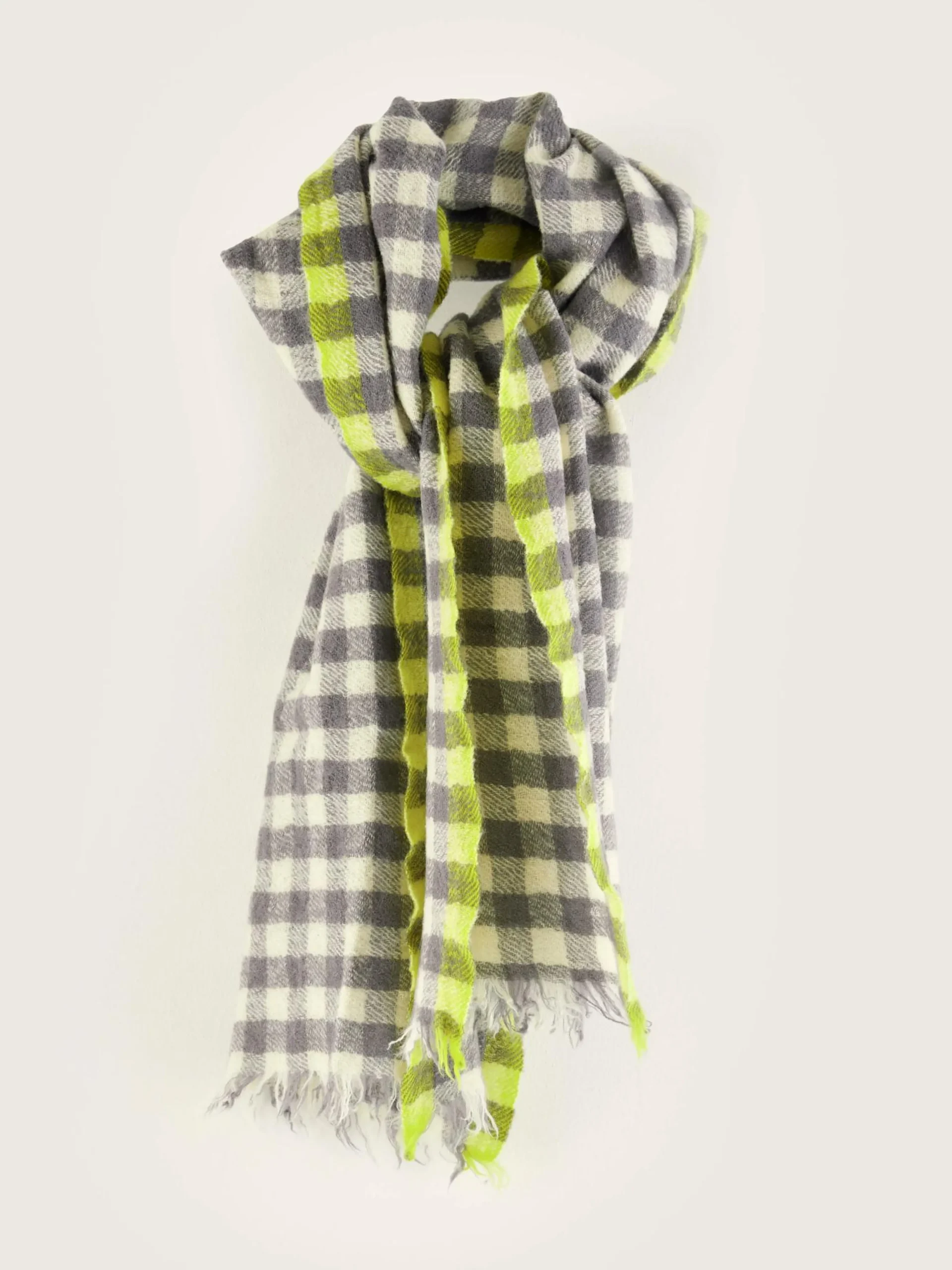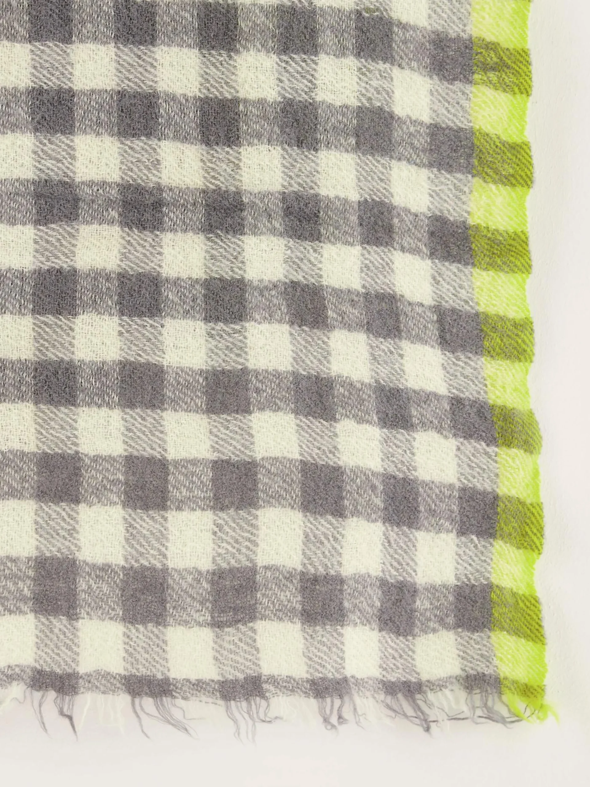 Geweven wollen sjaal met grijs ruitjespatroon.