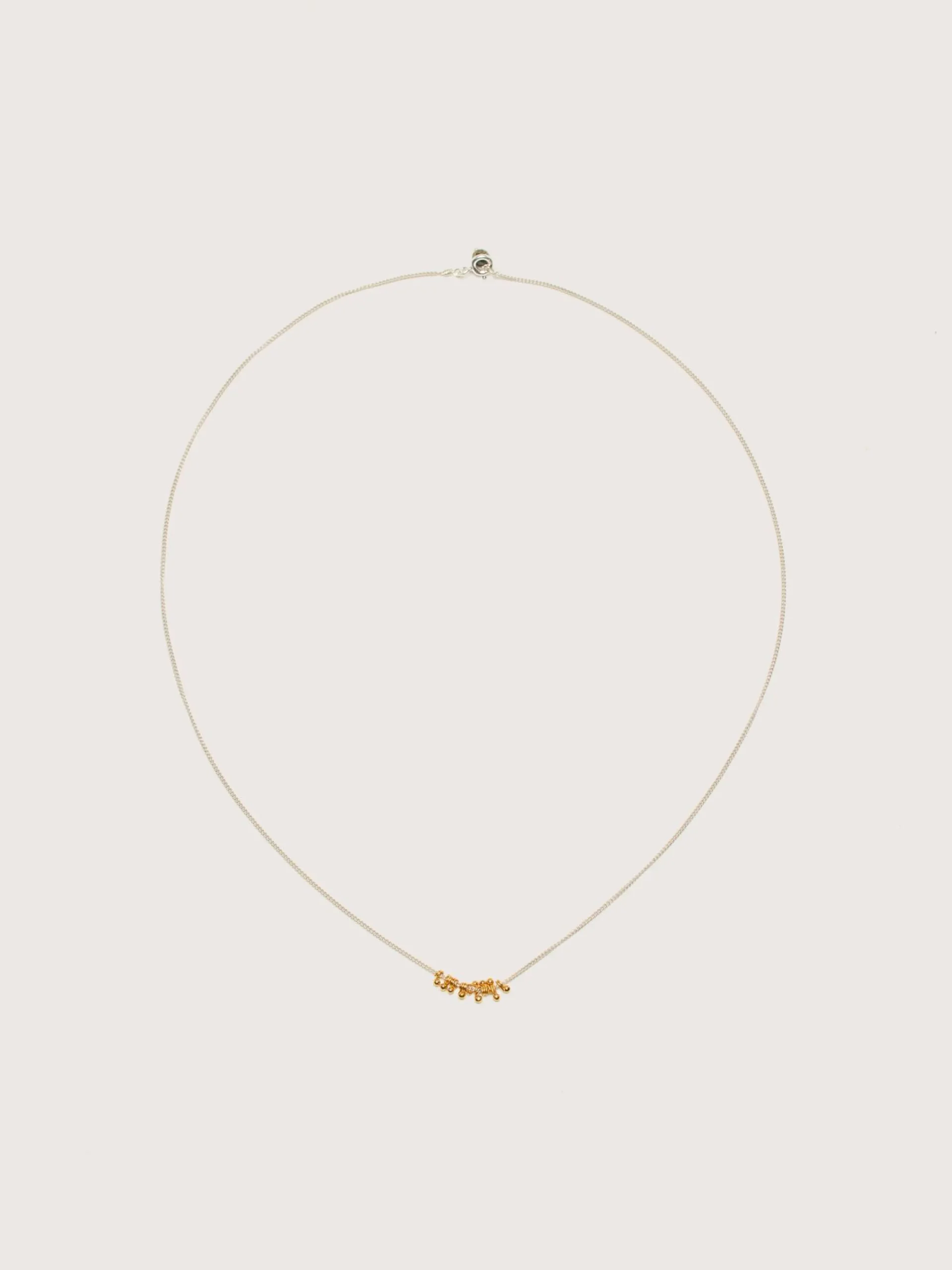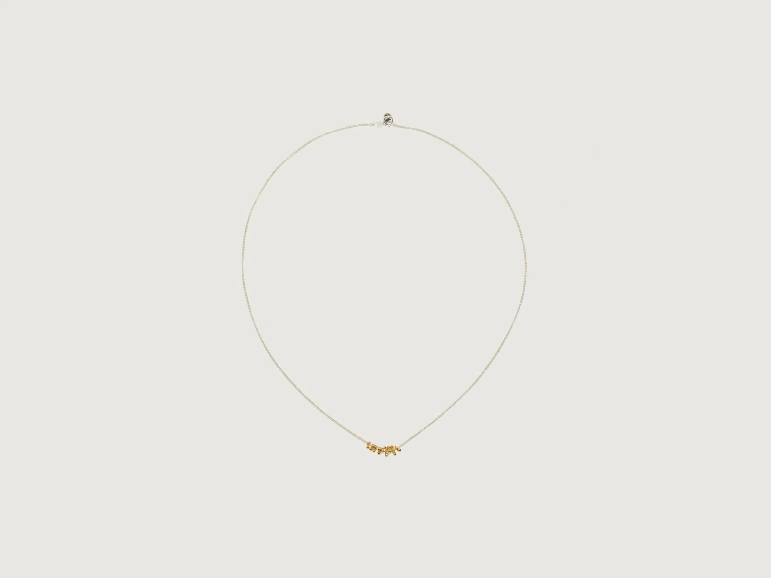 De GilberGilbert Bubble ketting is een lange zilveren ketting met gouden bolletjes.