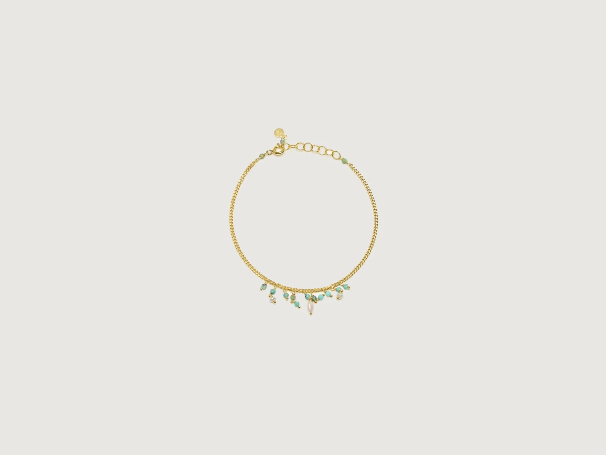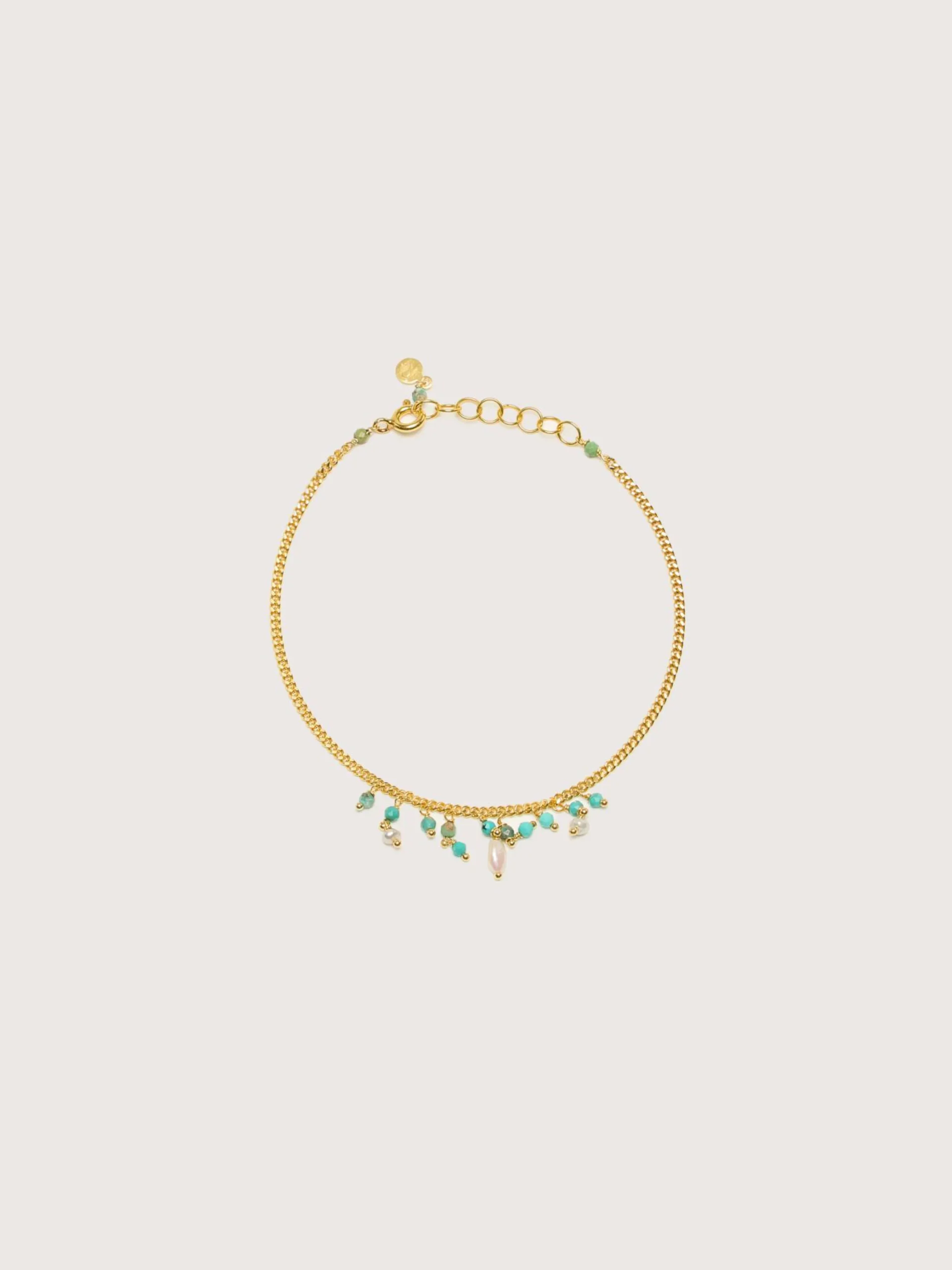 De Untitledition Acquadolce armband is een gouden vermeil micro schakel versierd met zoetwaterparels en turquoise stenen.