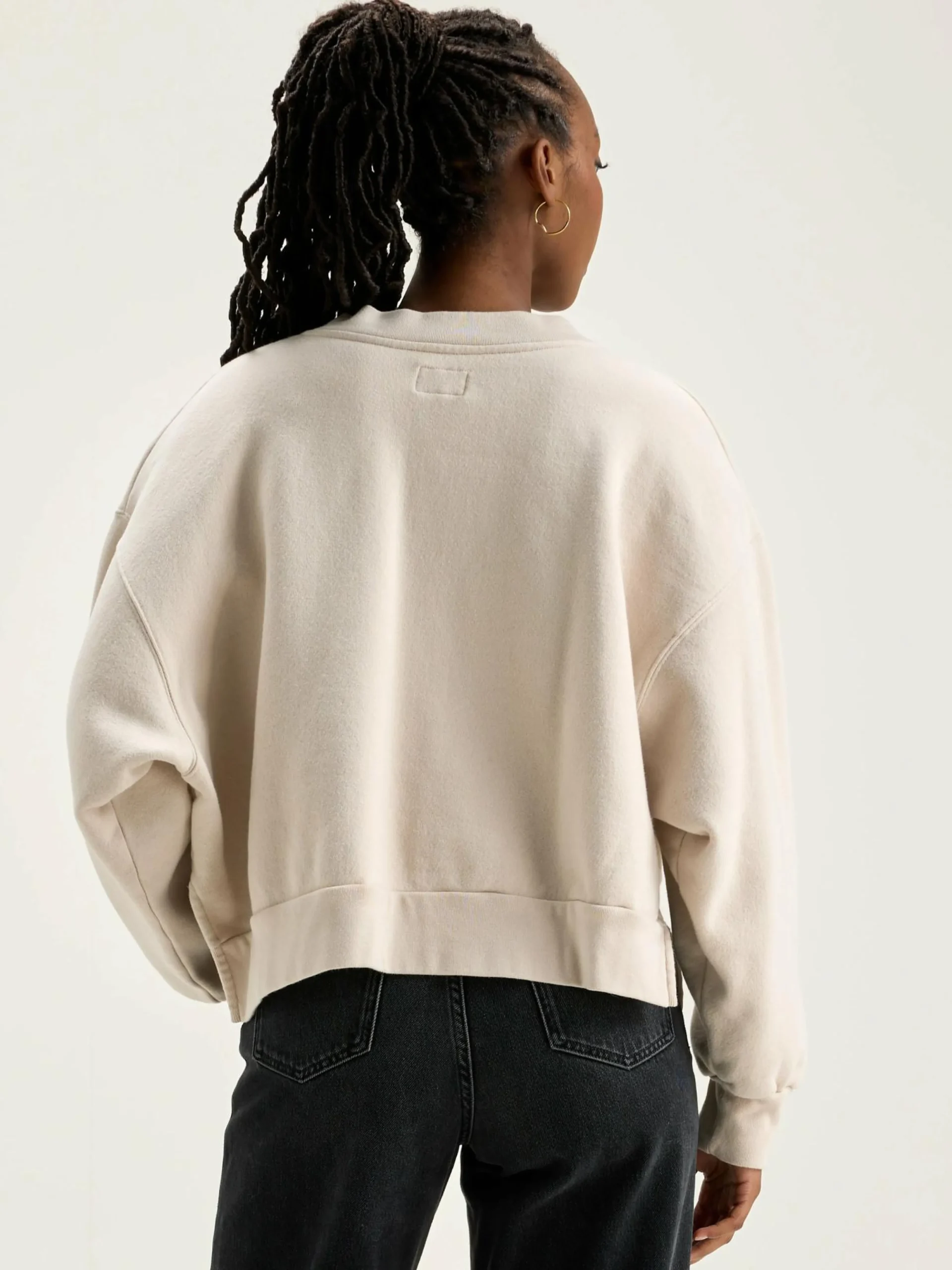 Ecru sweatshirt met V-hals, pofmouwen en zijsplitten.